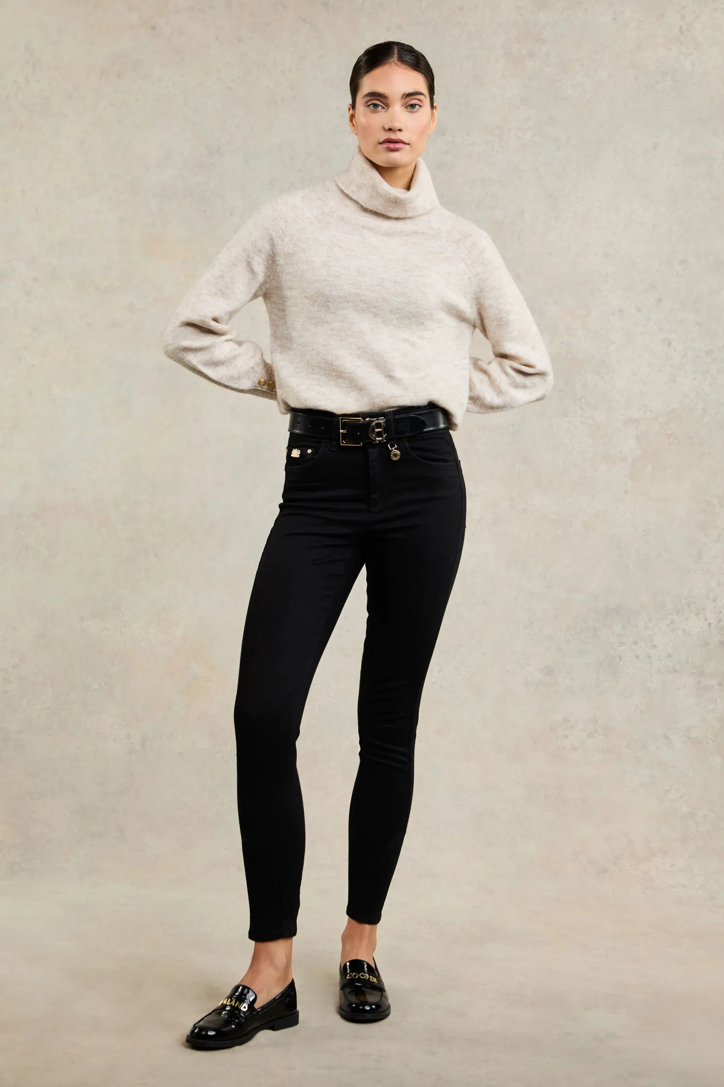 The latest edition to our jean collection, each pair has been woven with an ample amount of stretch to sculpt and flatter your silhouette. Created with Thermolite Polyester Yarns to trap air and hold warm, these jeans are a cold-weather essential. With an internal fleece lining, high waisted fit, and back pockets, the jeans have been detailed with our iconic hardware.