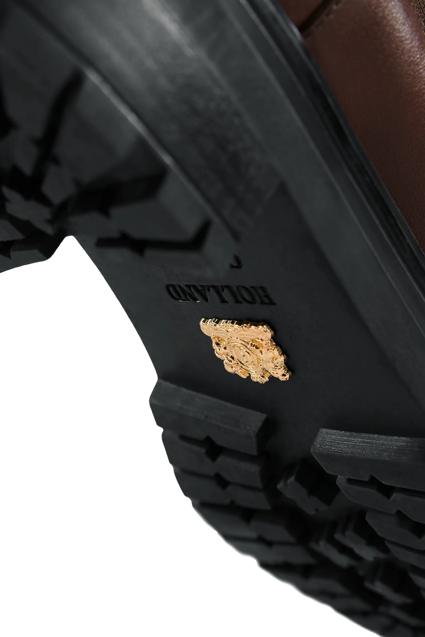 The epitome of minimalist chic, this classic knee boot has been inspired with a subtle touch of our equestrian heritage. Created from a premium leather with matching lining. Designed with a classic almond toe with a chunky tracked sole, this boot ensures a comfortable & stylish wear. Subtly detailed with a delicate HC pin.