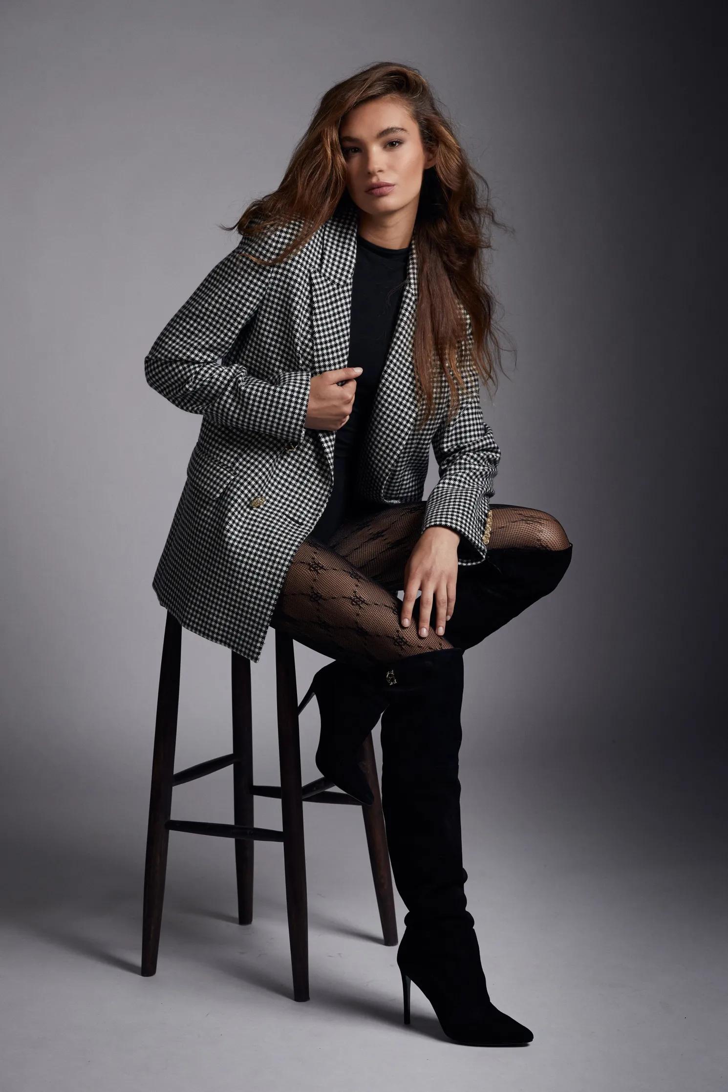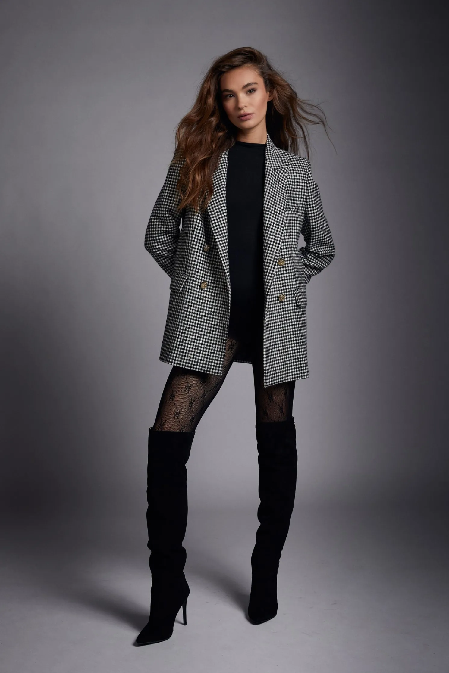 Hand-cut and made entirely in the UK, this blazer has been designed with a longline, double-breasted silhouette. Elegantly crafted to create a sharp tailored fit worn open or closed, it has peak lapels, subtle padded shoulders and is fully lined in satin for easy layering. Detailed with signature HC gold buttons on the front and cuffs.