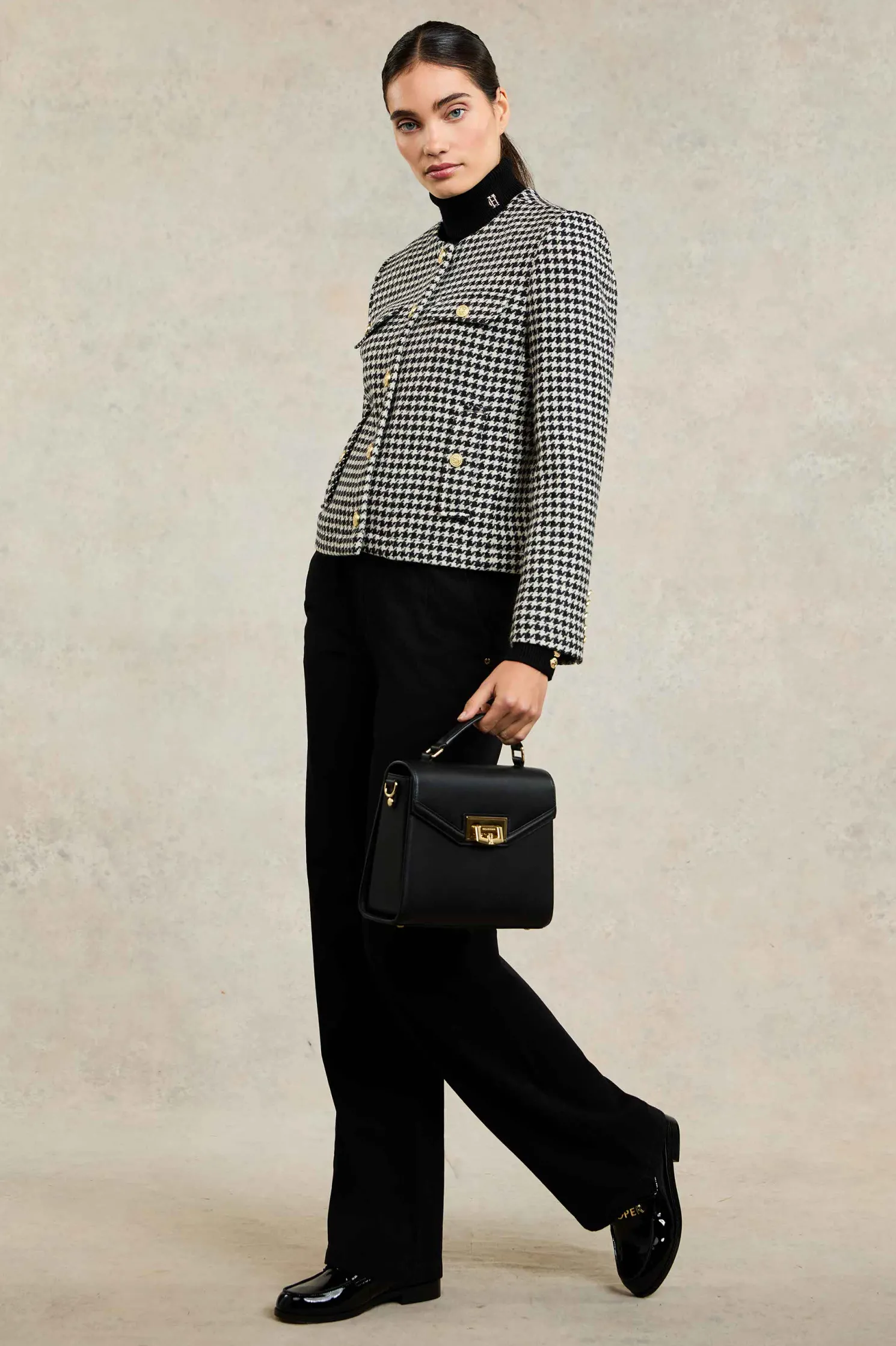 Perfectly blending a modern and vintage aesthetic, this jacket has been crafted with a slightly cropped, easy fit with articulated sleeves. The collarless feature adds a touch of versatility, making it the perfect pairing for shirts, dresses and high-neck tops. Bluff pockets on the chest with fictional pocket flaps, alongside lower side entry welt pockets, enhance its chic aesthetic. Finished with our signature Holland Cooper gold hardware, this jacket seamlessly blends timeless elegance with contemporary flair.