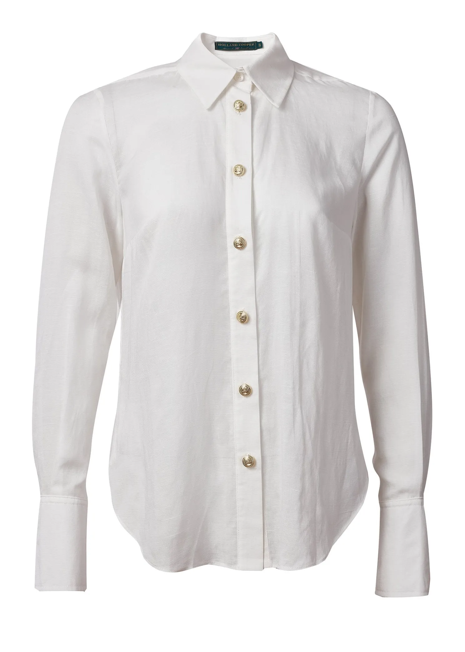 A beautifully relaxed fitting classic shirt, perfect for every womans wardrobe, this piece has been elegantly designed with french interior seams and pleated back for volume. Detailed with a single button cuff and signature metal hardware, this shirt is both timeless and versatile.
