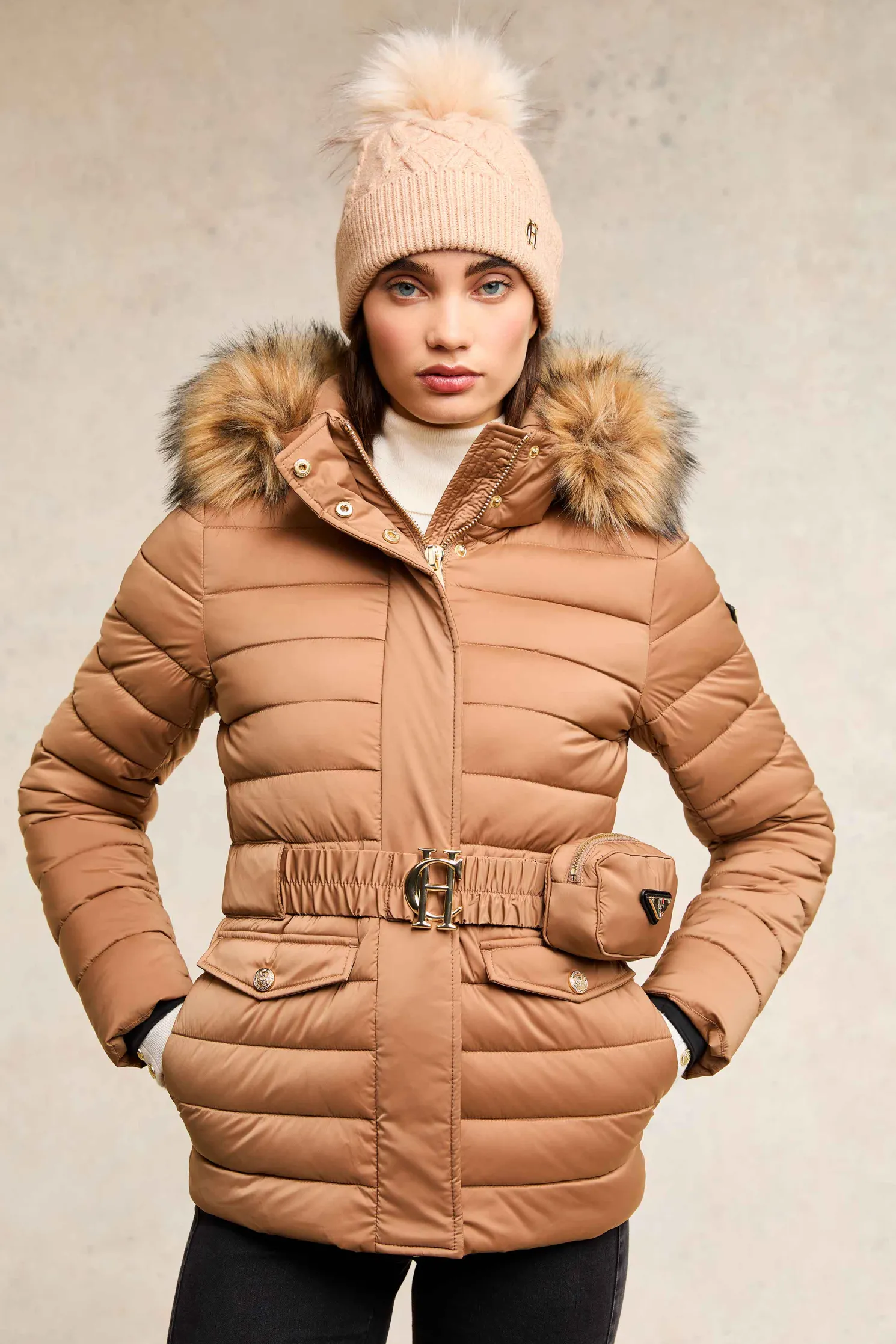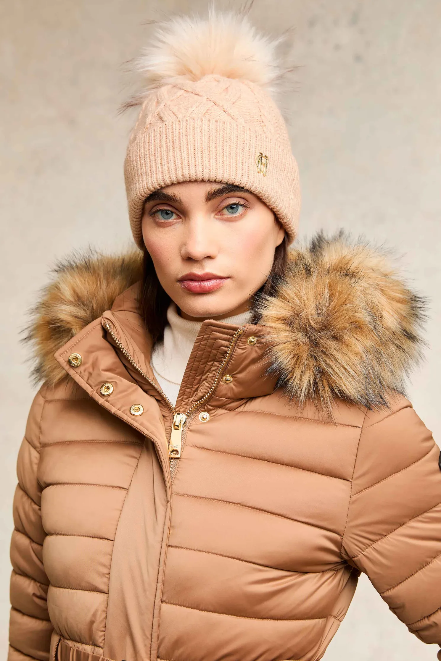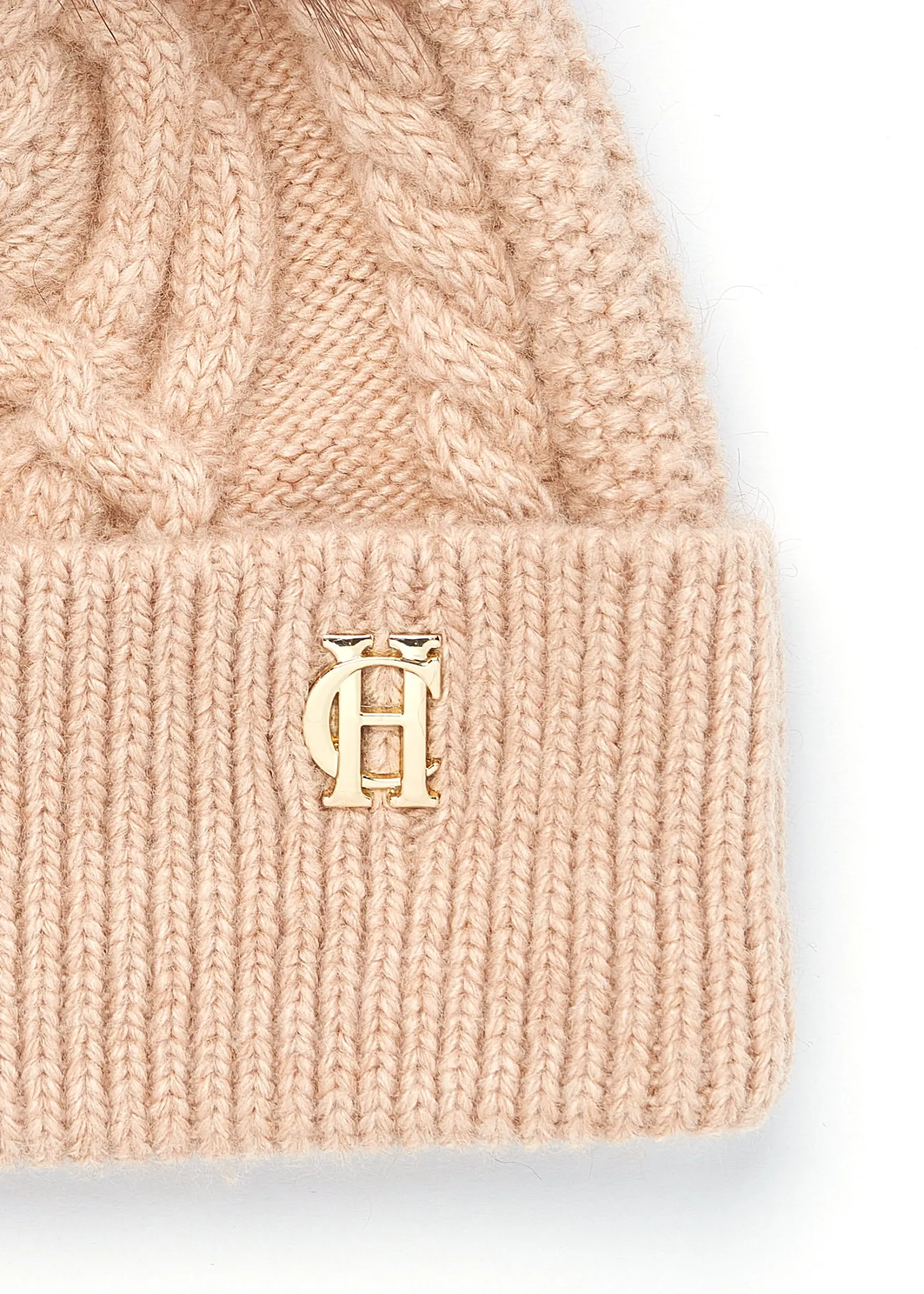 Elevated in seasonal colours, this hat has been crafted from a delicate & subtle yarn. Designed with a luxurious detachable bobble crafted from faux fur. Created with a cable knit aesthetic & detailed with a subtle HC pin finish.