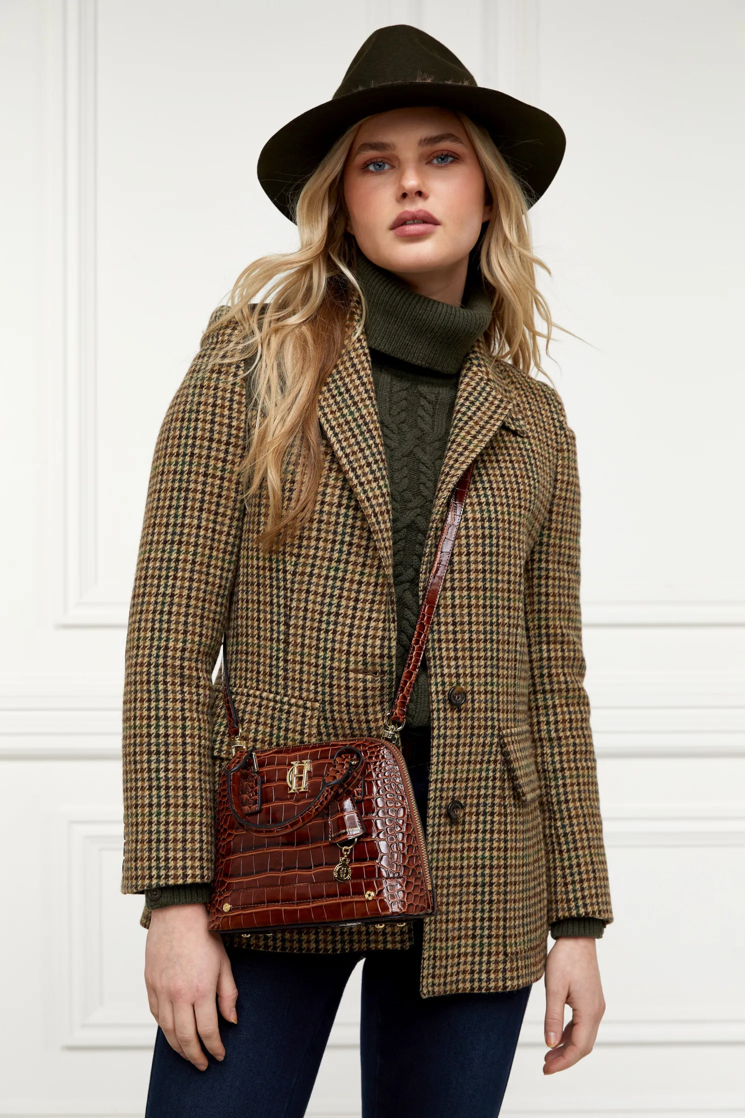 The ribbed roll neck collar provides a snug and flattering fit, ensuring you stay warm and stylish in any setting. The classic cable knit pattern weaves a touch of tradition into this practical piece, making it a versatile addition to any wardrobe. The dark brown shoulder and elbow patches add a distinctive country-inspired aesthetic. Complimenting these patches are the elegant horn buttons, which add a touch of rustic sophistication to the overall design.