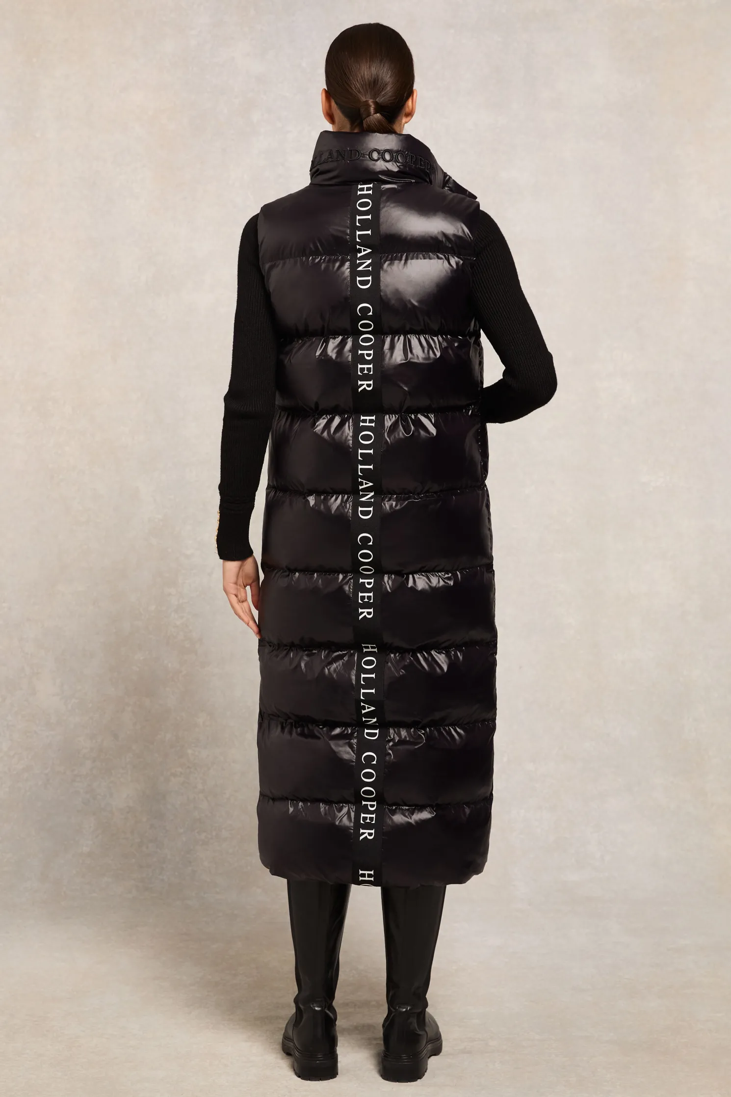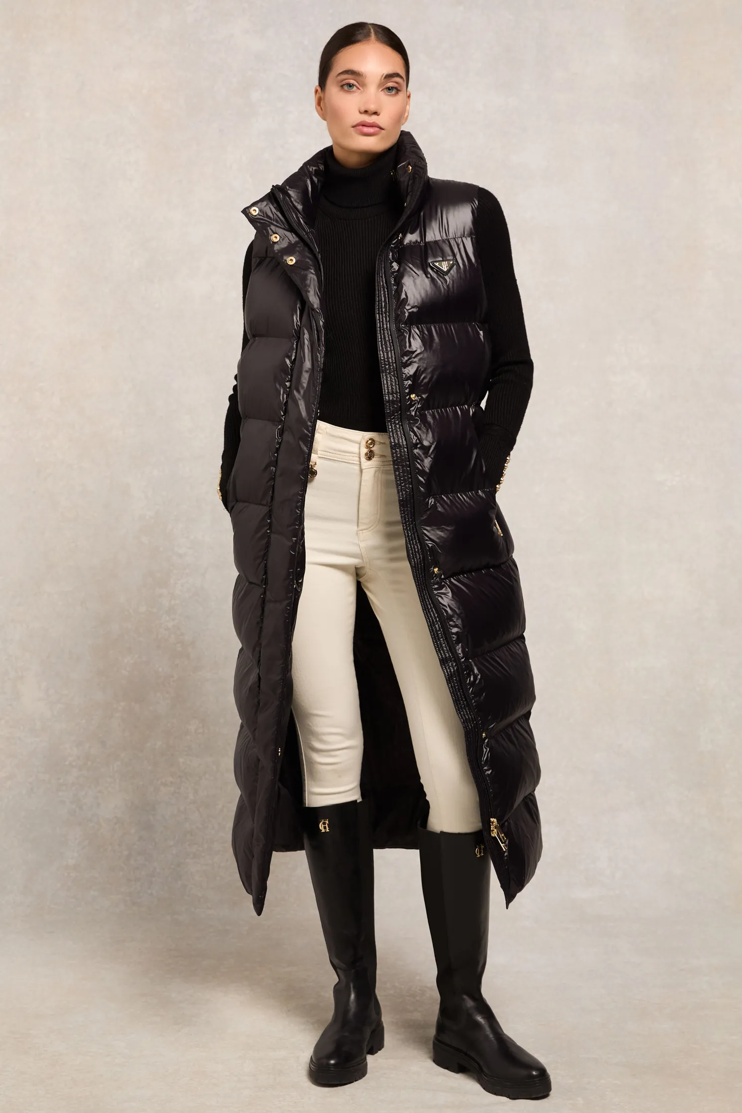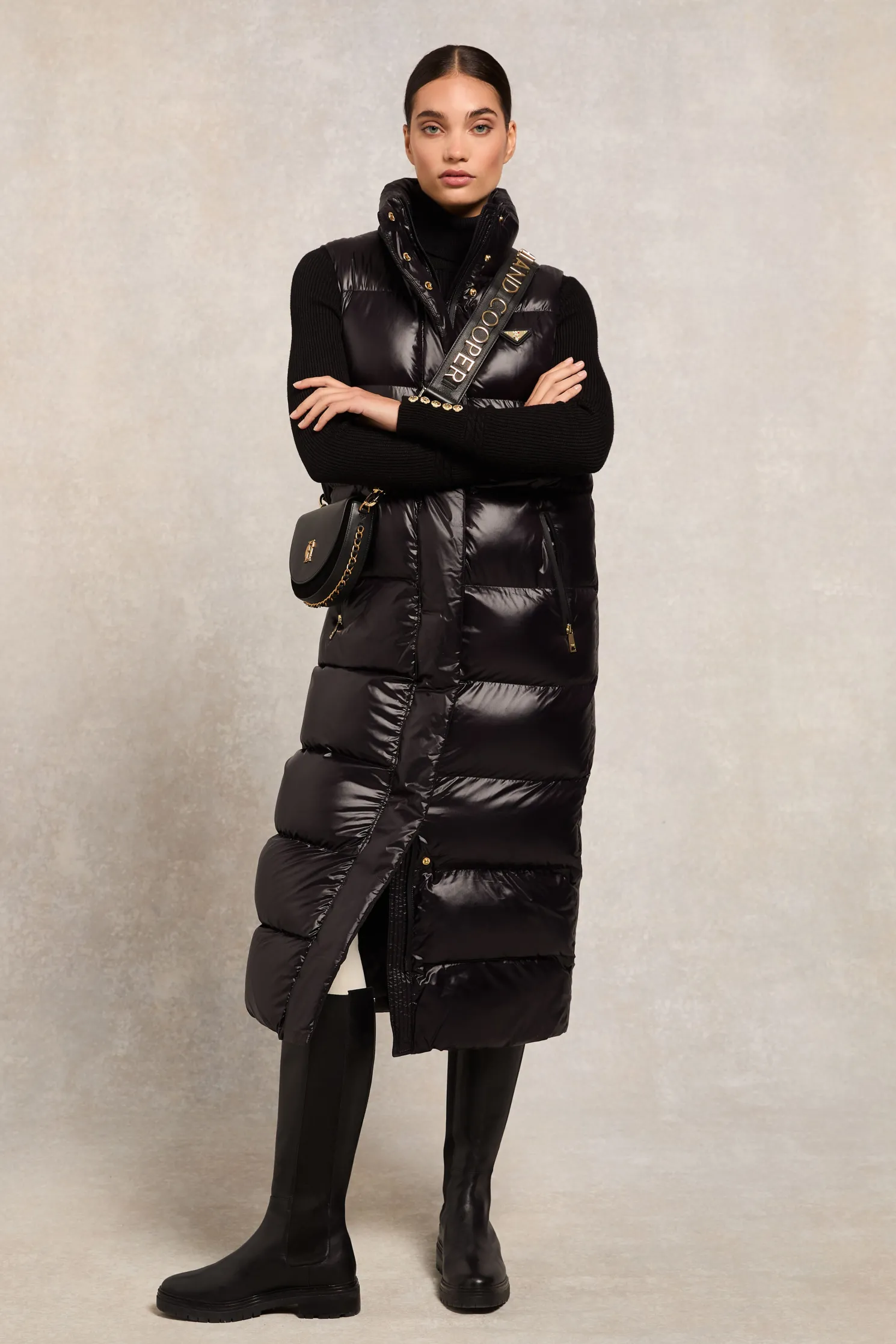 The Crawford Longline Gilet redefines contemporary outerwear with its sleek long length and padded design. Fitting narrowly at the shoulders and easing into a looser silhouette through the body and hips, it offers a versatile fit that balances between oversized and slim styles. Made from premium textured crinkle nylon with a contemporary square baffle detail, it’s generously filled with recycled polyester eco fill for warmth. Finished with matte black metal hardware and subtle pocketing, this gilet combines modern sophistication with eco-friendly materials