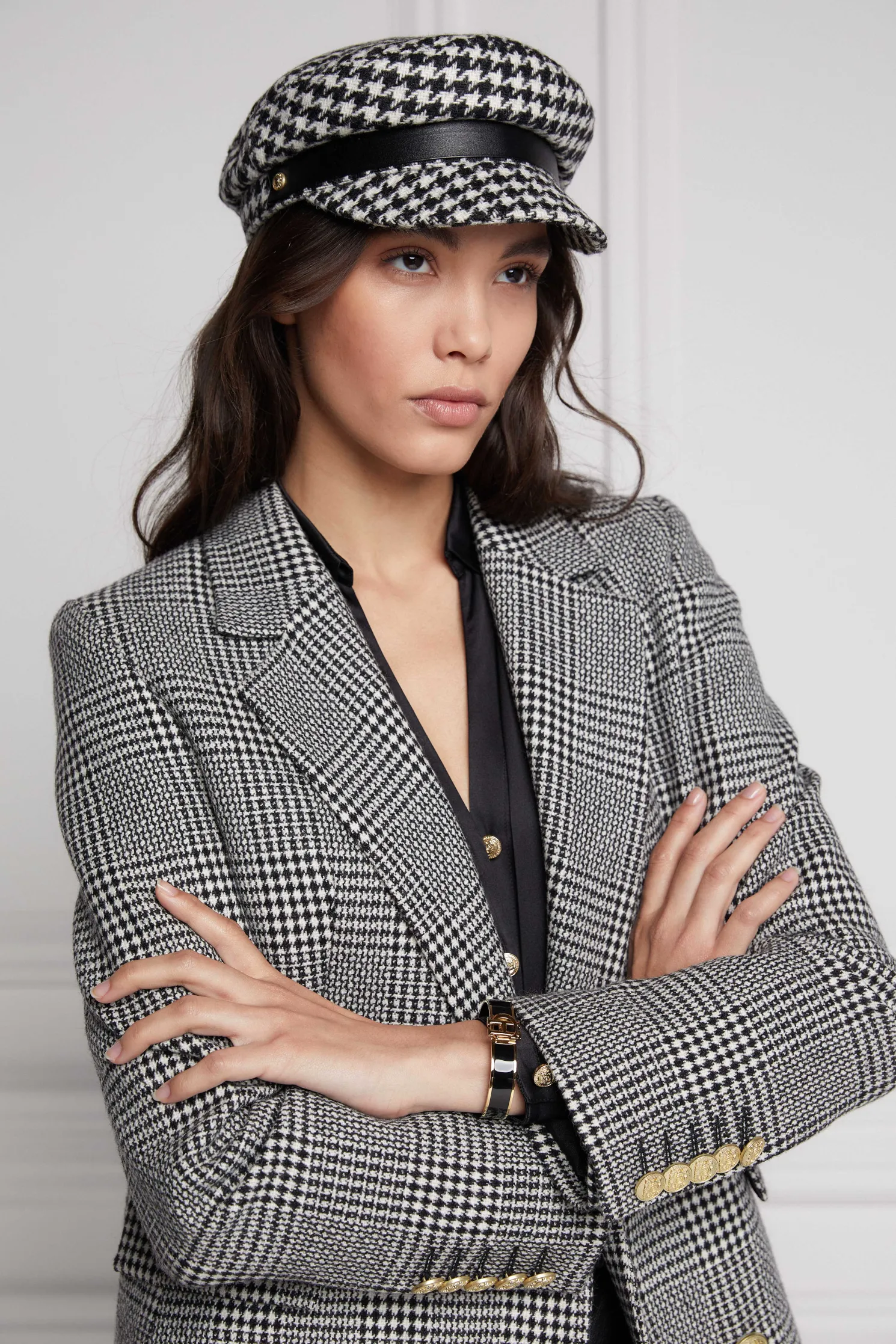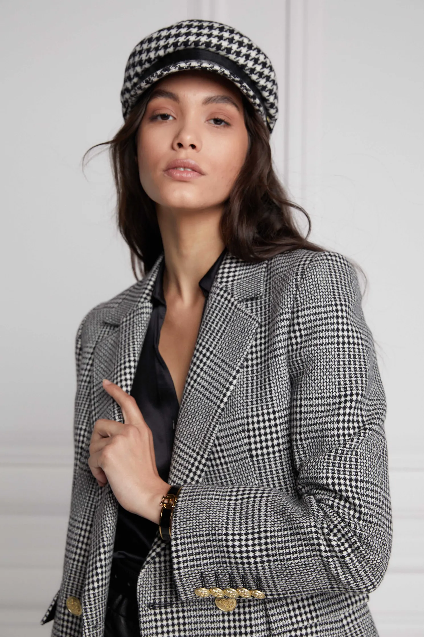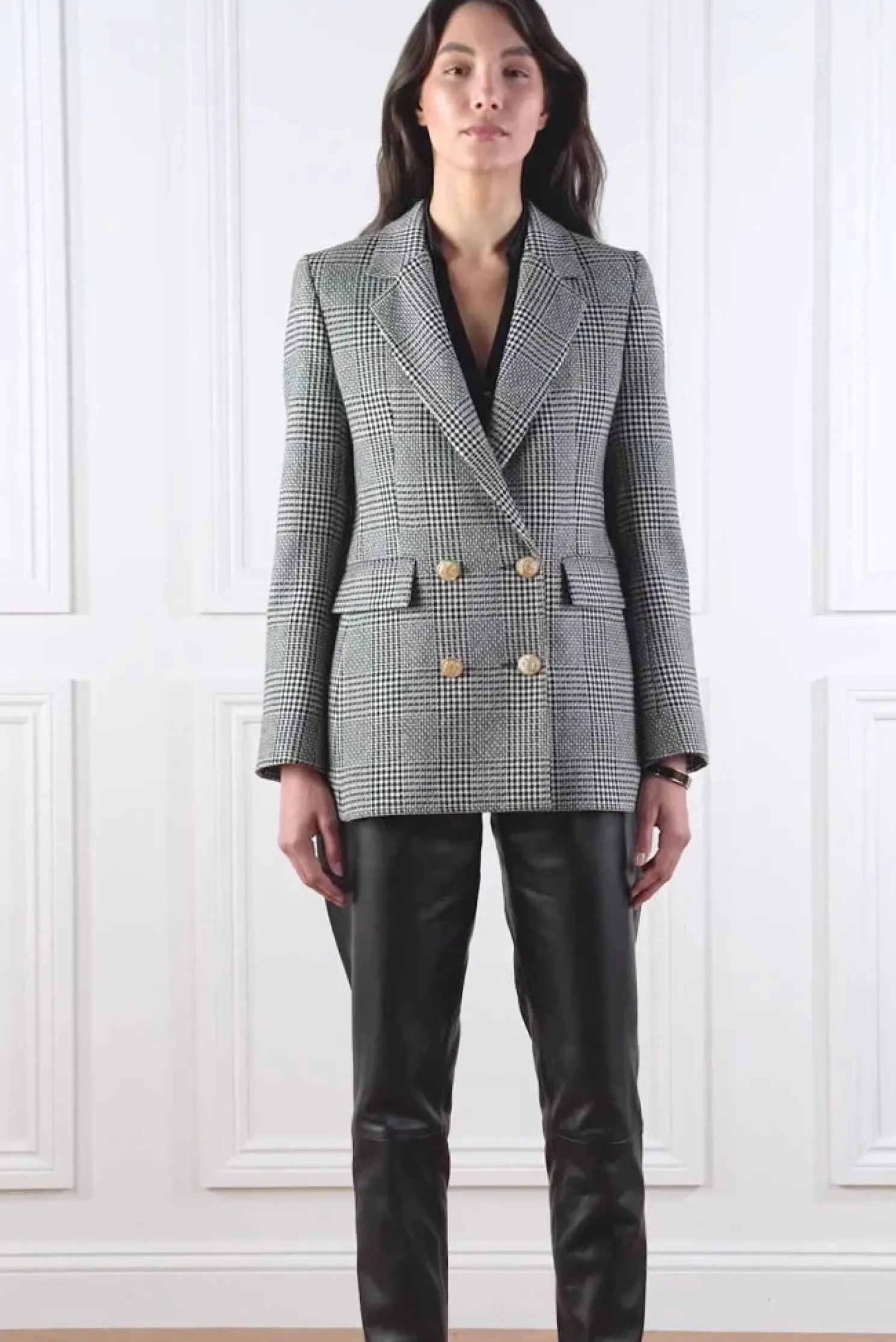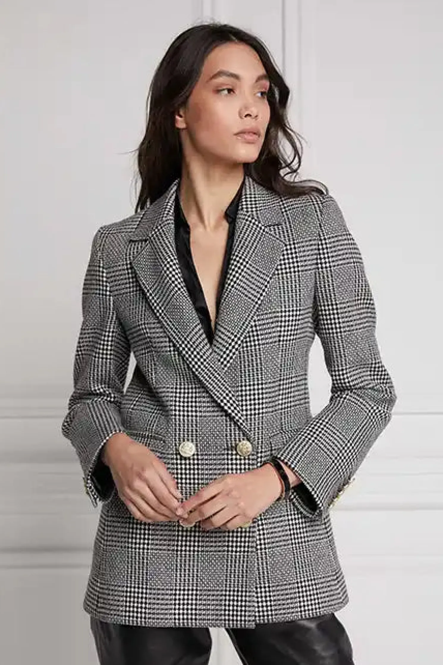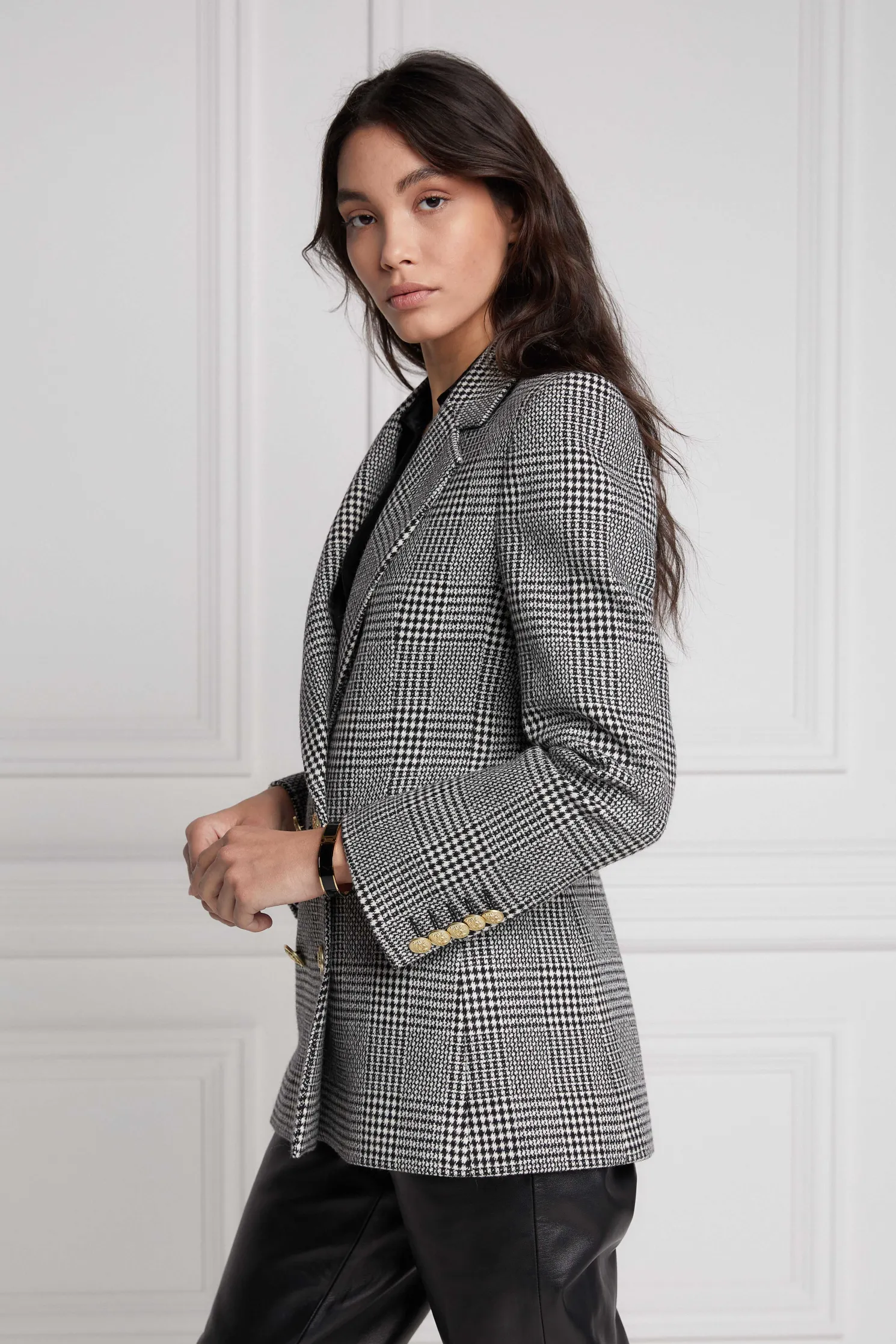 This longline double breasted wool blazer is a chic trans-seasonal forever wardrobe essential. Designed to create a sharp tailored silhouette worn open or closed. Fully lined with a luxury stretch lining for extra comfort and adorned with HC signature Gold buttons on the front and cuffs. This blazer has been hand cut and made entirely in England using wools woven in the UK.