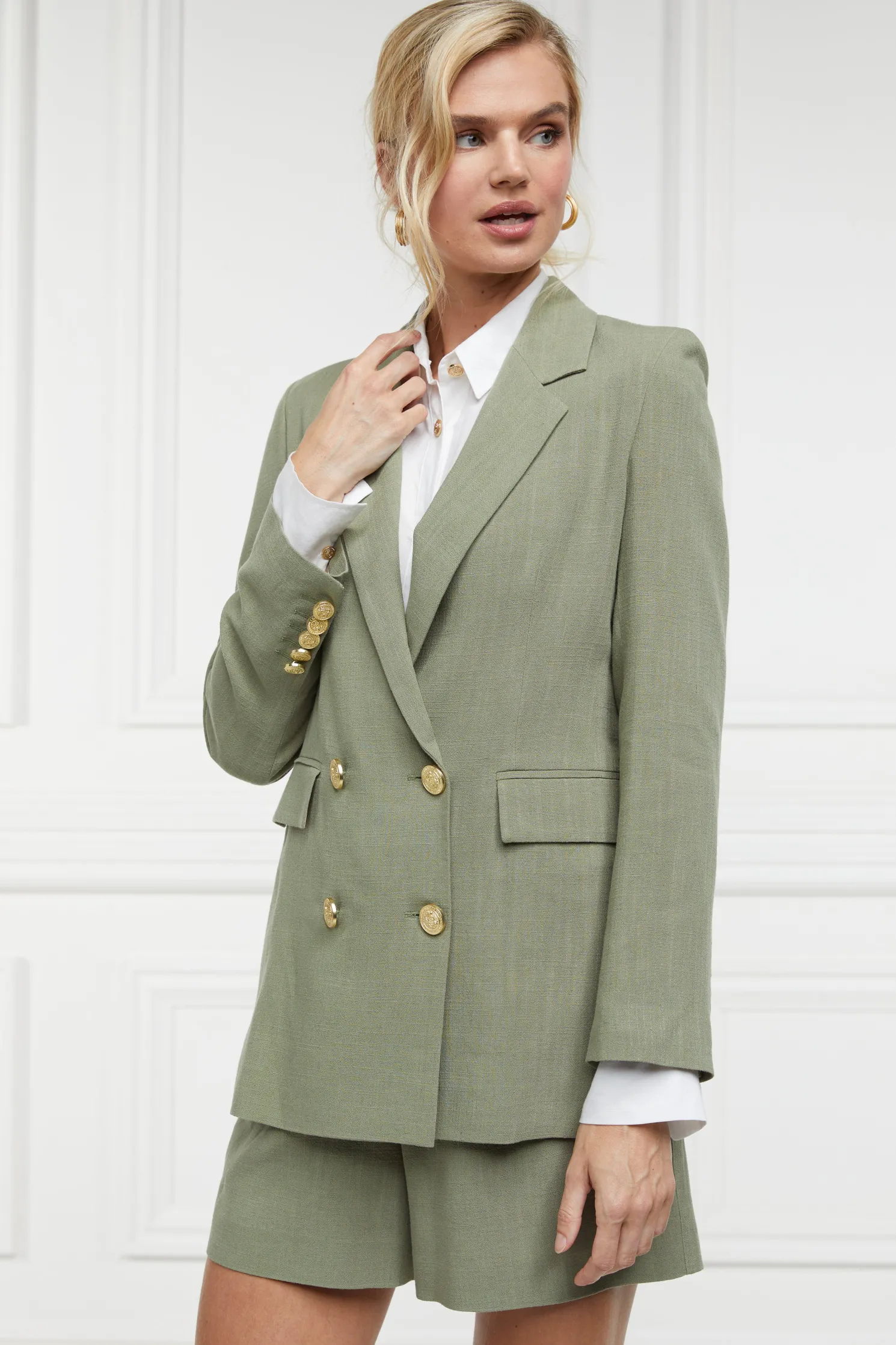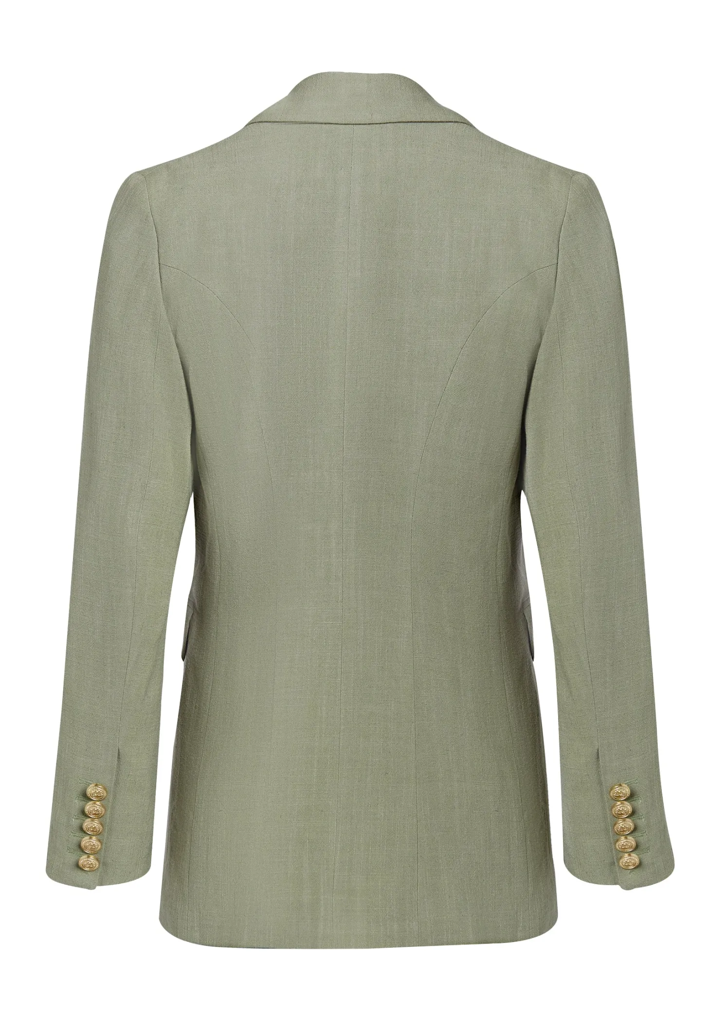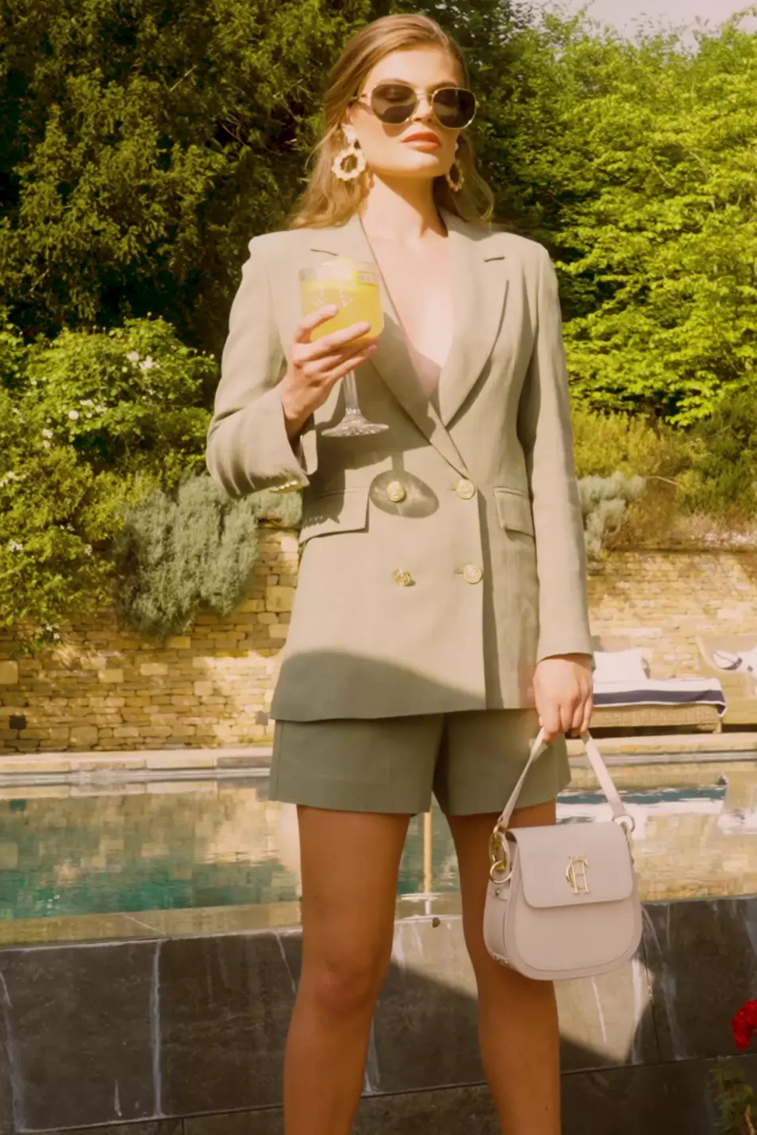 Designed to create a sharp tailored silhouette worn open or closed, the Double Breasted Linen Blazer has been handmade in the UK. Crafted from a crease-resistant, lightweight and breathable linen blend & fully lined with a luxury stretch lining for extra comfort, this piece is a must-have for your summer wardrobe. Elevated with our signature gold hardware to the front and cuffs, the elegant colour makes for a feminine and contemporary statement. Wear yours with jeans or pair with our matching Tailored Shorts.