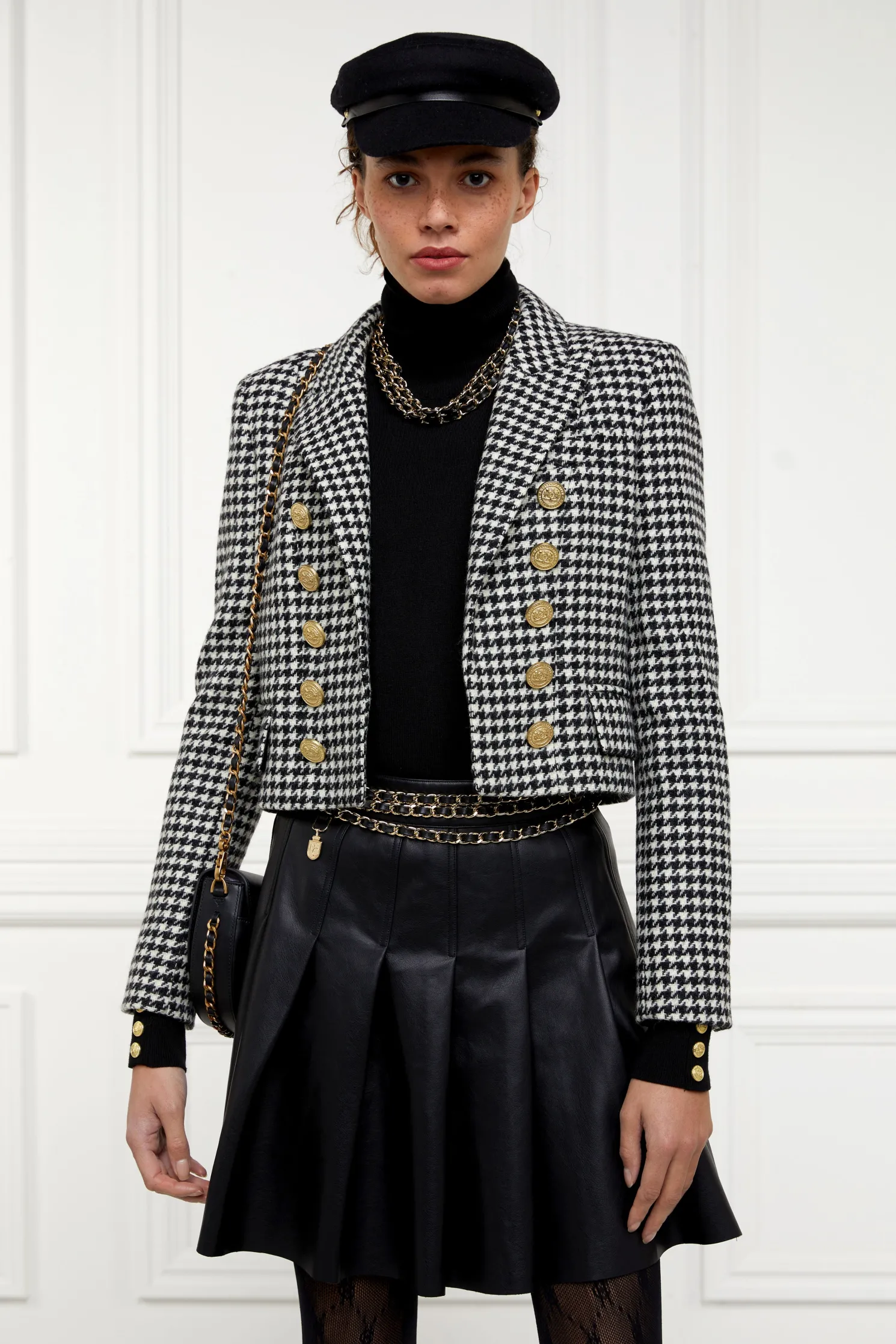 Introducing our vintage-inspired pleated mini skirt, a chic and modern twist on a timeless classic. This mini skirt features elegant knife pleats all around, offering a playful yet sophisticated silhouette. Crafted from super supple and soft faux leather fabric with a refined grain effect, it provides luxurious comfort and style. The extra thick leather topstitching adds durability and a touch of boldness, while the signature gold metal hardware elevates the overall design. Perfect for making a statement, this skirt is a versatile piece that seamlessly blends vintage charm with a modern edge.