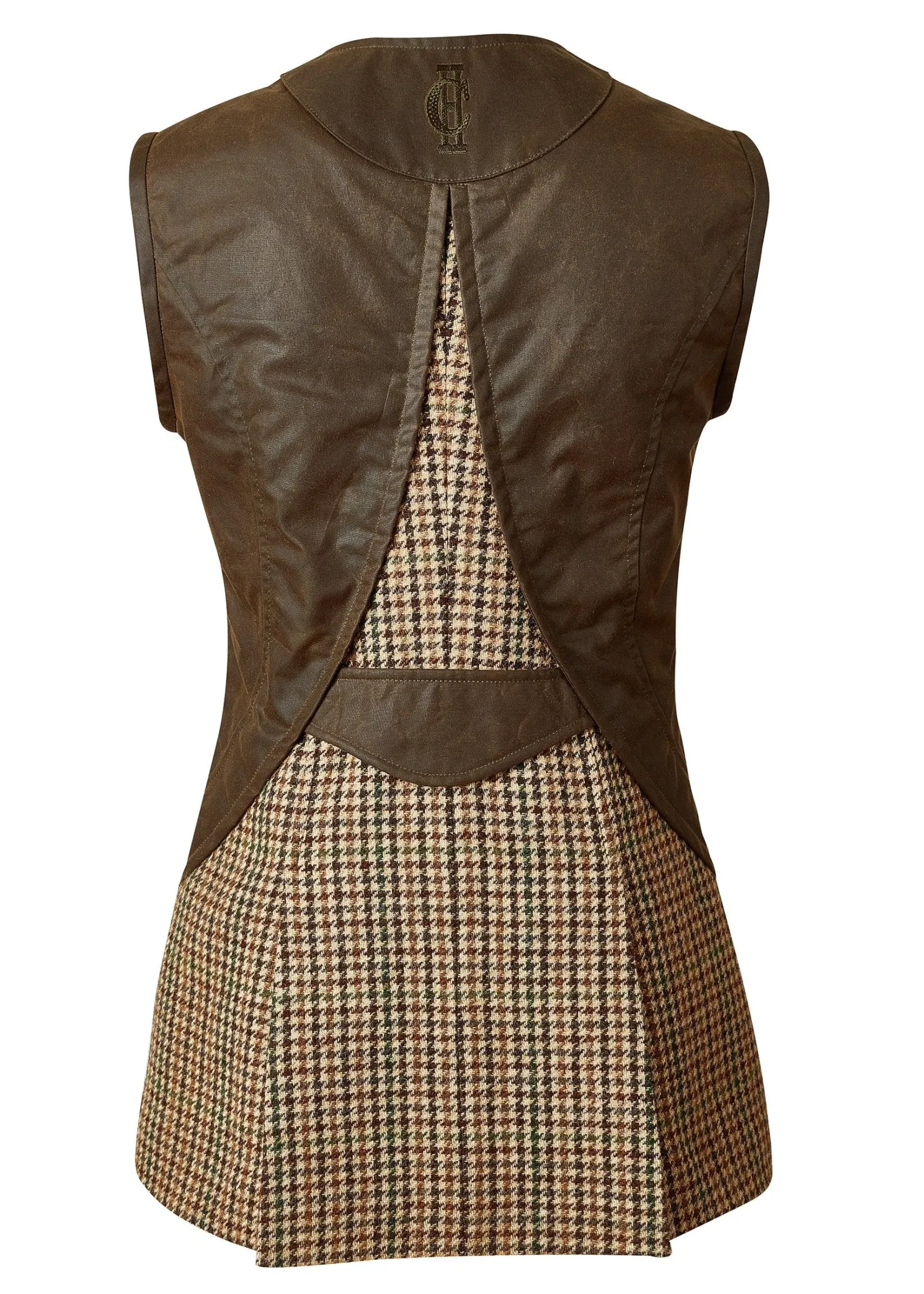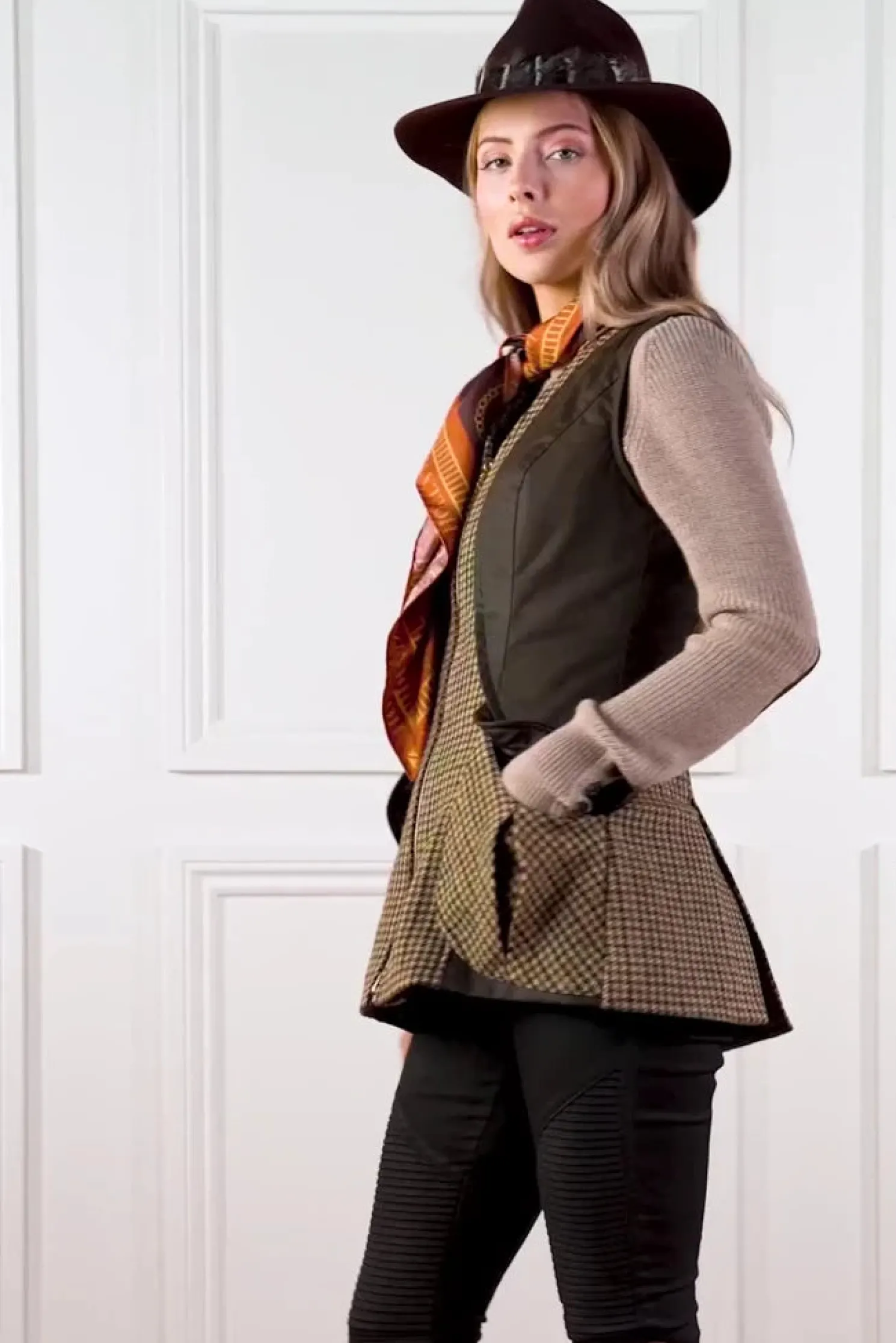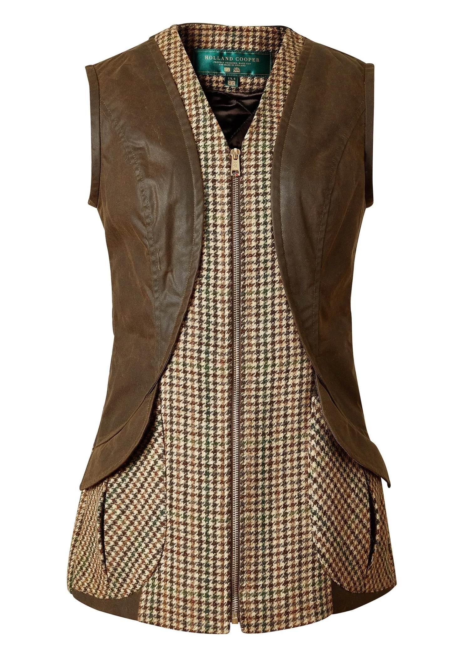 This is a modern, ultra-feminine and sophisticated version of a traditional field-style vest. Curated from durable, British-made wool and trimmed with British Millerain Wax. Complete with deep bellow-style pockets, a quilted lining for extra warmth and central front zip. Wear it solo or layered over one of our knitwear pieces. This coat has been proudly hand cut and made in England.
