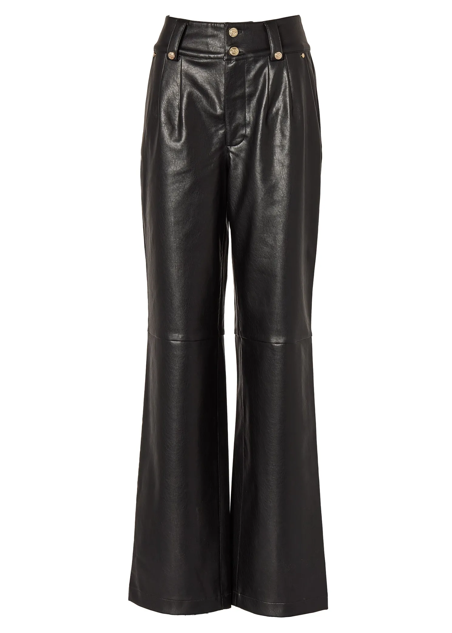 Our high-waisted PU trousers are a sophisticated addition to your wardrobe. Featuring a high-rise waist and a straight, loose-fit leg, offering a chic and modern silhouette. The pleated front adds a touch of femininity and fluidity, while the deep, flattering waistband ensures a comfortable and secure fit. Crafted from soft and subtle faux leather, these trousers provide a luxurious look and feel. Adorned with our signature gold hardware, they can elevate any outfit. Perfect for any occasion, these trousers combine style and comfort effortlessly.