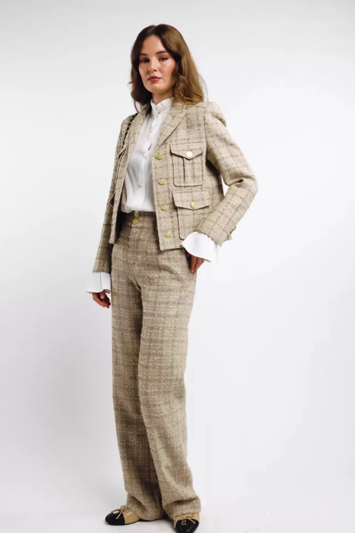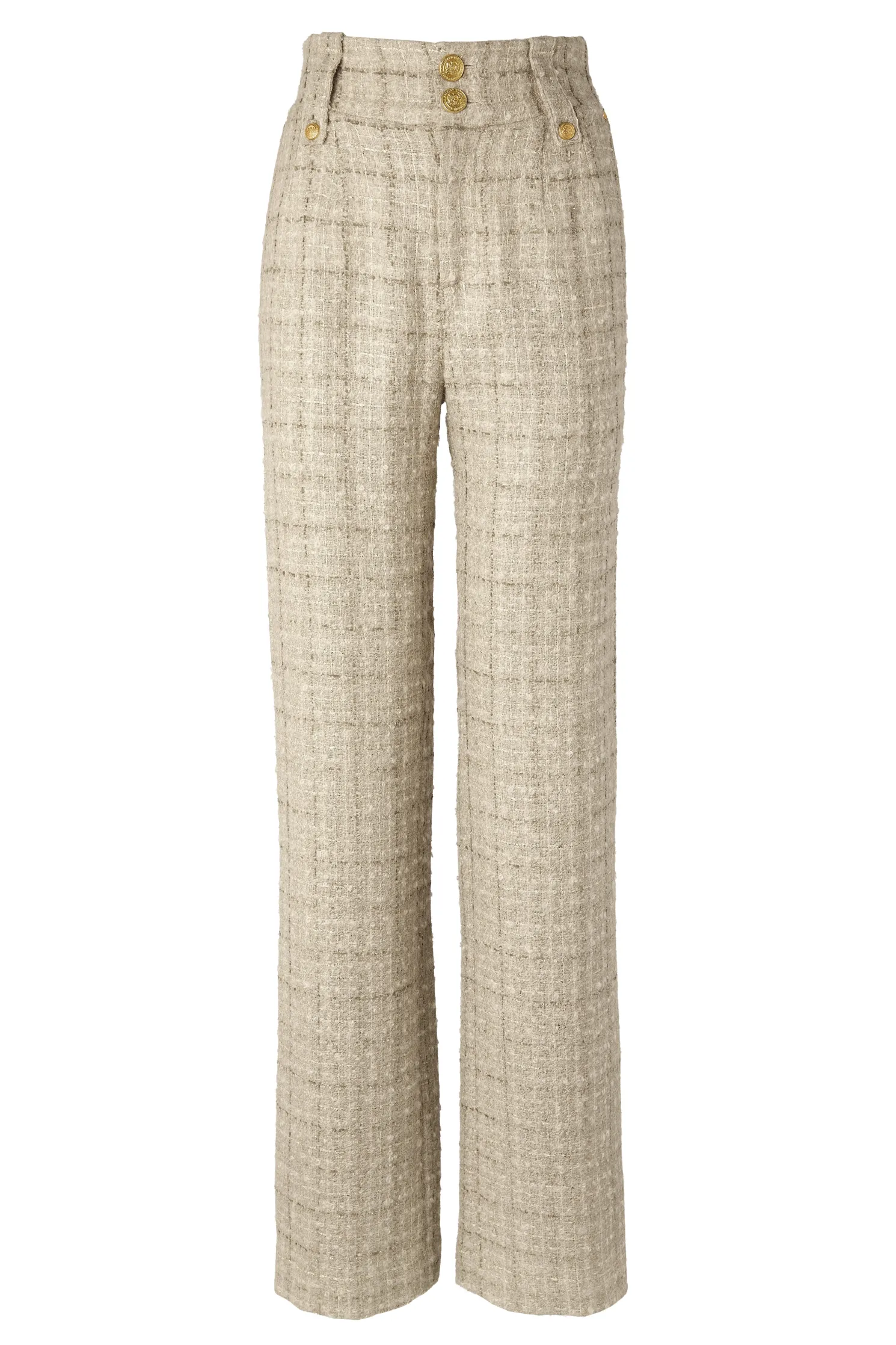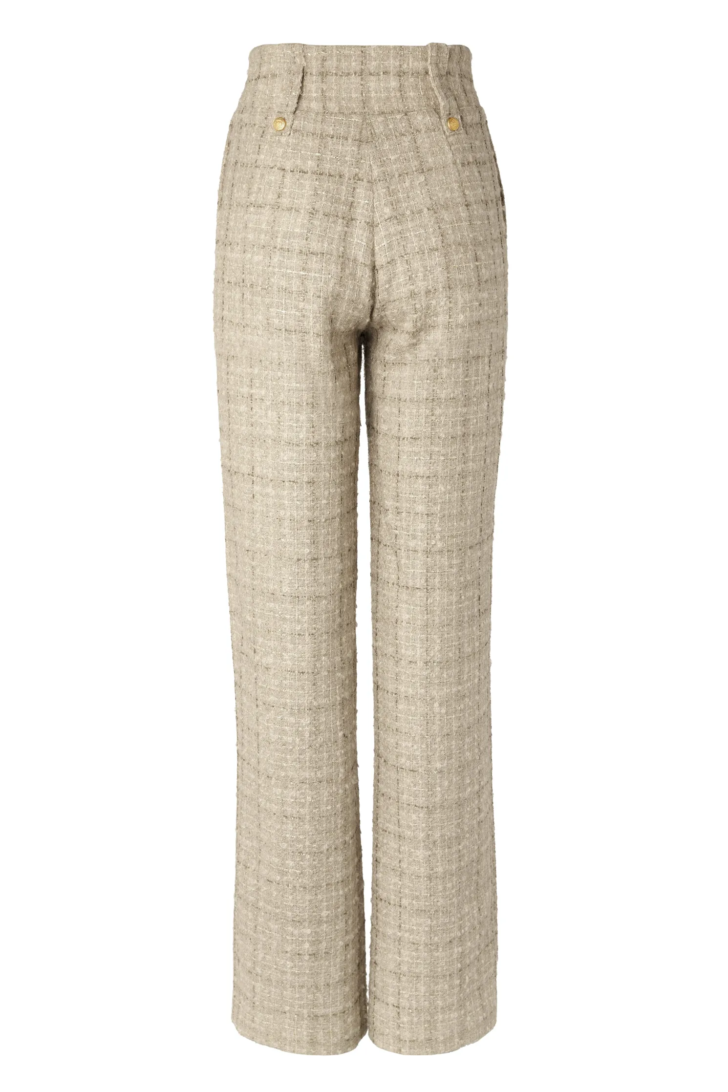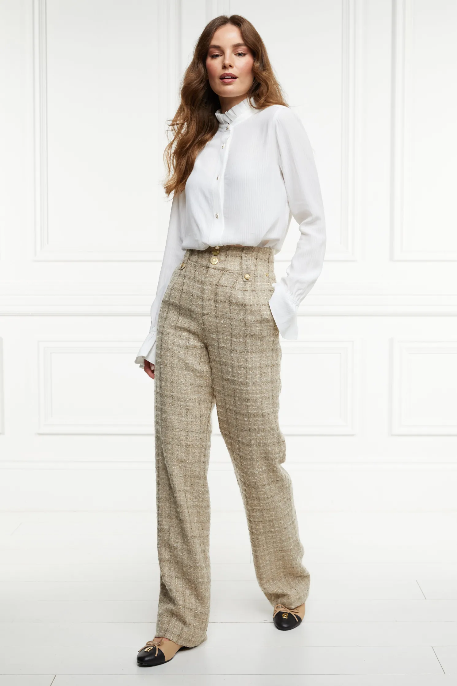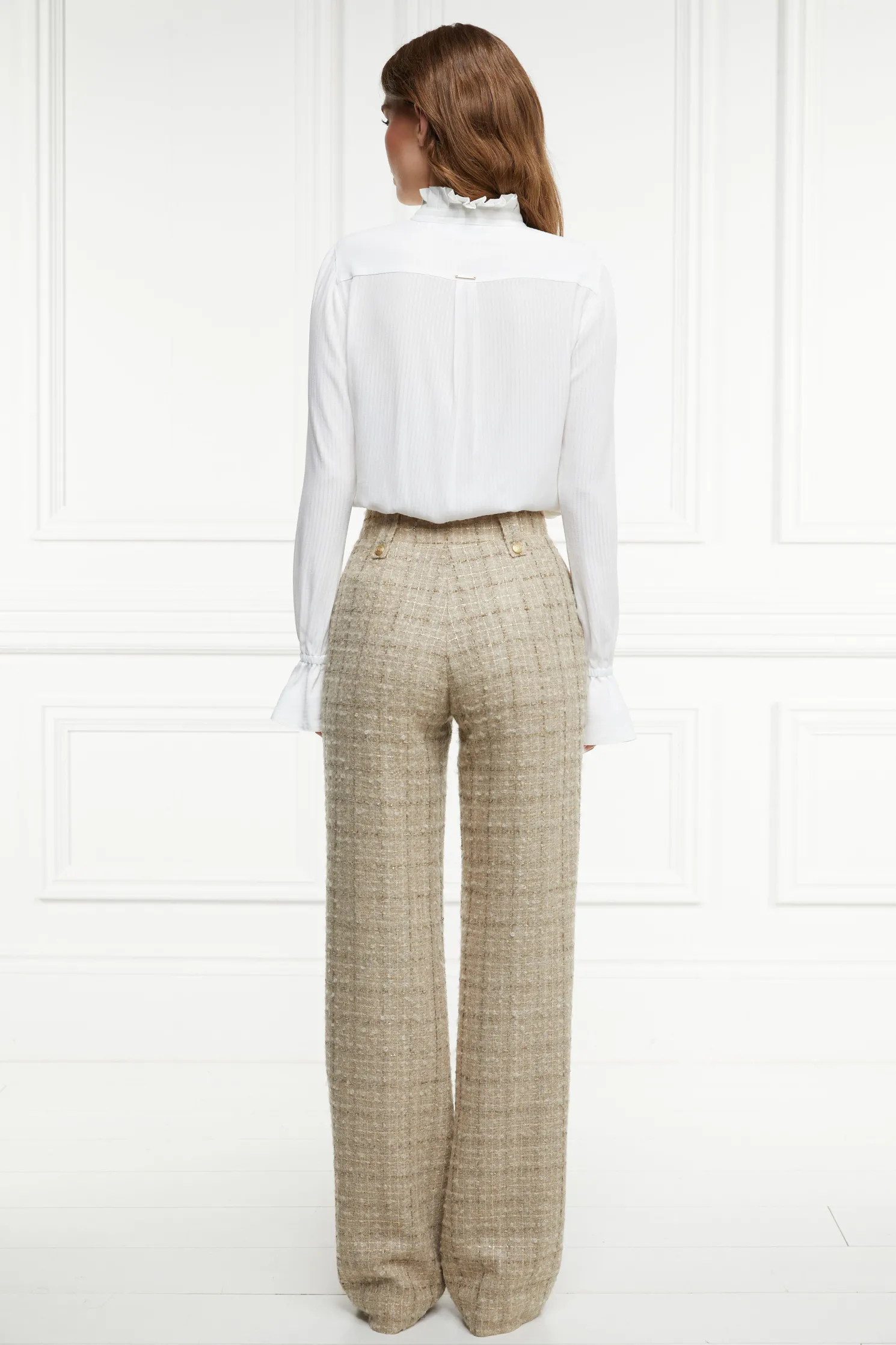 Simple and refined, these straight-leg trousers are the perfect balance of smart and casual that effortlessly take you from day to night. Made from a luxurious wool blend that’s fully lined, these trousers sit high on the waist with a wide waistband to create a flattering silhouette that suits all body shapes. Featuring two large side pockets and adorned with our iconic gold hardware for an added touch of luxury. These trousers have been hand cut and made in England using wool woven in the UK.