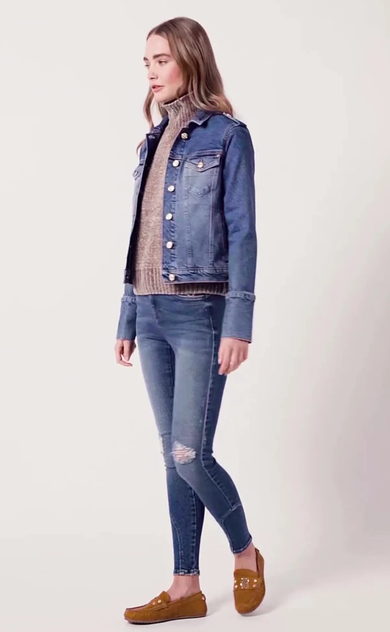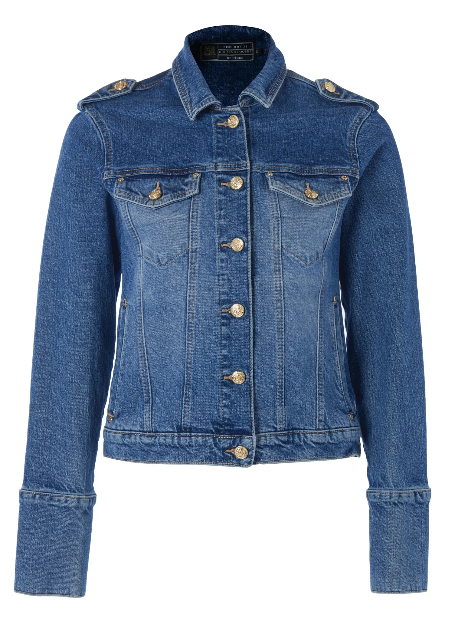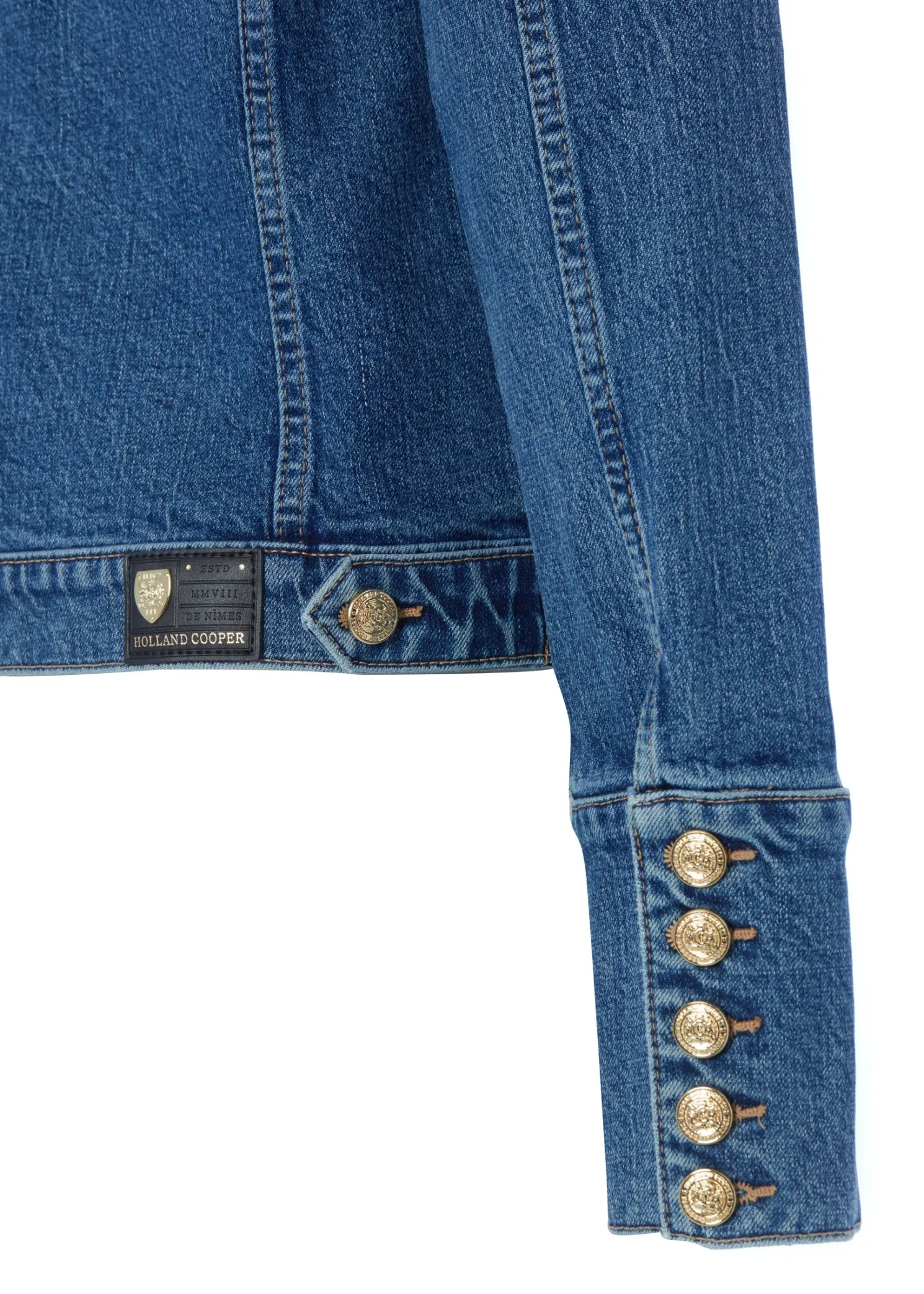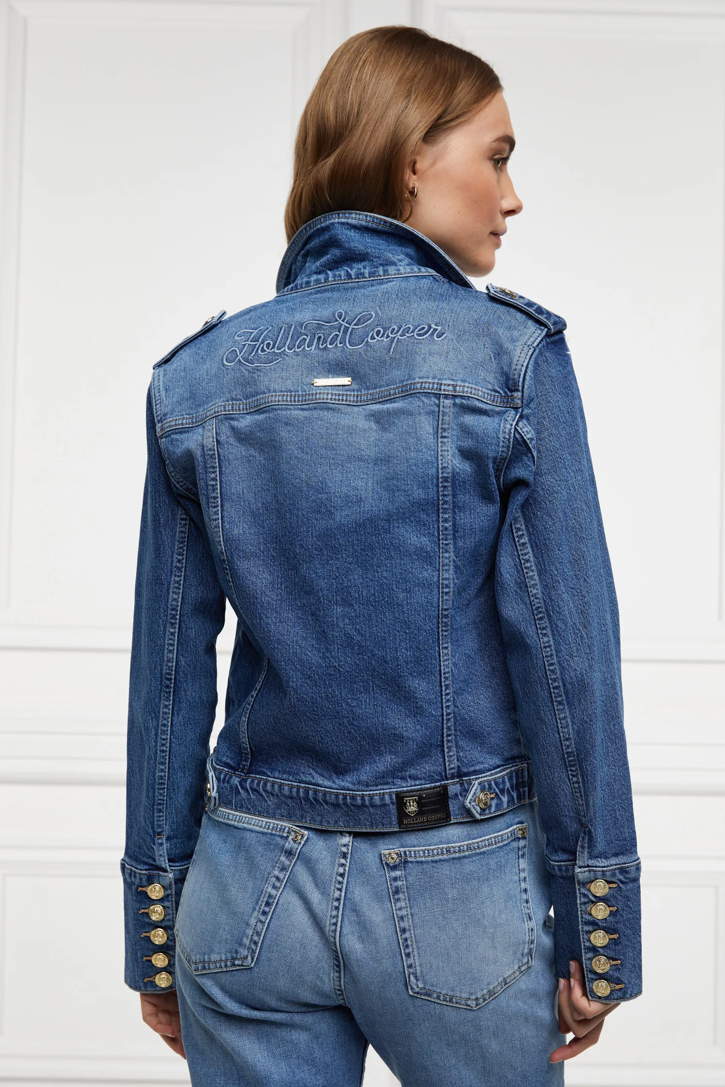 Designed with a classic 80’s style, this jacket has been created from a comfortable stretch denim. Perfect for layering, this jacket has been detailed with a flap chest pocket, deep cuffs and our iconic hardware. Finished with our new leather jacron to the back.