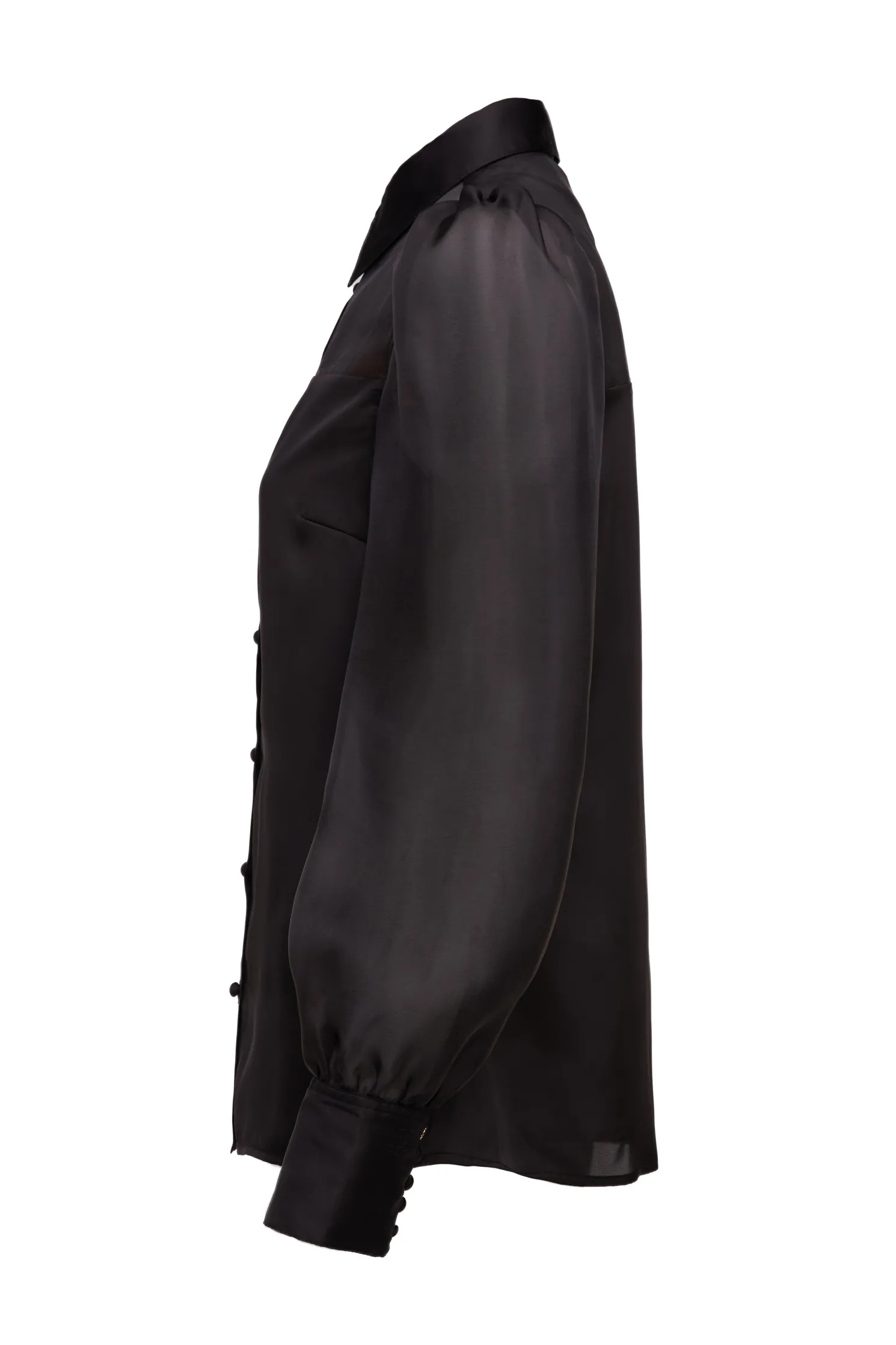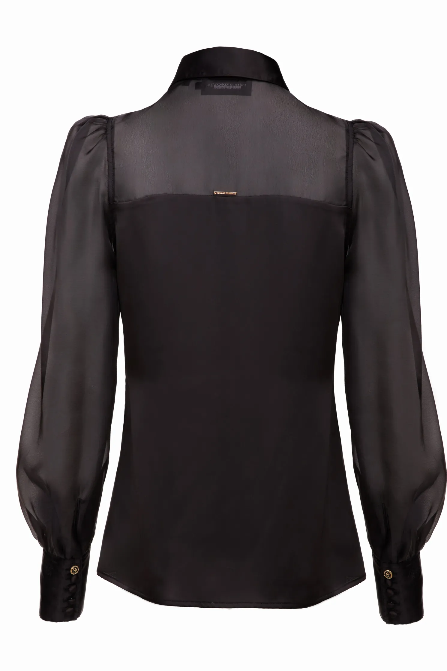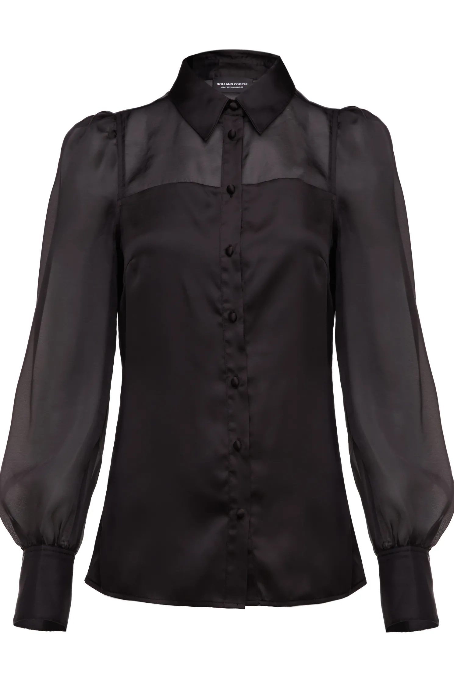 Designed with a classic tailored shirt aesthetic, this piece has been beautifully elevated with a sheer front & back yolk with chiffon sleeves and extended cuffs. Both the collar & body have been created from luxurious satin fabric. Elevated with HC details and finished with a concealed front placket.