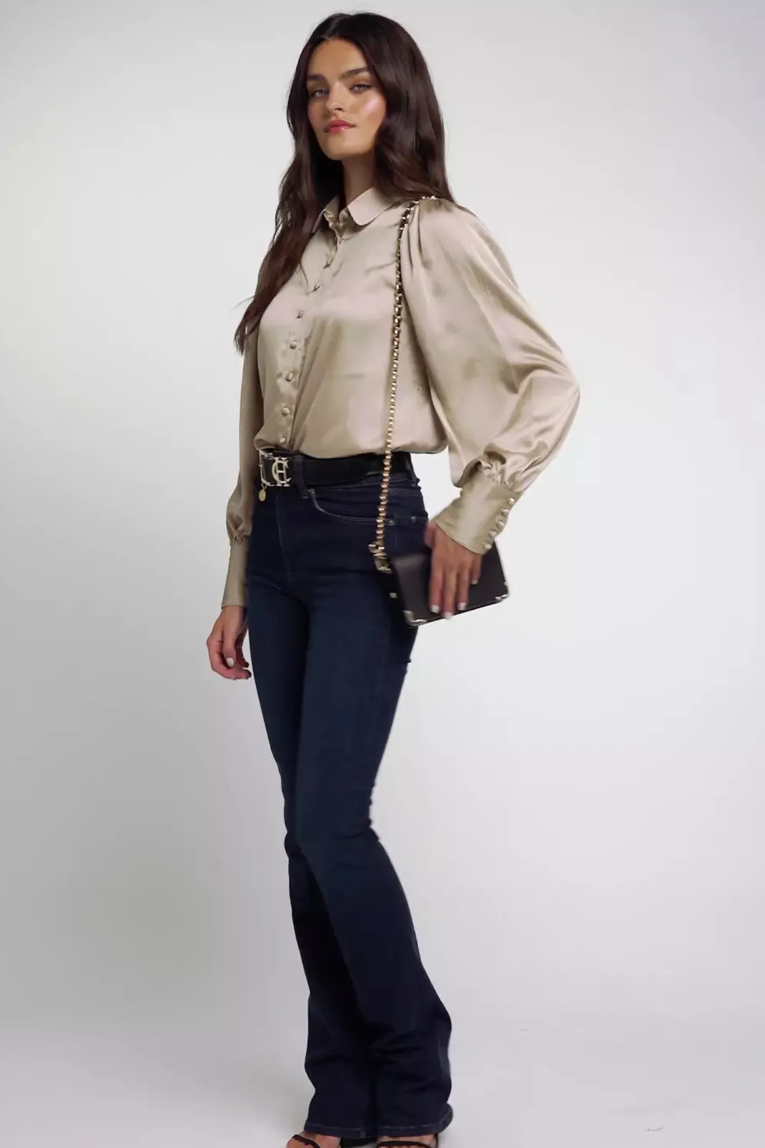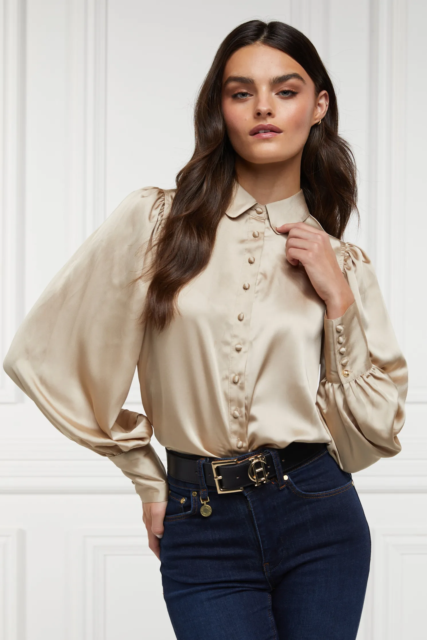 A play on the classic shirt, the Isla Satin Shirt has a tailored yet relaxed fit with statement high volume sleeves and extra long cuffs. The shirt has matching fabric covered buttons down the front and a gold crested button for that signature Holland Cooper look.