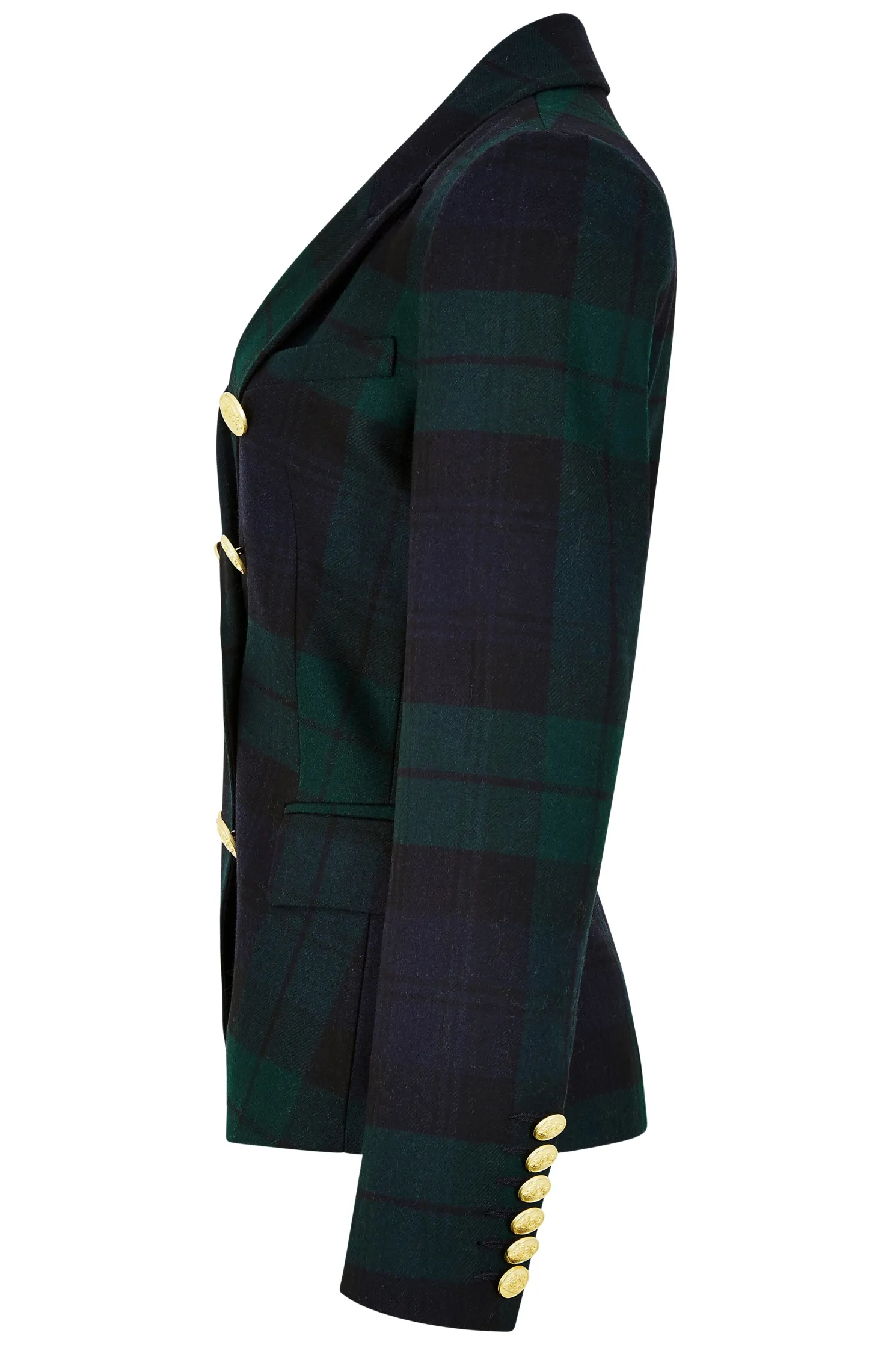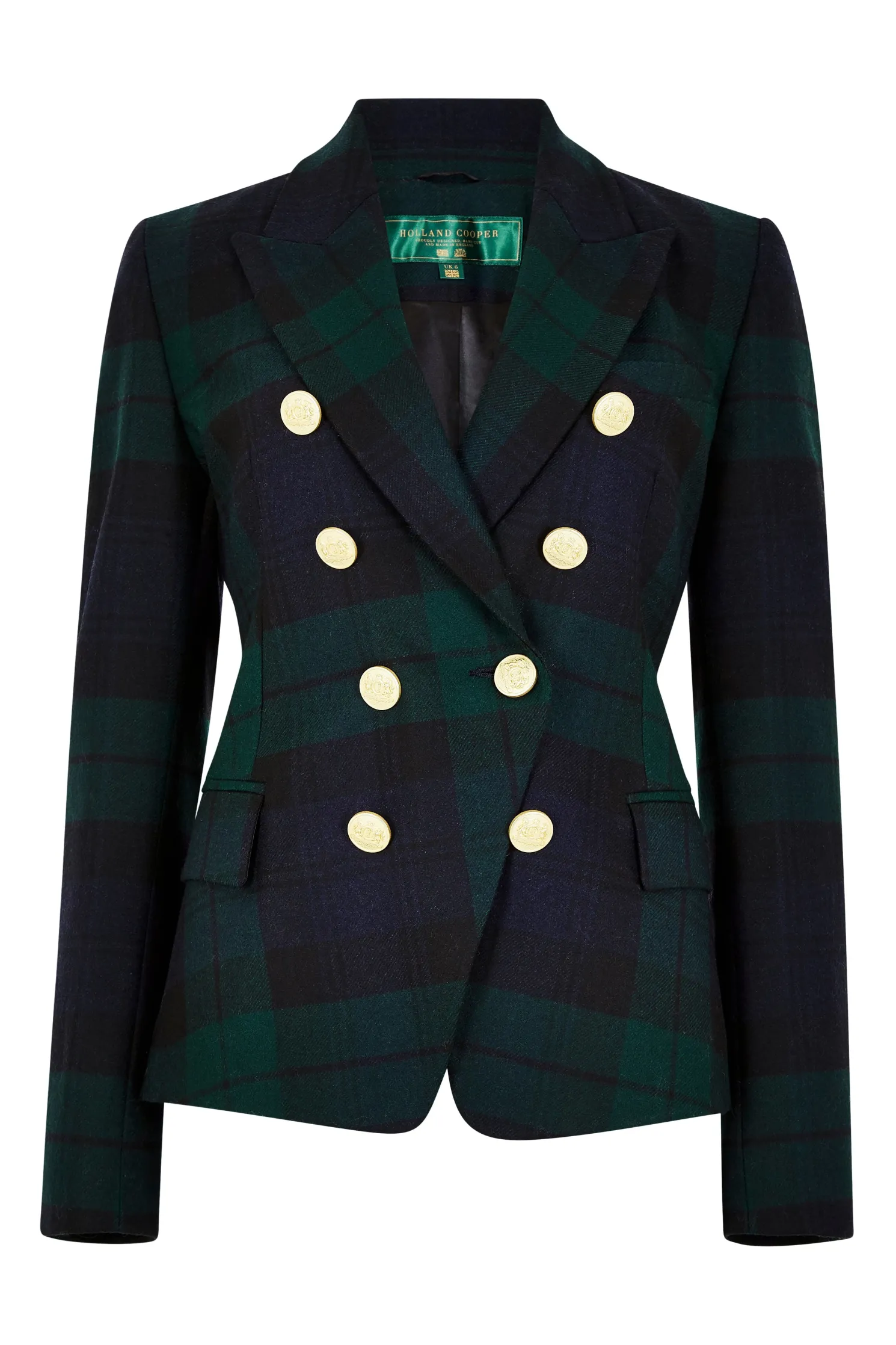 This double breasted blazer is a chic transeasonal wardrobe essential. Designed to create a sharp tailored silhouette worn open or closed. Fully lined with a luxury stretch lining for extra comfort and adorned with HC signature Gold buttons on the front and cuffs. This blazer has been hand cut and made entirely in England using wools woven in the UK.