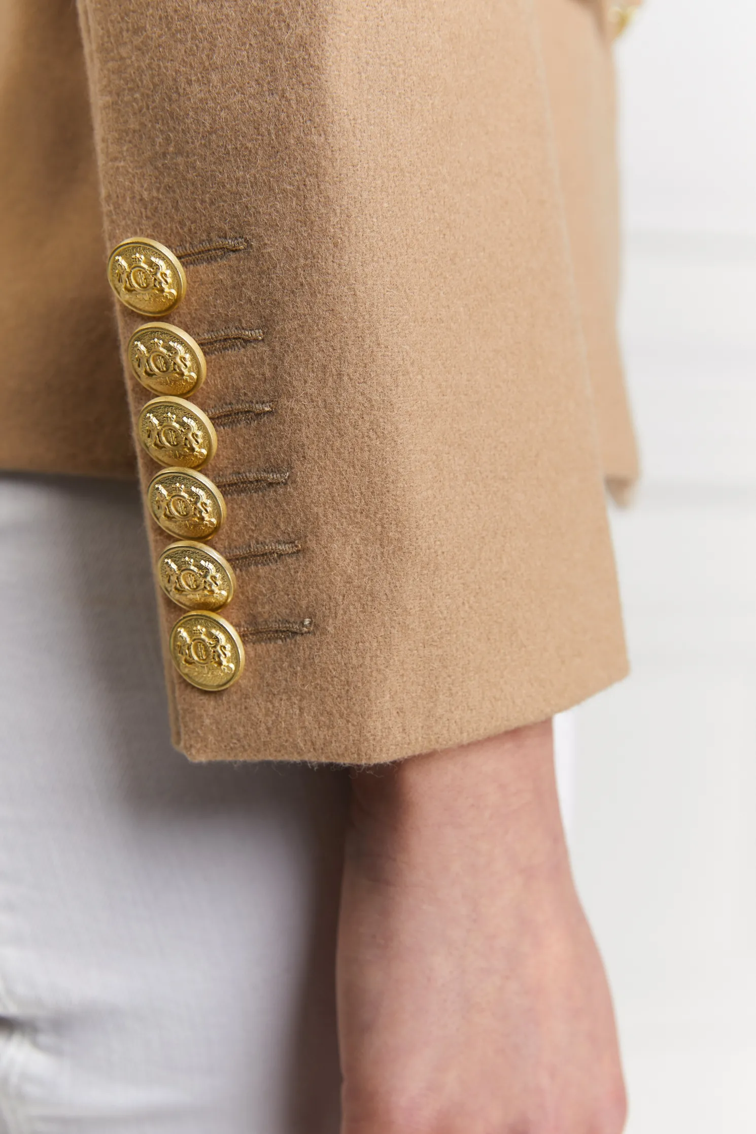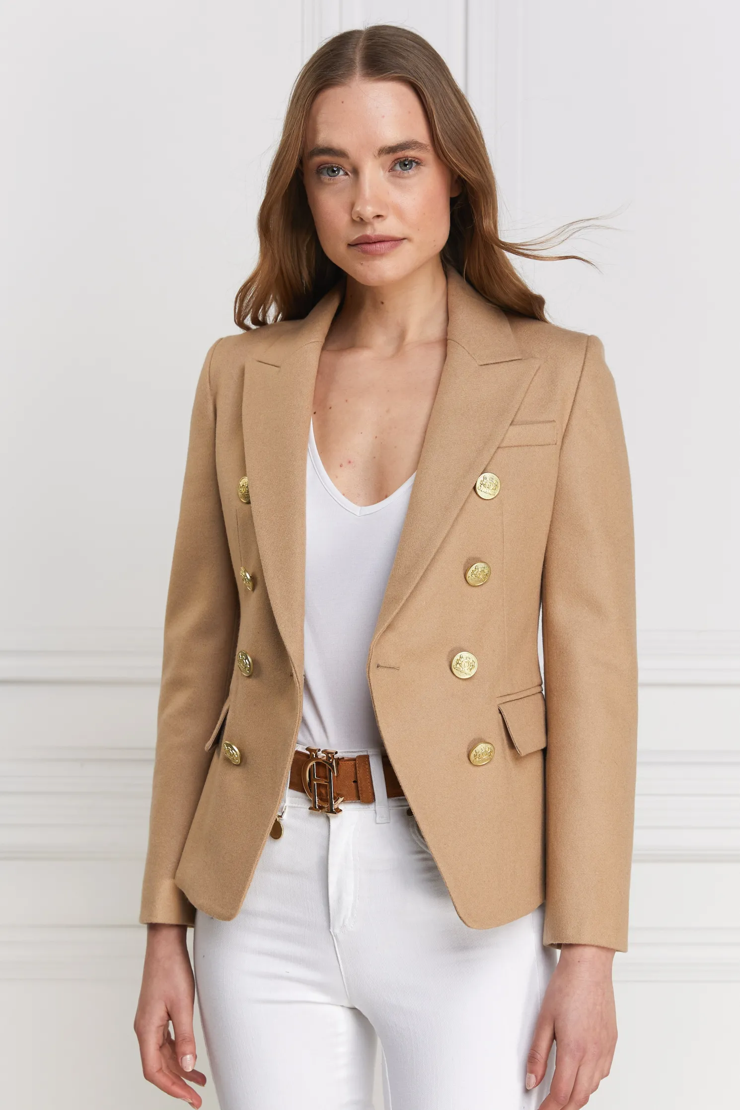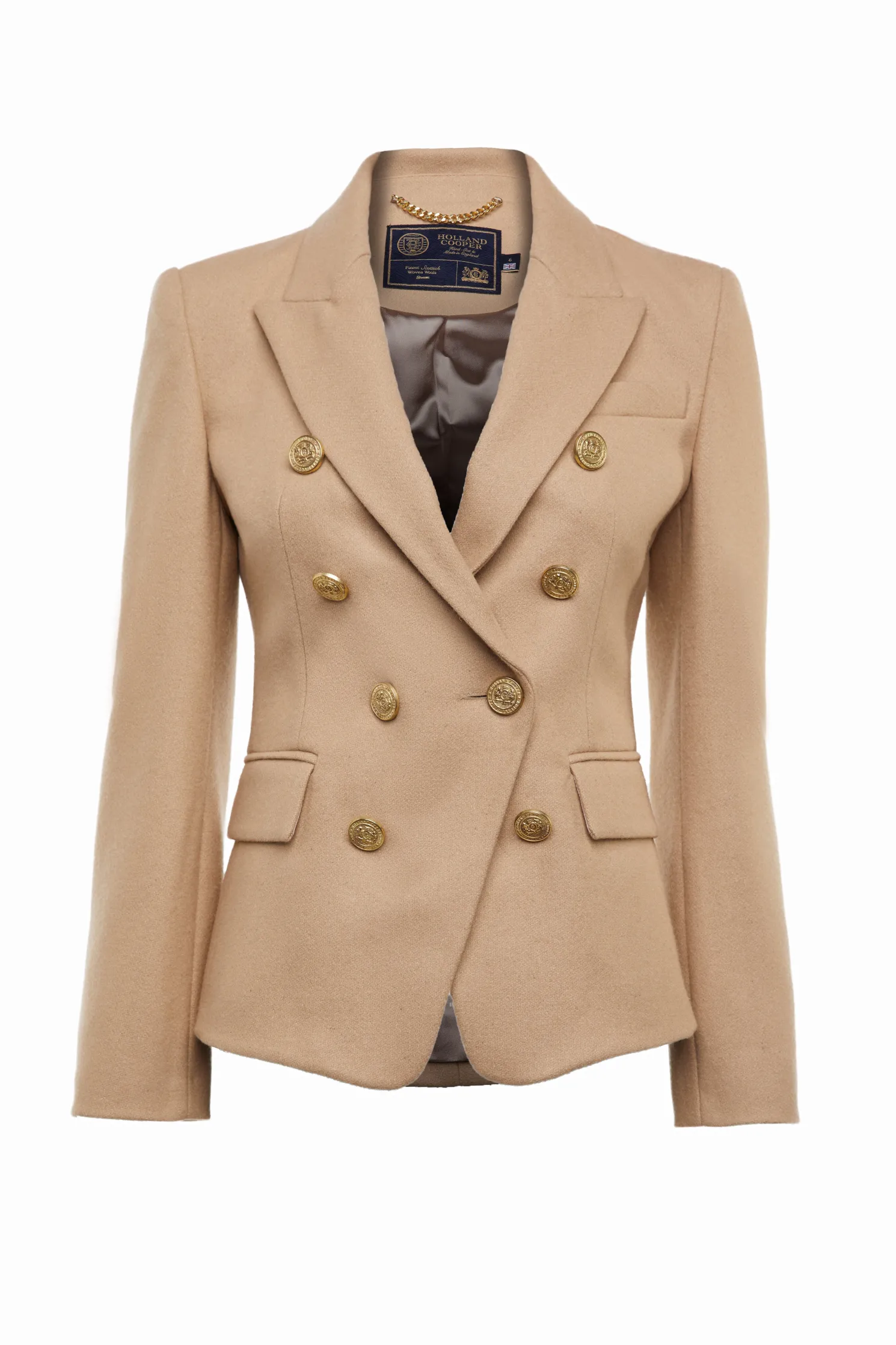 This double breasted Blazer is a chic transeasonal wardrobe essential. Designed to create a sharp tailored silhouette worn open or closed. Fully lined with a luxury stretch lining for extra comfort and adorned with HC signature Gold buttons on the front and cuffs. This blazer has been hand cut and made entirely in England using wools woven in the UK.