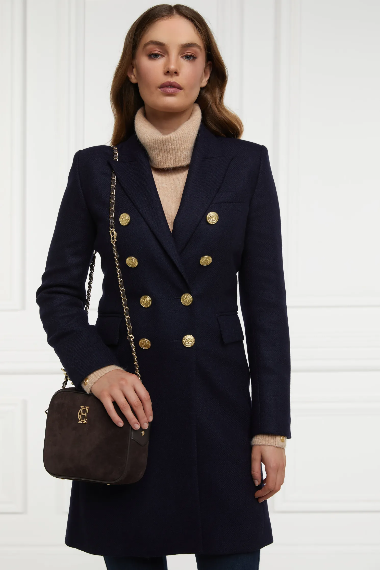 This double breasted wool coat oozes elegance, designed and cut to achieve a slim tailored feminine silhouette when worn open or closed. This coat is fully lined and made from the finest UK woven wools.