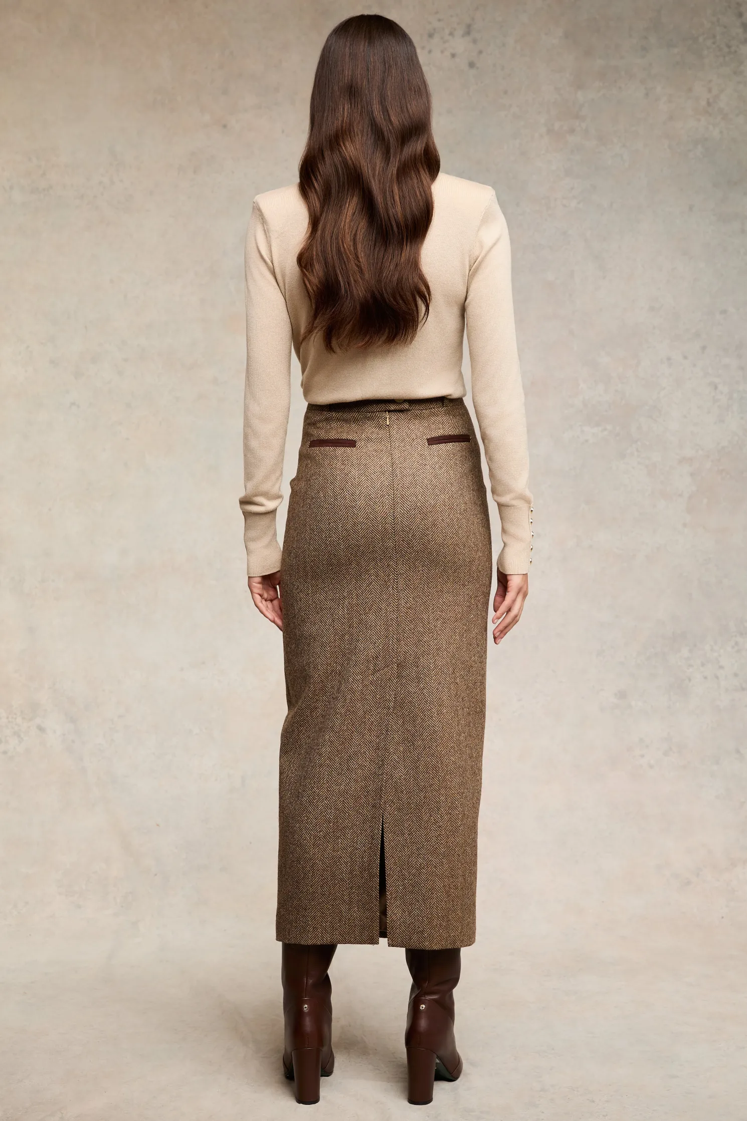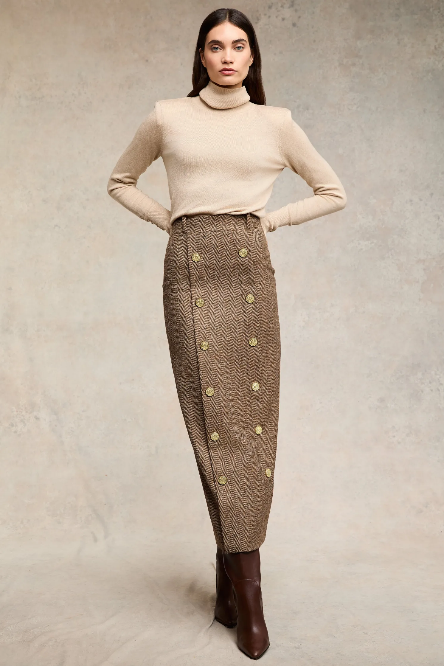 Handcrafted from the finest wool, this new addition to our skirt collection has been designed with a refined, pencil silhouette. Designed with a full satin lining and a zip back closure. With a close fit and high waist, this piece is a classic wardrobe staple. Detailed with our iconic gold hardware and statement gold buttons.