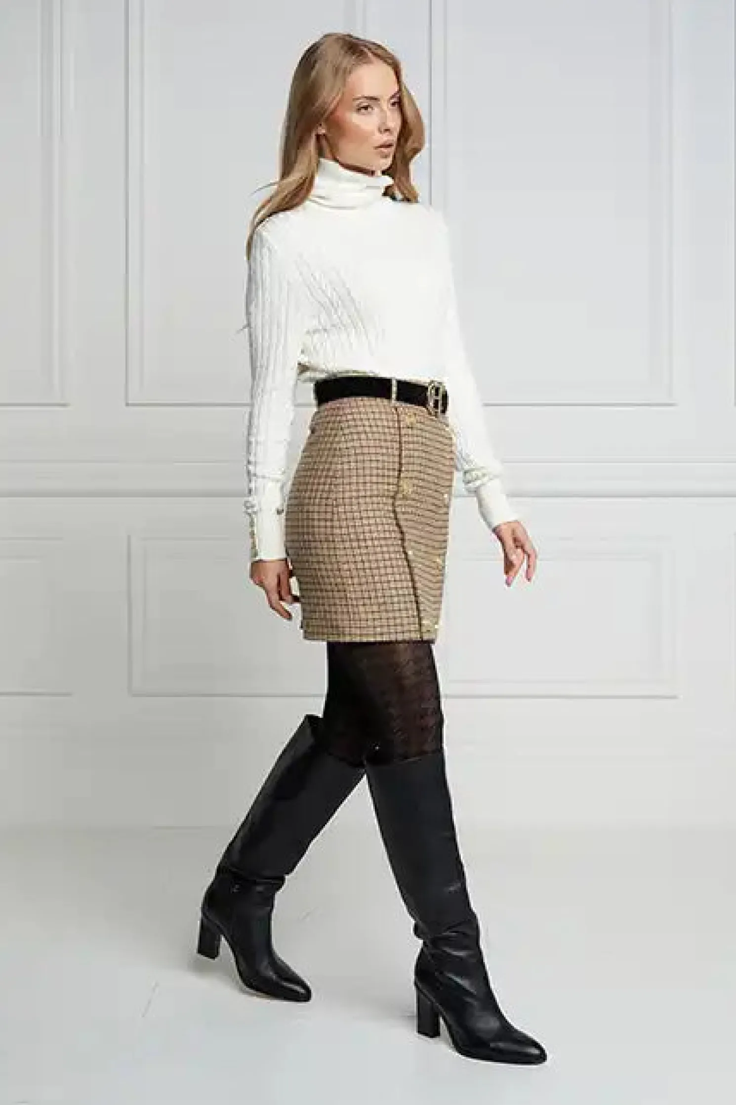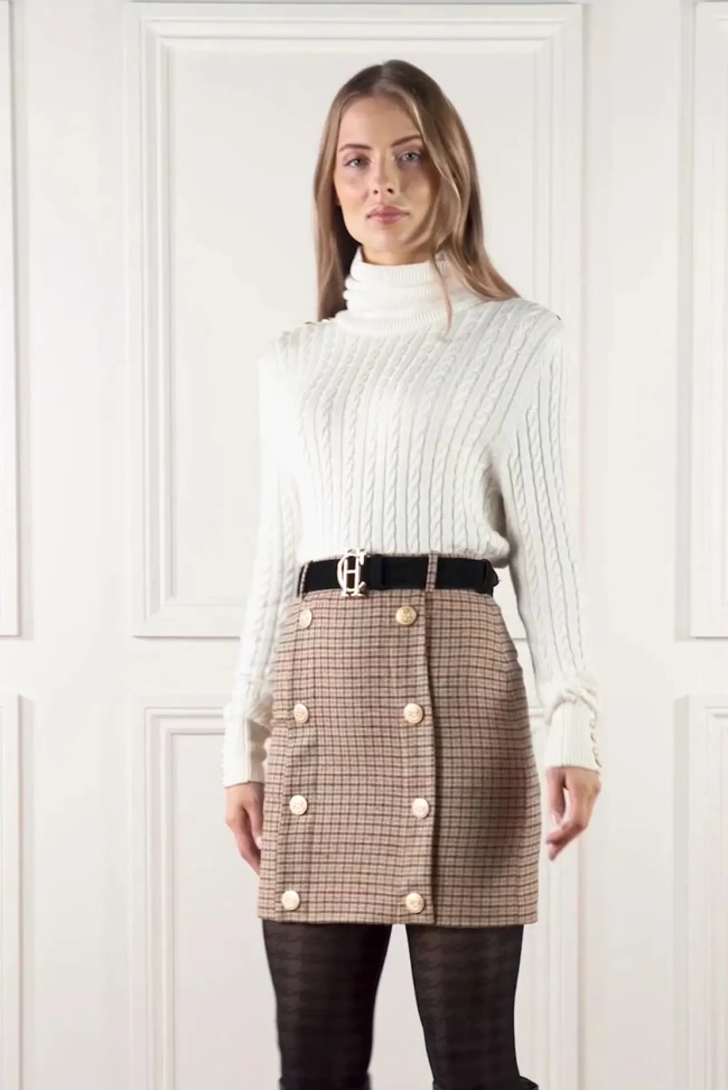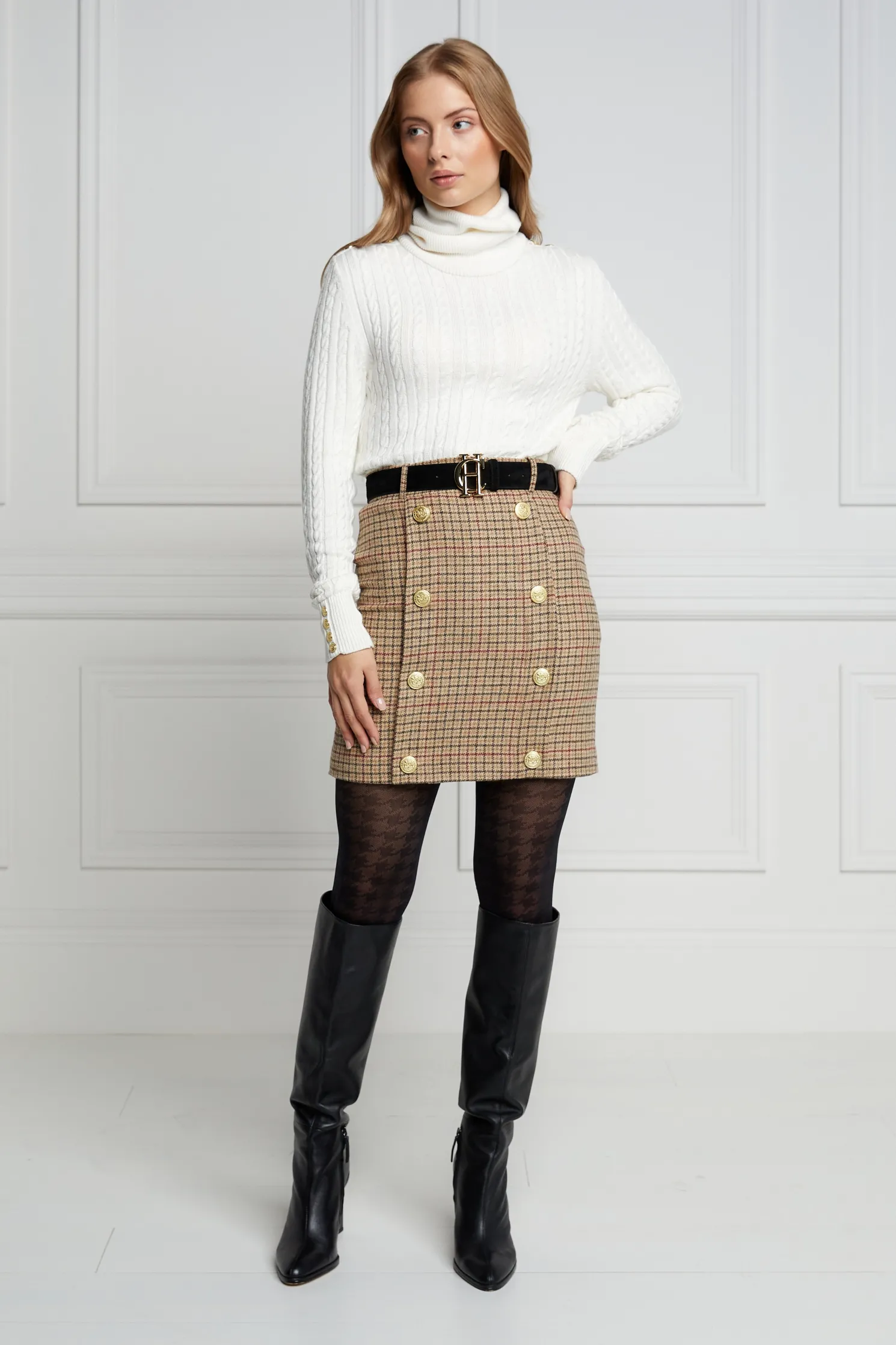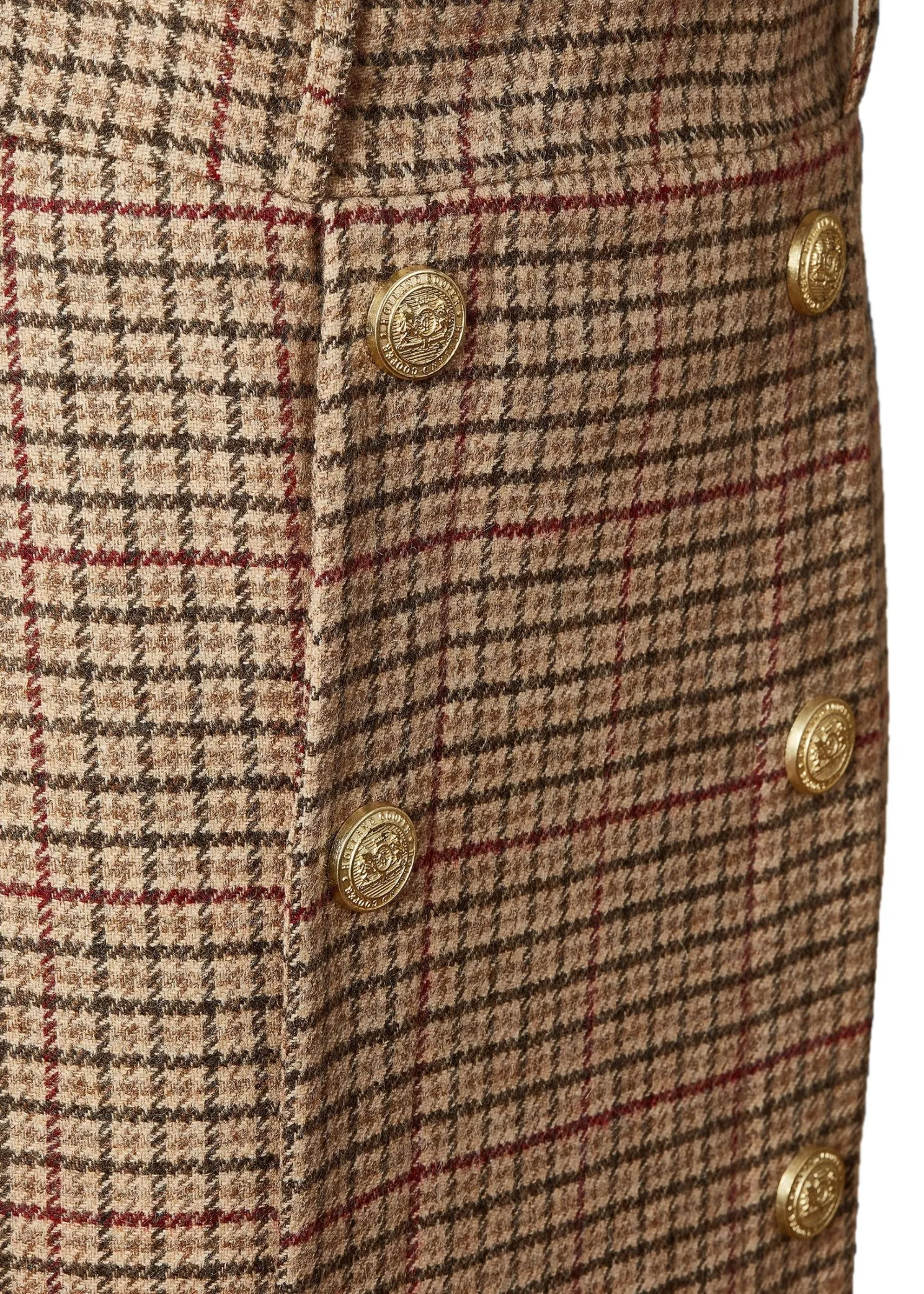 This mini style pencil skirt is fully lined and cut for a close fit from wool accented by gold rivets engraved with the classic HC crest. Tuck your sweater or blouse into the sculpting high-rise waist for an extra stylish look and feel.
