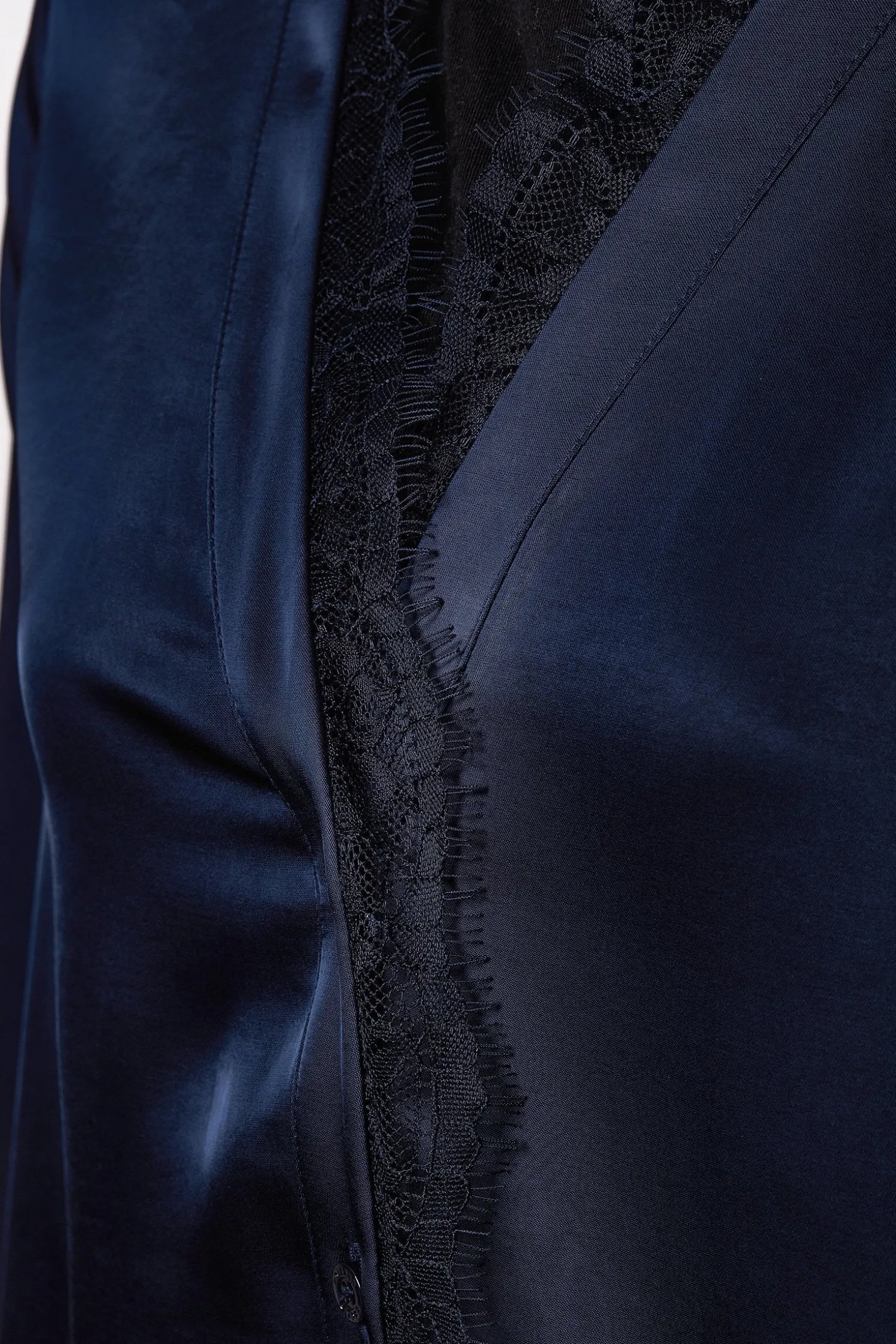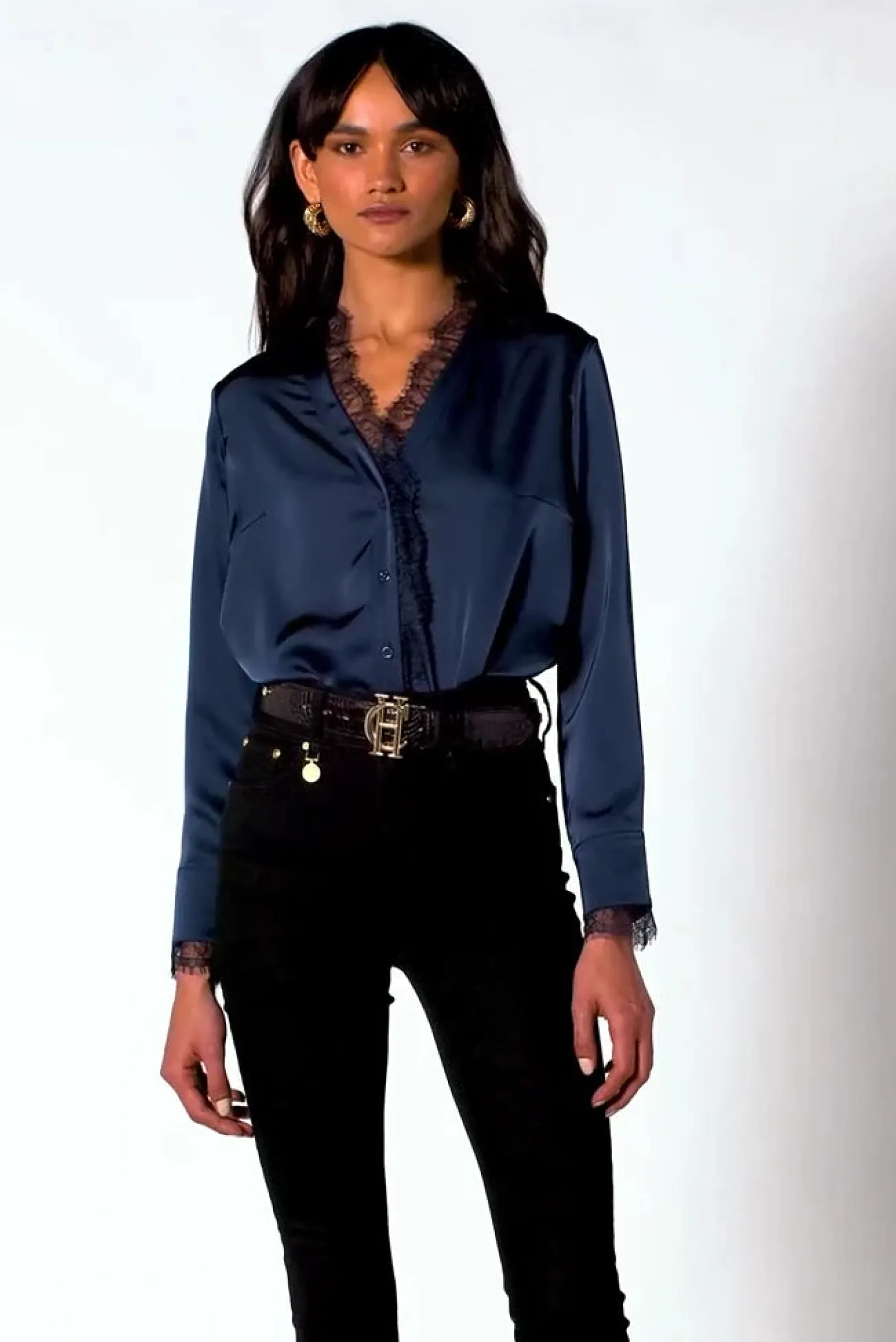 Our beautiful and truly luxurious v-neck blouse has been designed with a relaxed fit. With a delicate lace trim on the collar and cuff edges, this piece is an update of our Lace Tie Shirt.