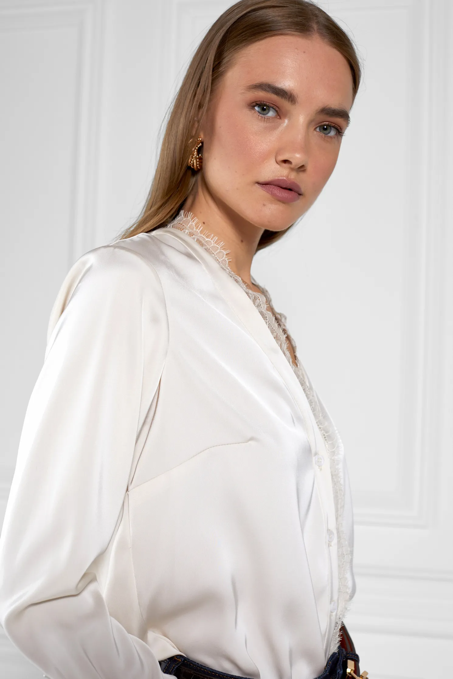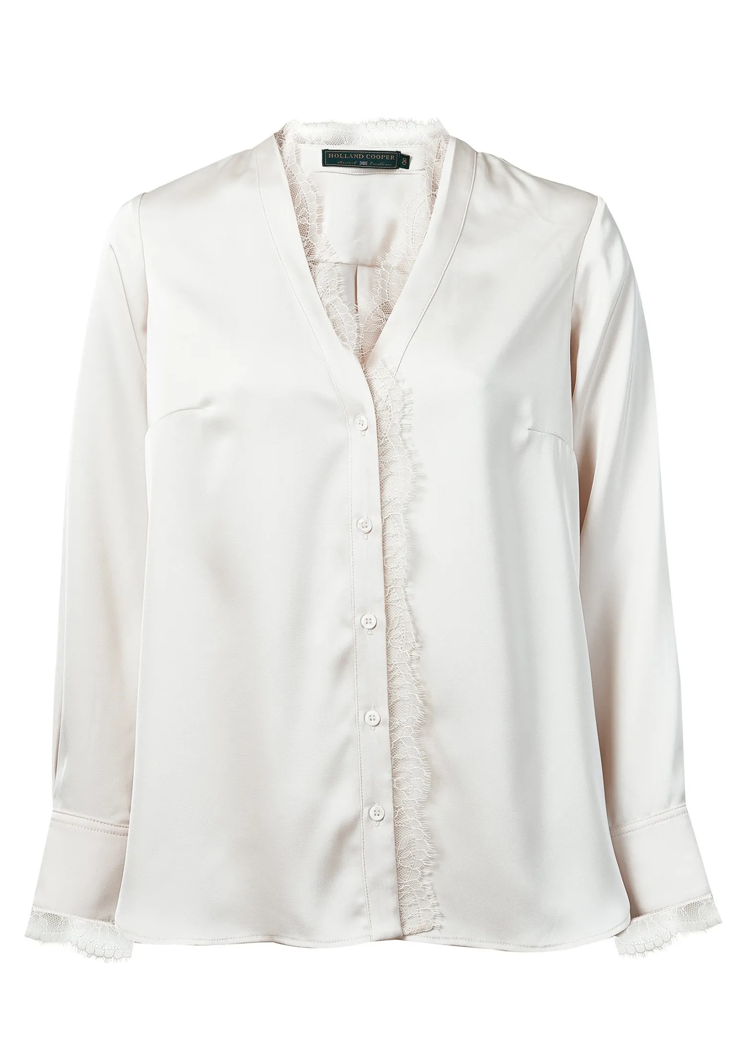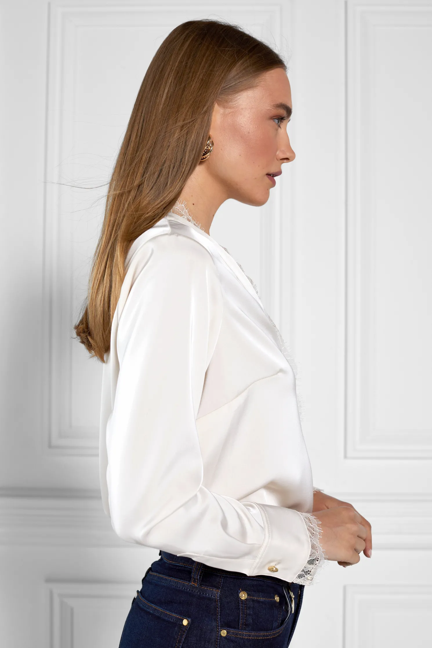 Our beautiful and truly luxurious v-neck blouse has been designed with a relaxed fit. With a delicate lace trim on the collar and cuff edges, this piece is an update of our Lace Tie Shirt.