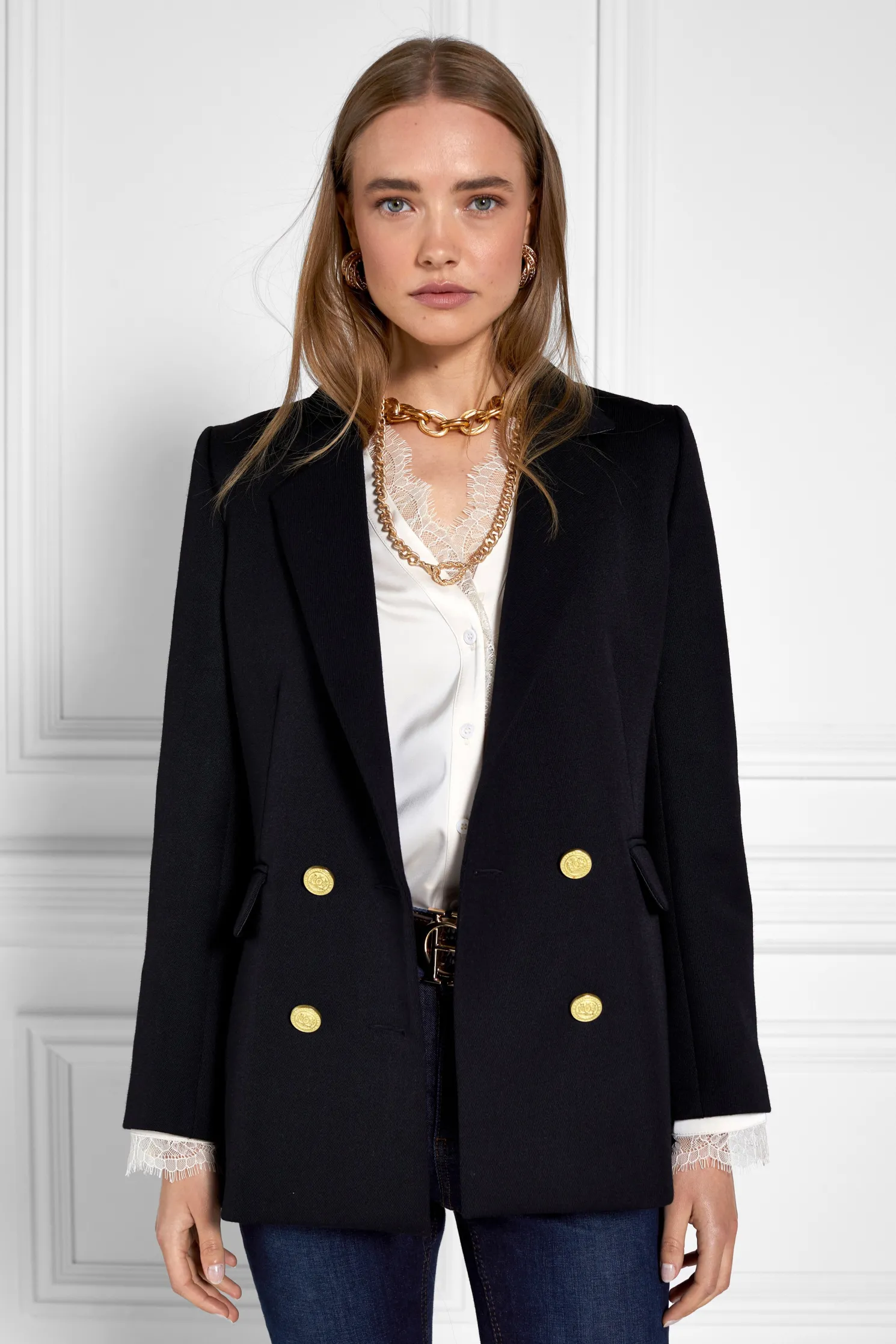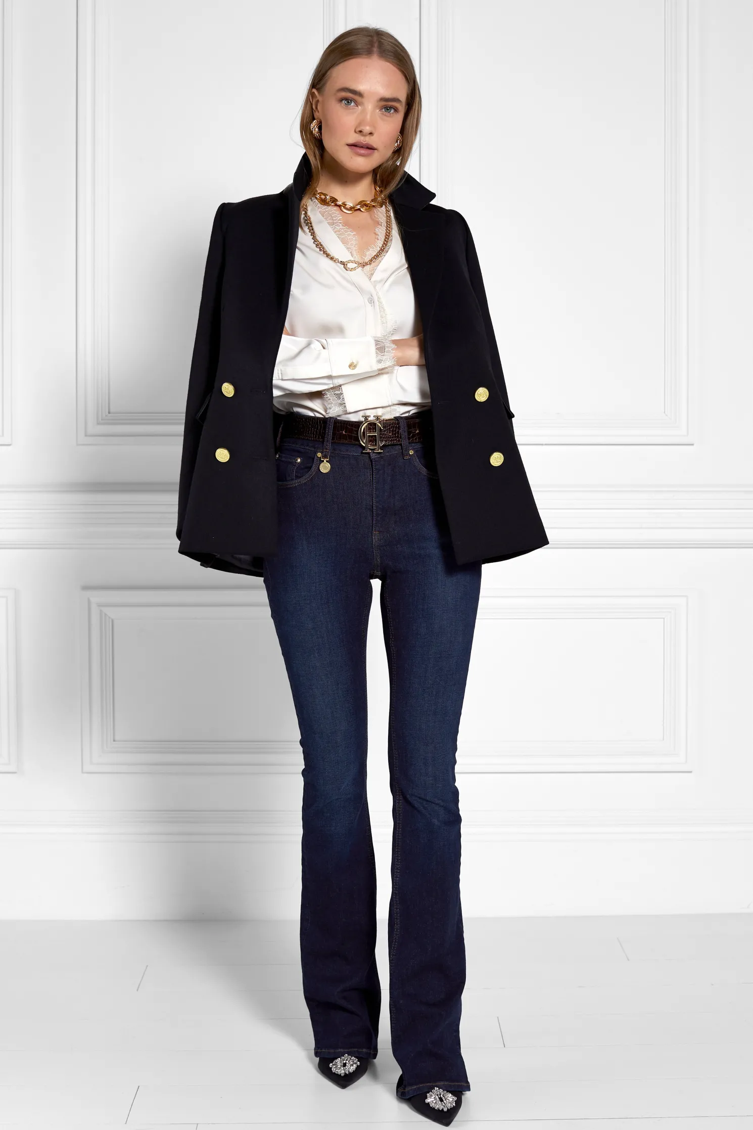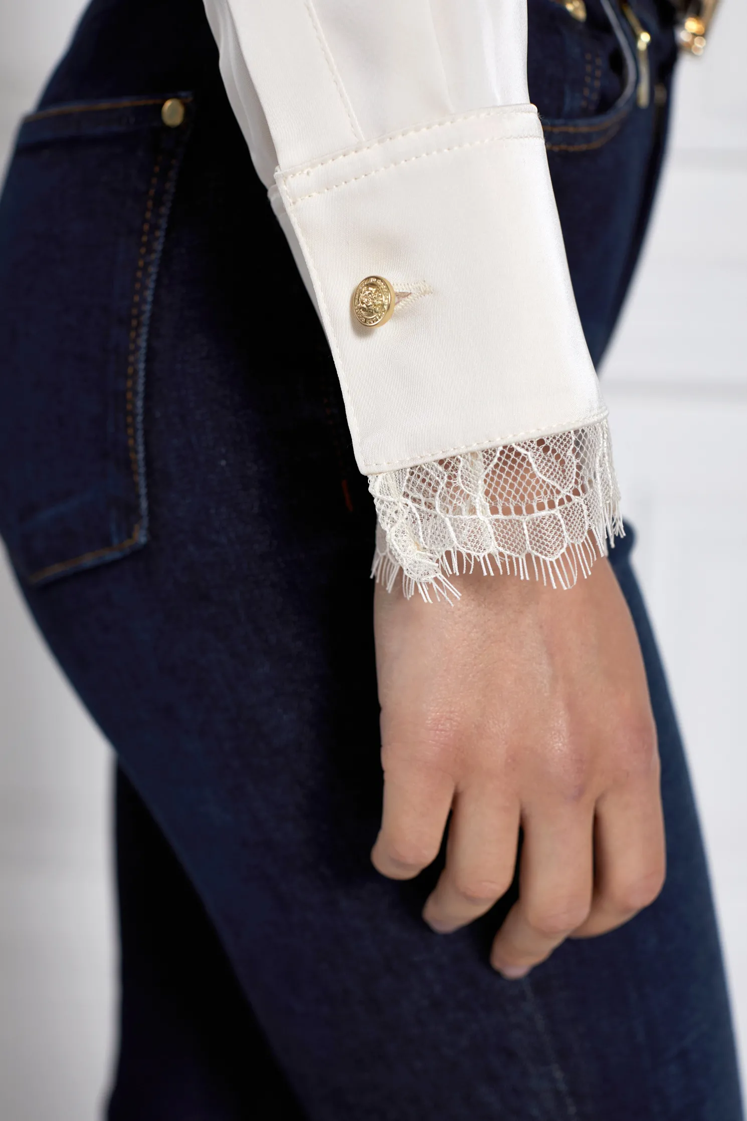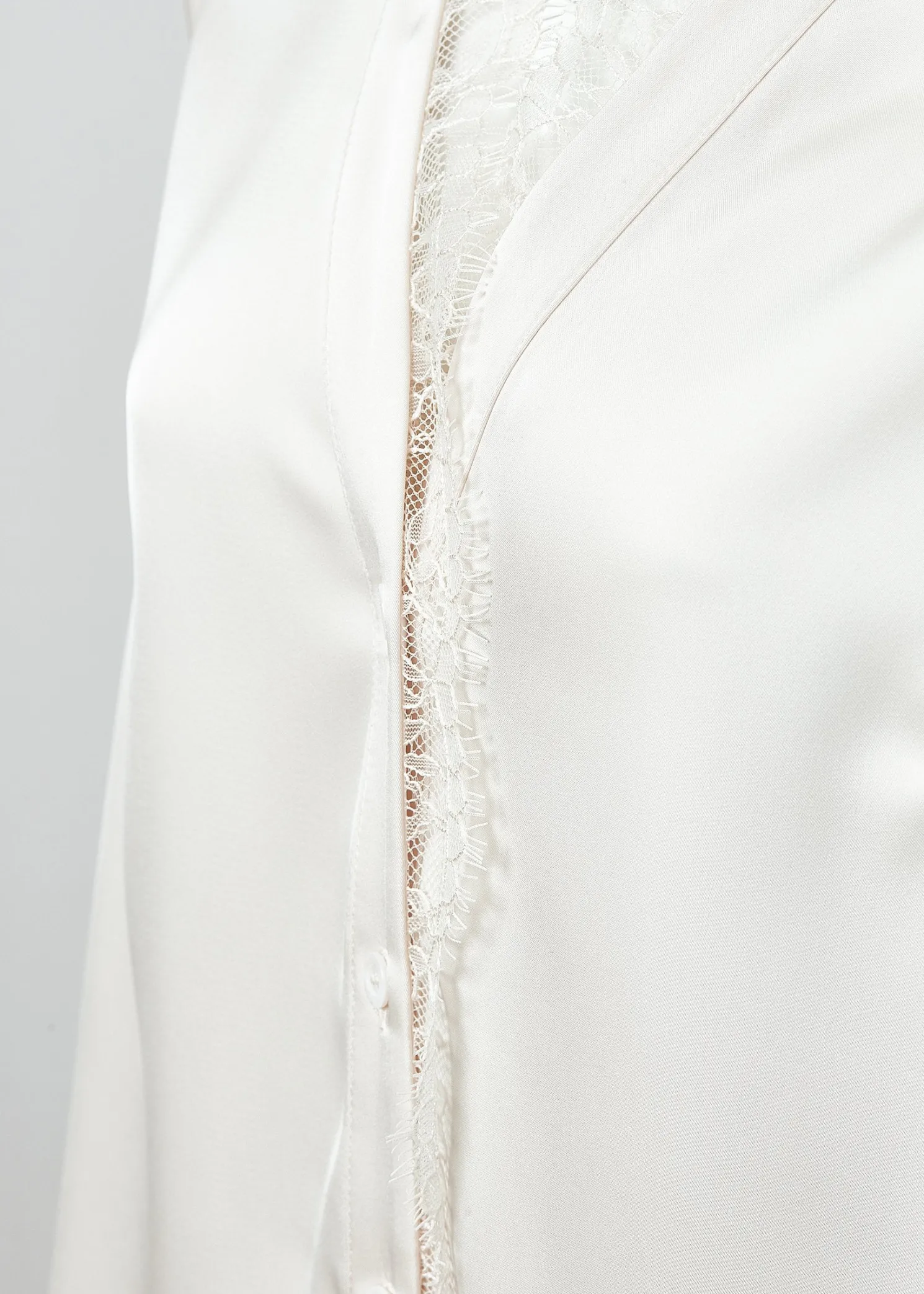 Our beautiful and truly luxurious v-neck blouse has been designed with a relaxed fit. With a delicate lace trim on the collar and cuff edges, this piece is an update of our Lace Tie Shirt.