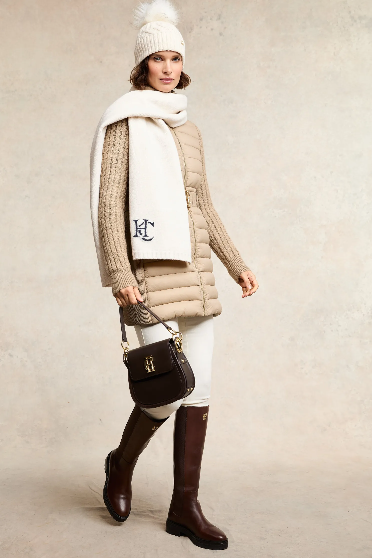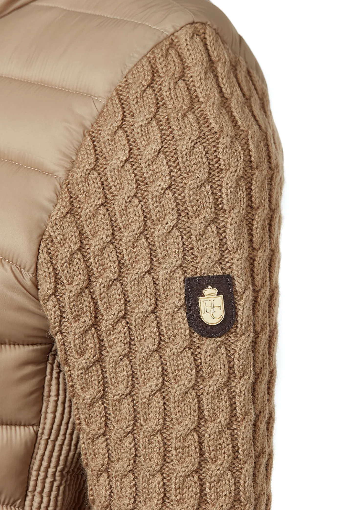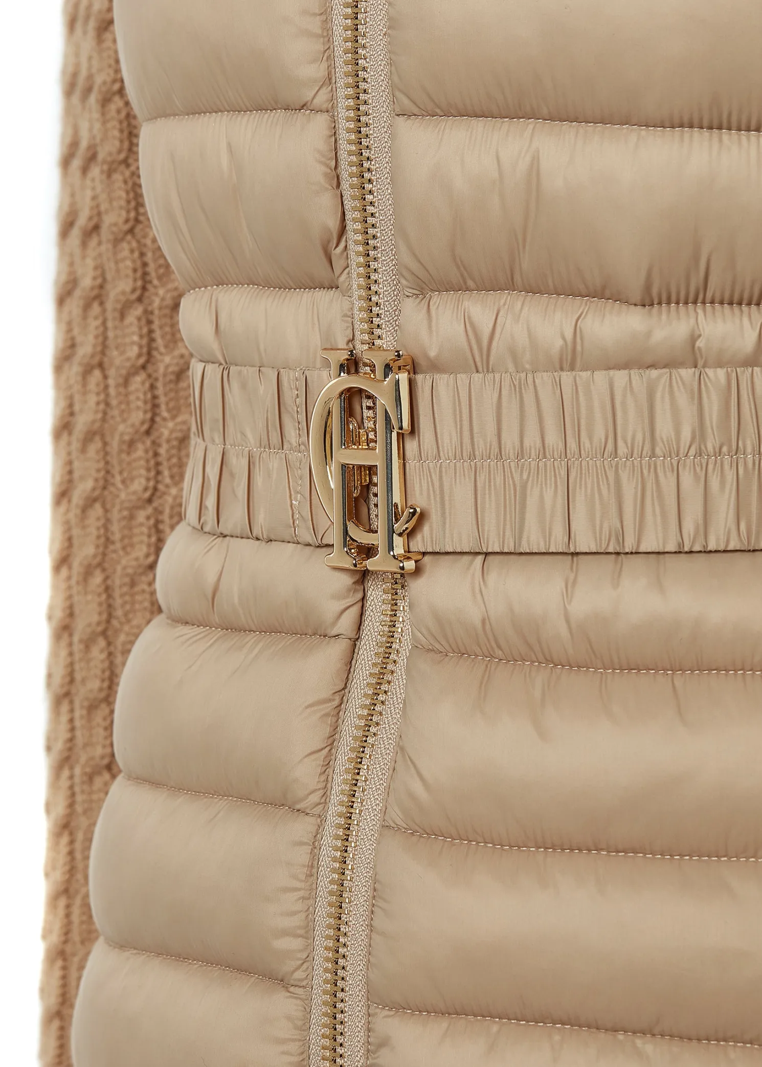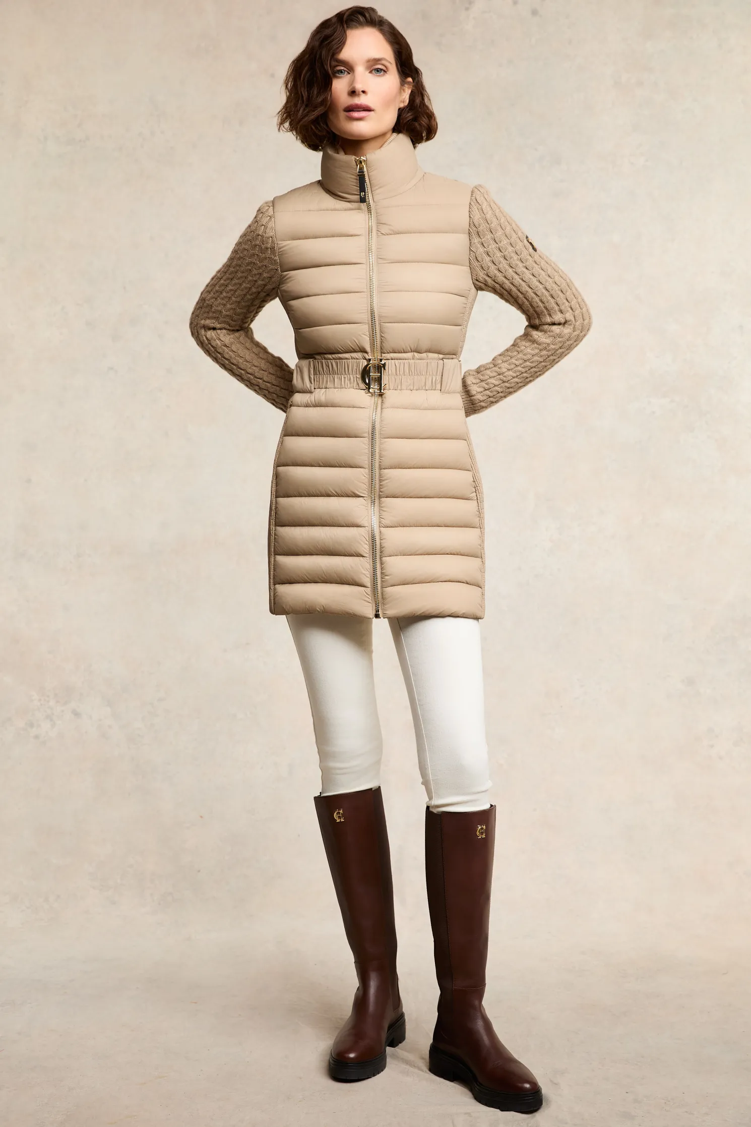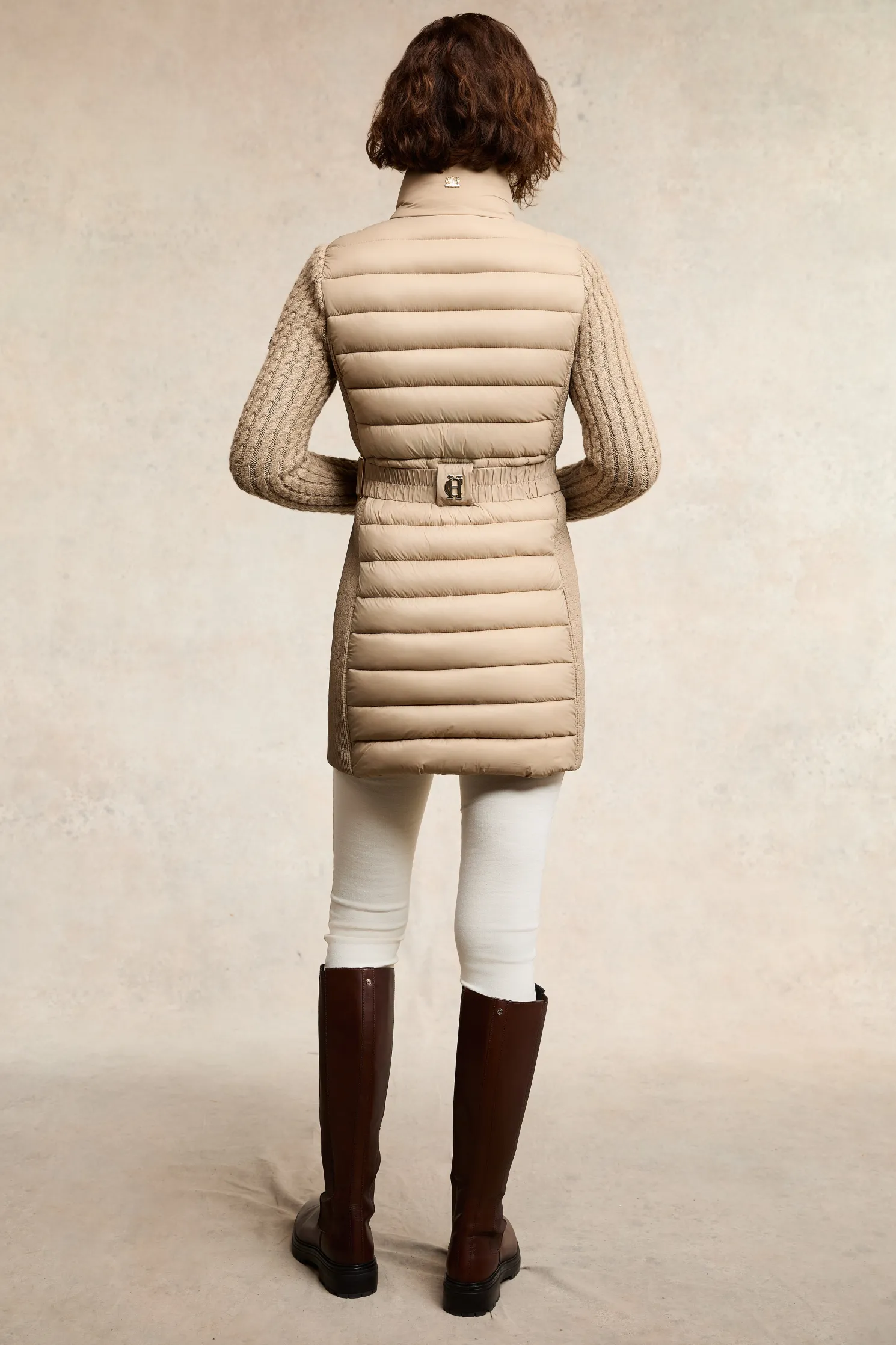 A sophisticated mid-length coat that seamlessly blends classic style with modern functionality. Crafted with Sorona by DuPont synthetic down fill, it ensures lightweight warmth and comfort, perfect for colder days. This coat features a self-fabric-covered elastic belt with an elegant HC buckle, adding a refined touch to the silhouette. The contrasting cable knitted sleeves provide both texture and style, enhancing its aesthetic appeal.