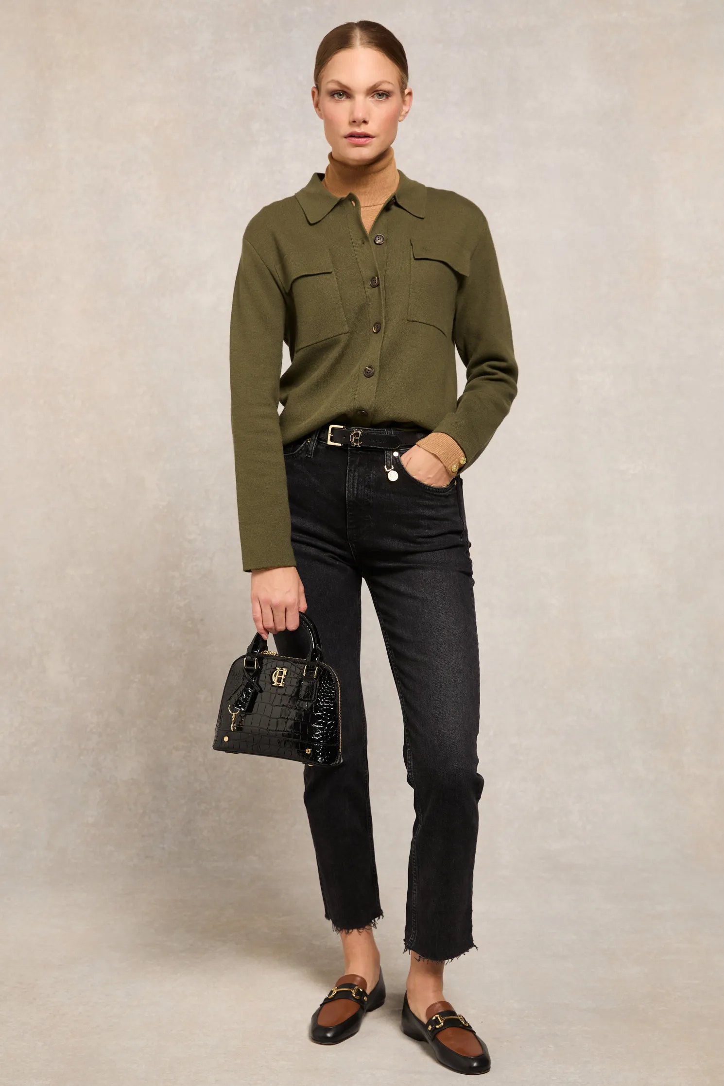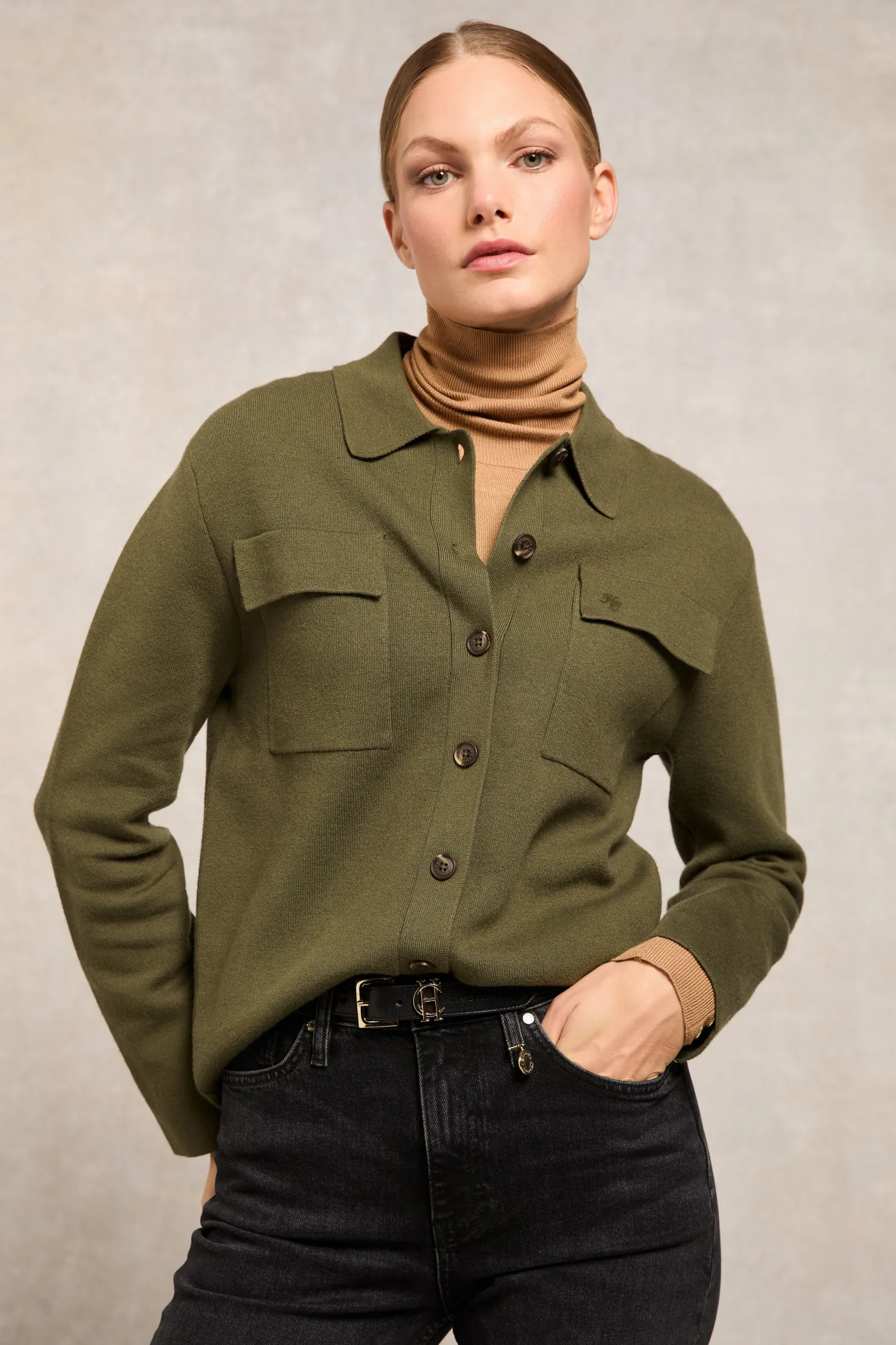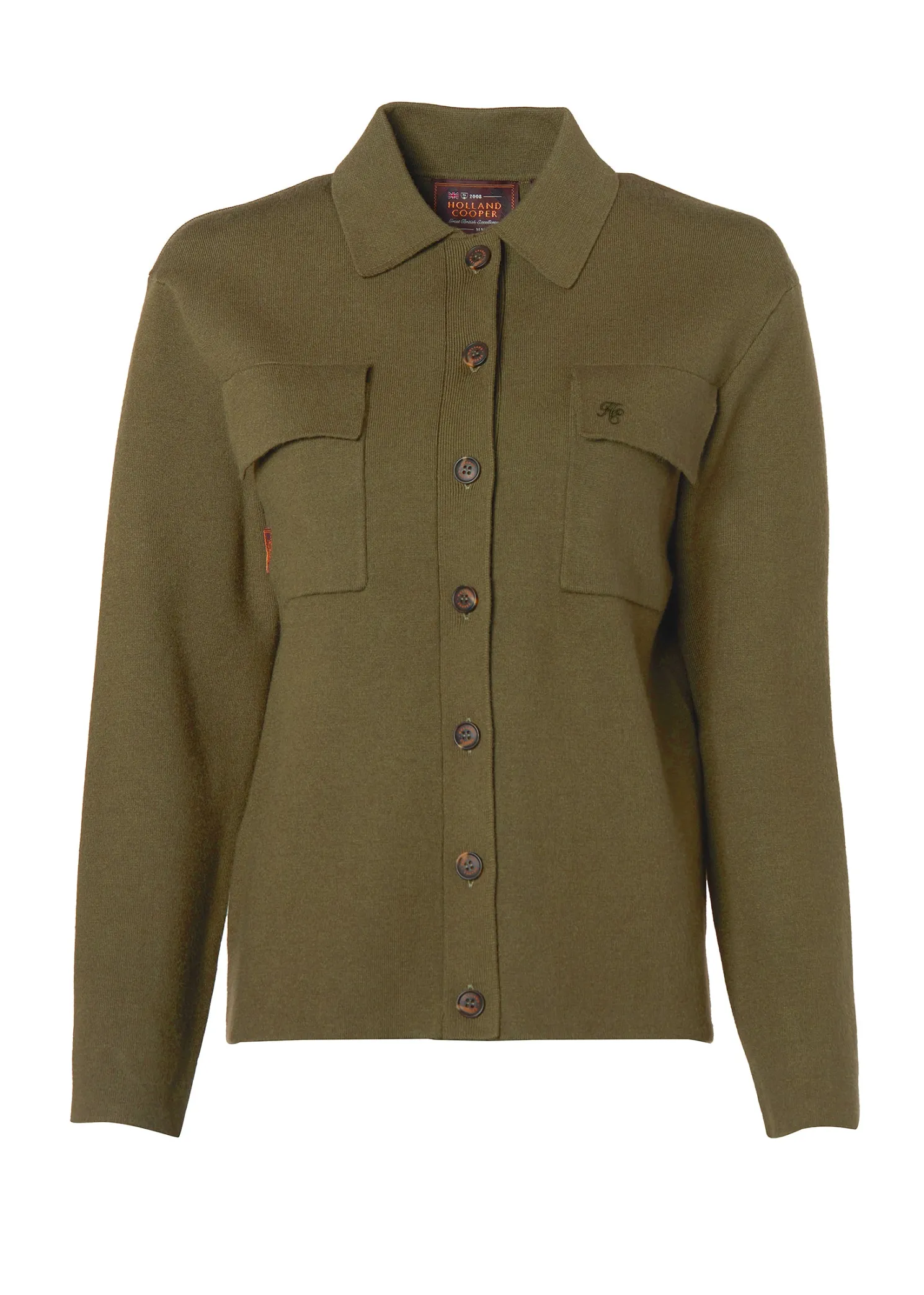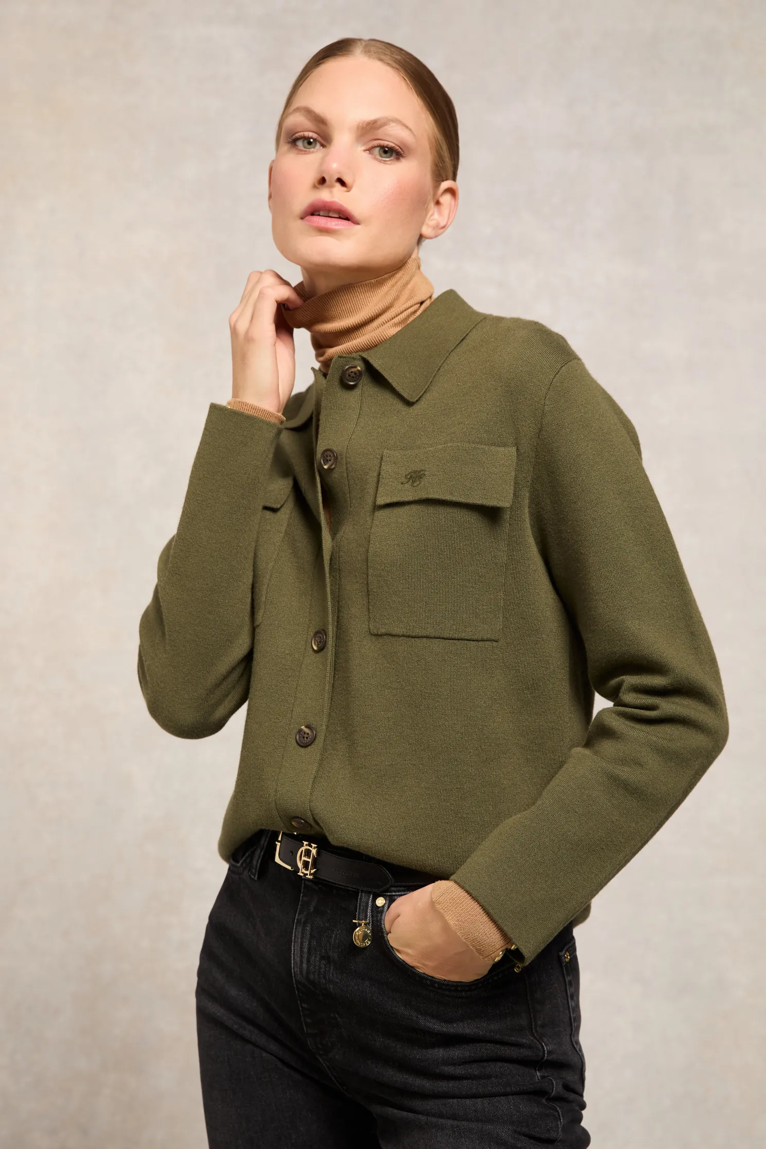 Crafted with a double knitting stitch, this beautiful overshirt offers a luxurious and cosy feel. Featuring two front chest pockets adorned with tonal HC embroidery, it adds a touch of refined detail. The horn effect buttons enhance its classic appeal, making it a versatile and elegant addition to any outfit. Perfect for layering or wearing on its own, this piece is essential for any well-curated wardrobe.