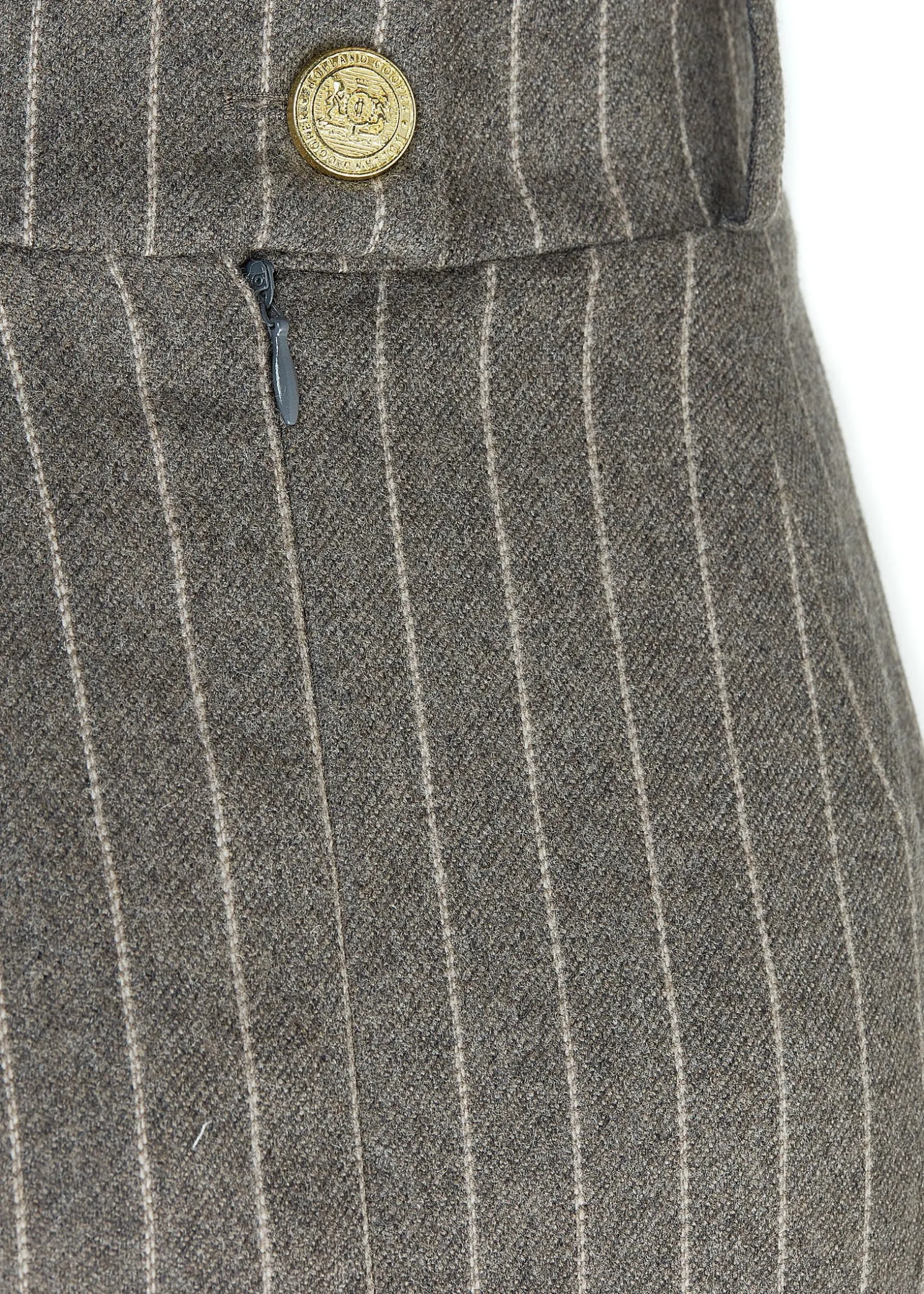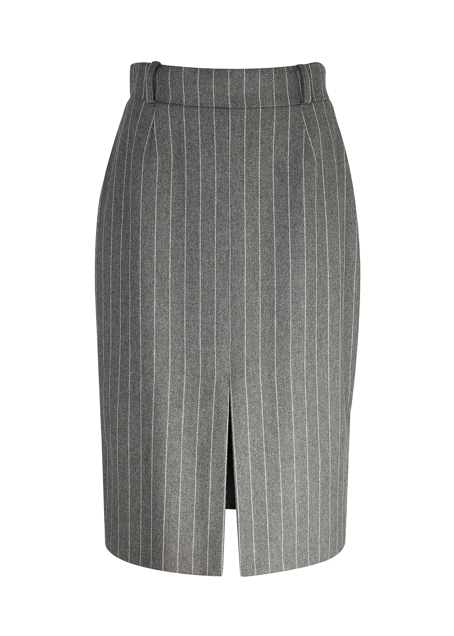 Enhanced by our iconic signature gold medallion, this classic mid length pencil skirt is a timeless staple for your wardrobe. Handmade in the UK from British wools, it has a figure-hugging silhouette, with modest front split. Fully lined for comfort with a concealed zip on the back, this skirt has been created to fit perfectly into your everyday workwear wardrobe.