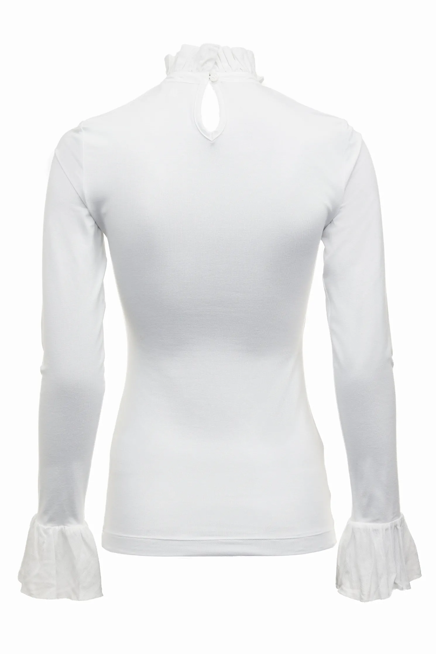 Designed as a neatly fitted shirt with feminine frills on the front and cuffs giving a softness to the blouse. This blouse is highly versatile, style with our high-waisted peg trousers or layer under one of our jumpers with the collar and cuff peeking out.