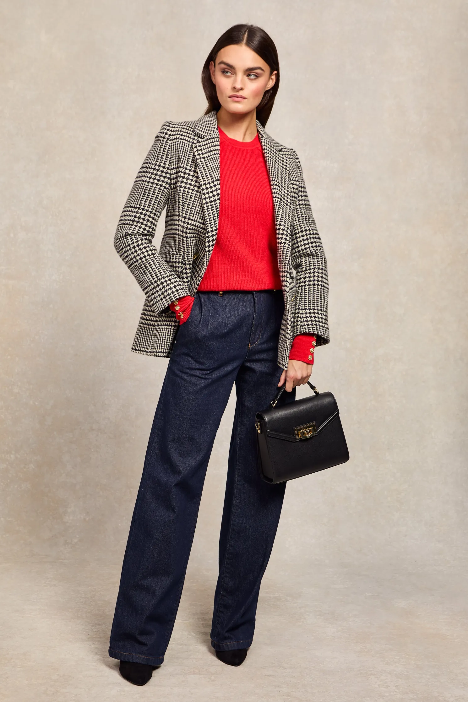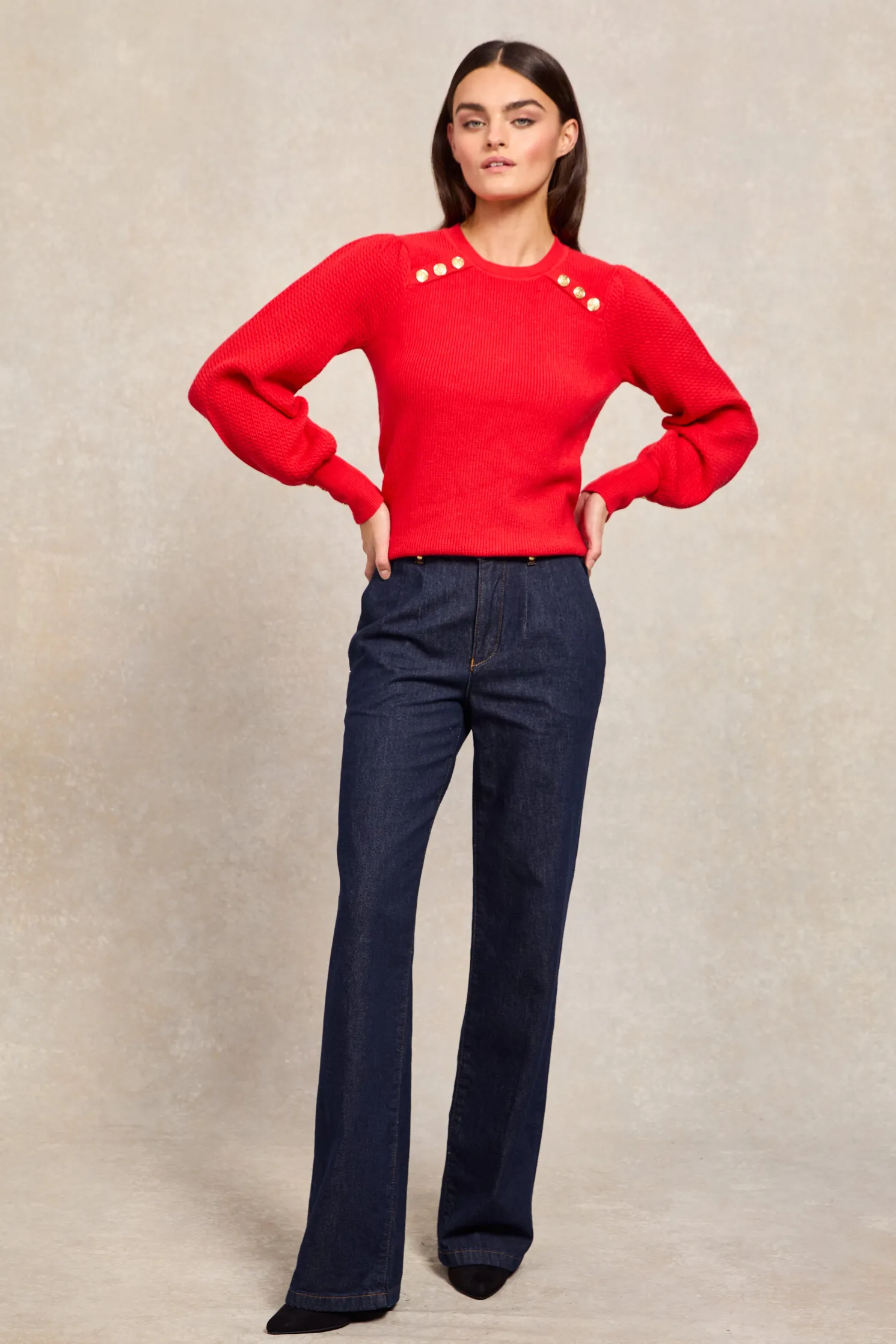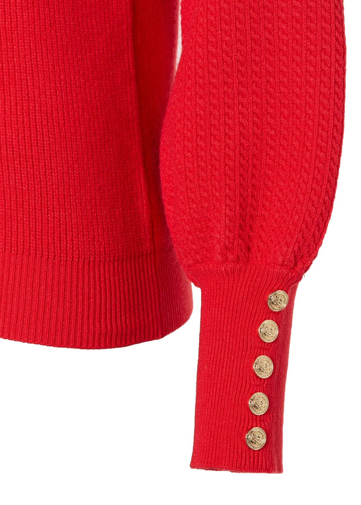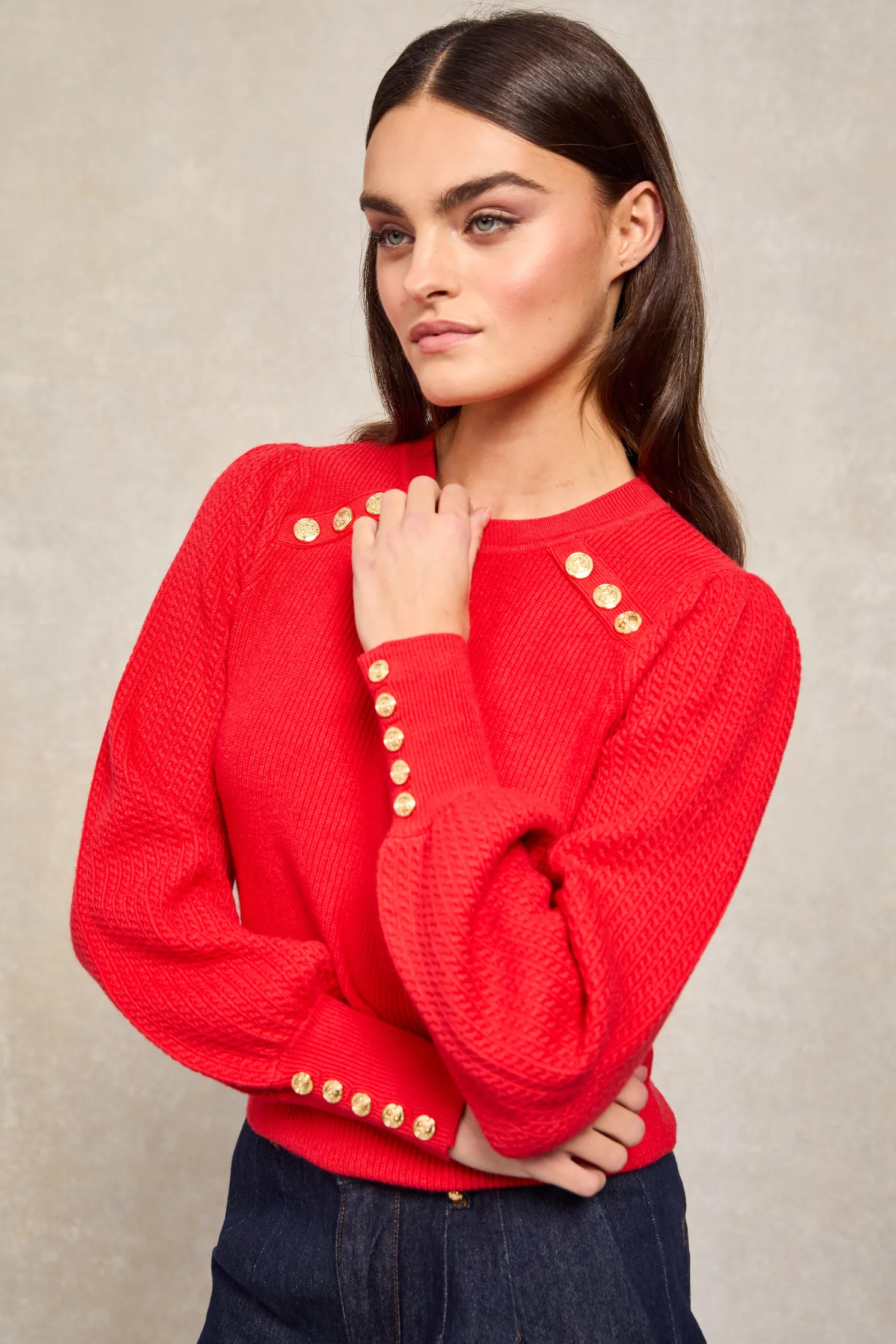 A stylish blend of modern design and classic elegance. The main body features a refined ribbed texture, while the blouson sleeves are adorned with an intricate cable stitch pattern, adding a touch of sophistication. Hardware detailing at the neckline and cuffs enhances the luxurious appeal. With a slim fit throughout the body the Naomi Crew Neck Knit offers both versatility and chic style.