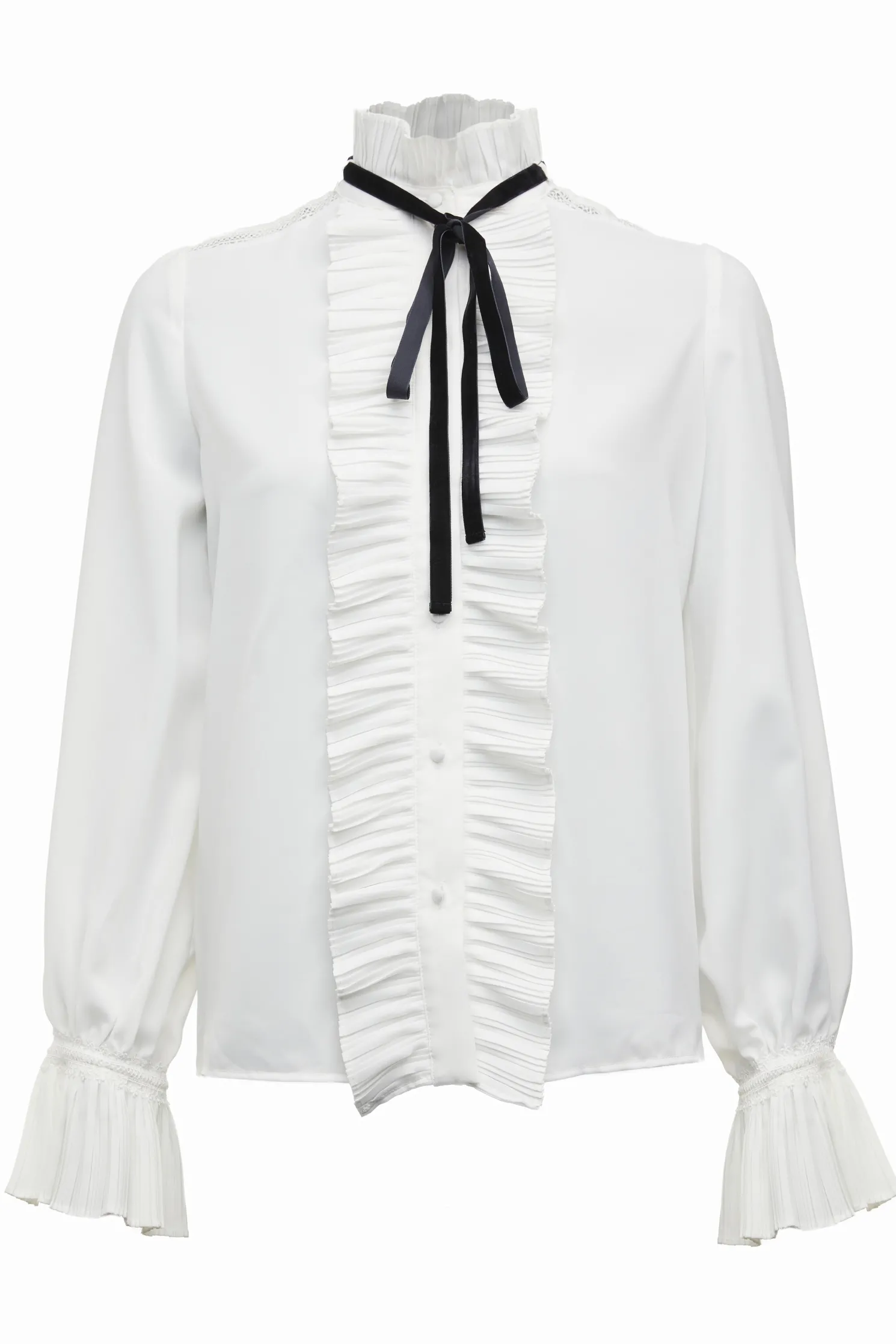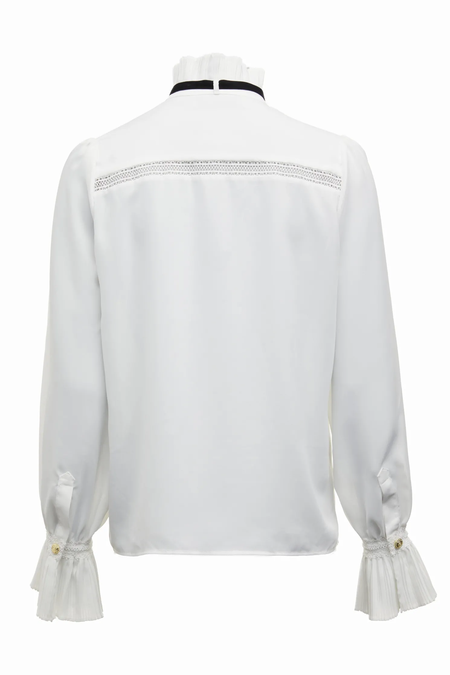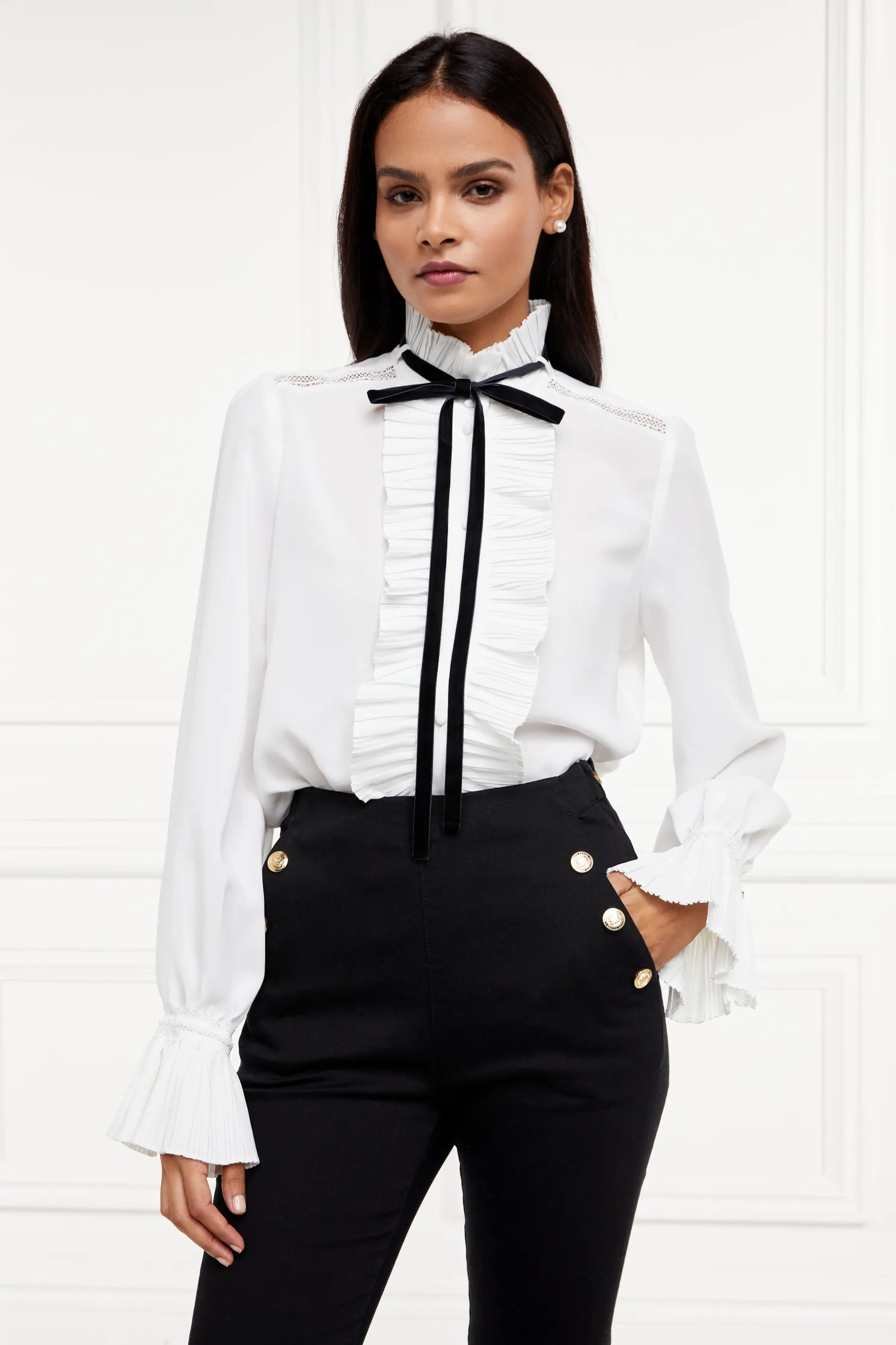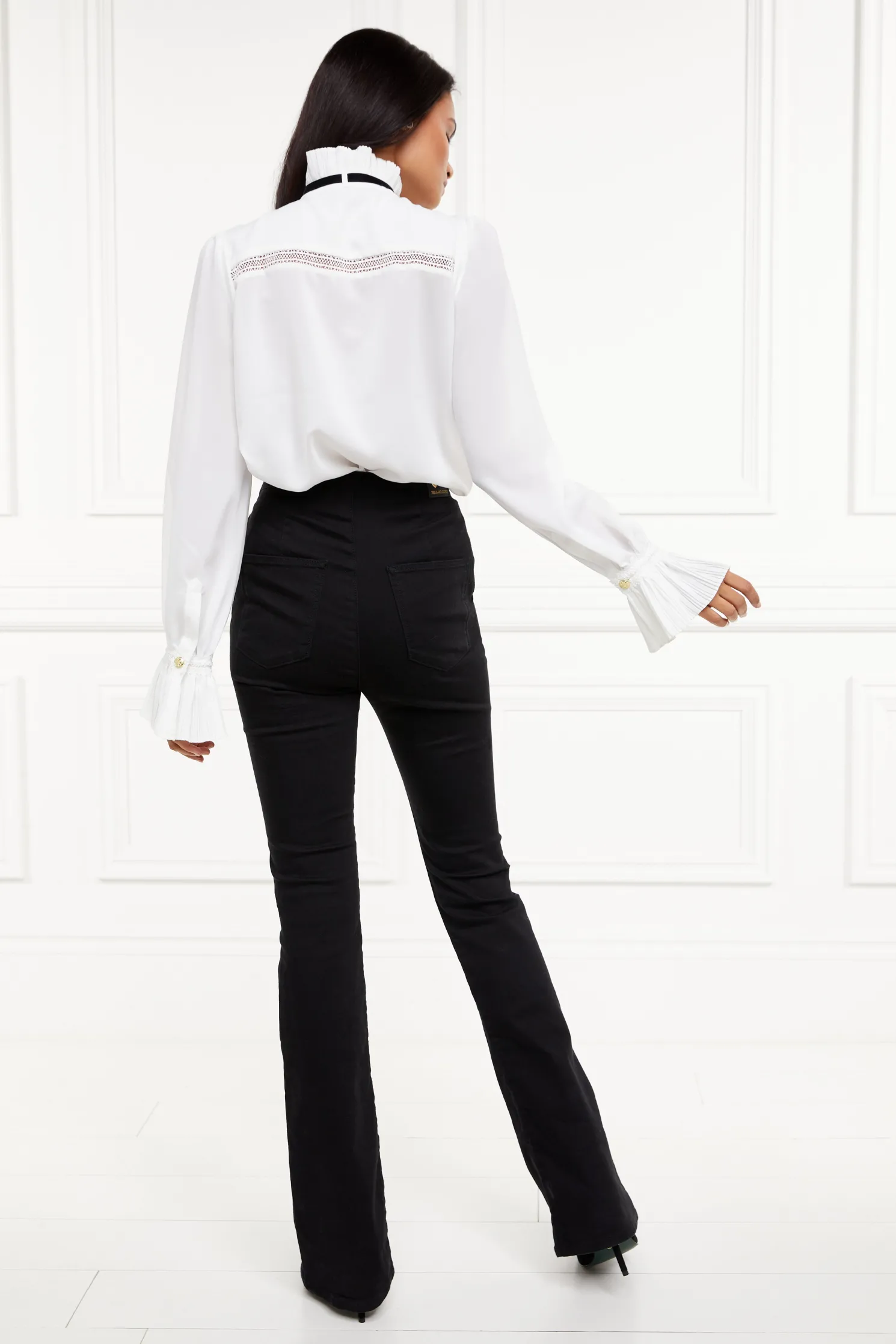 Elegant and sophisticated, the Olivia Tie Shirt has been created with a relaxed yet tailored fit, perfect for any occasion. The shirt has a luxurious, removable velvet tie around the collar along with delicate lace on the shoulders and cuffs. This shirt also features our signature HC gold hardware to the cuff and matched buttons to the front for an elegant look.