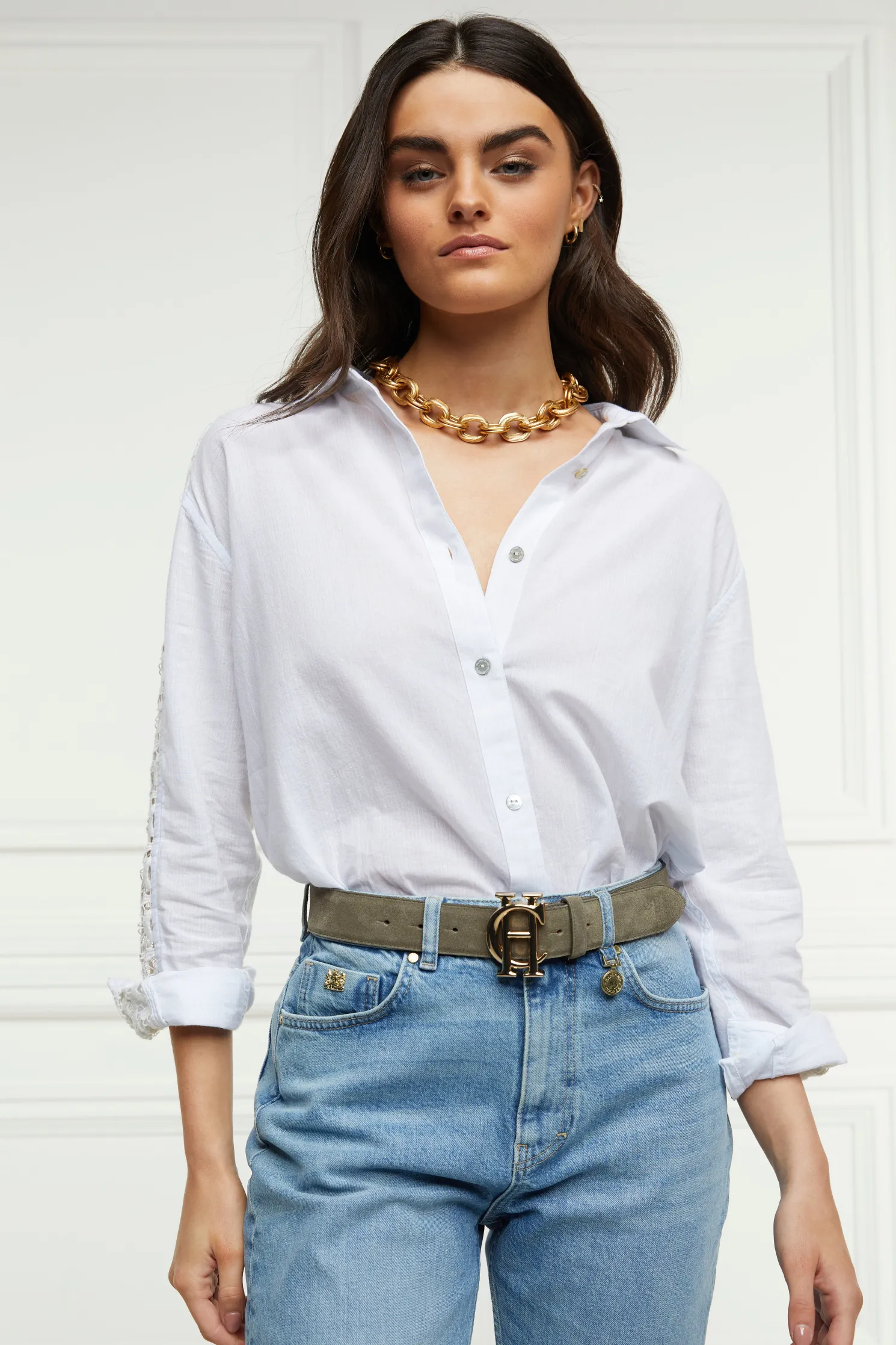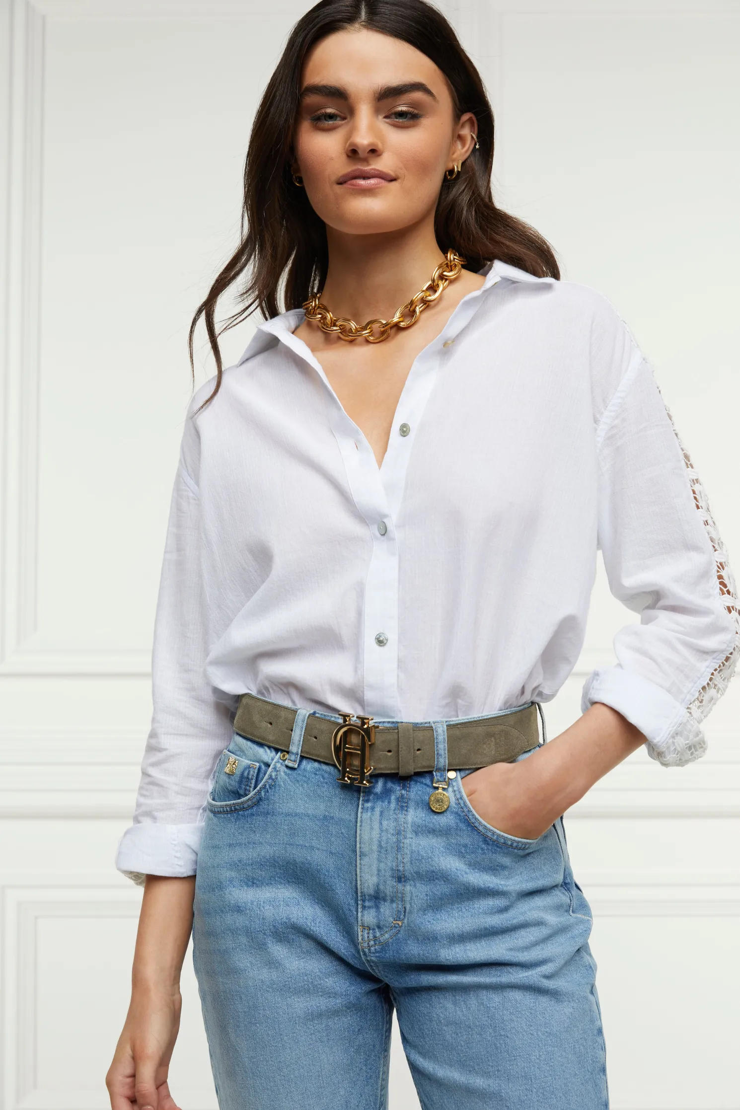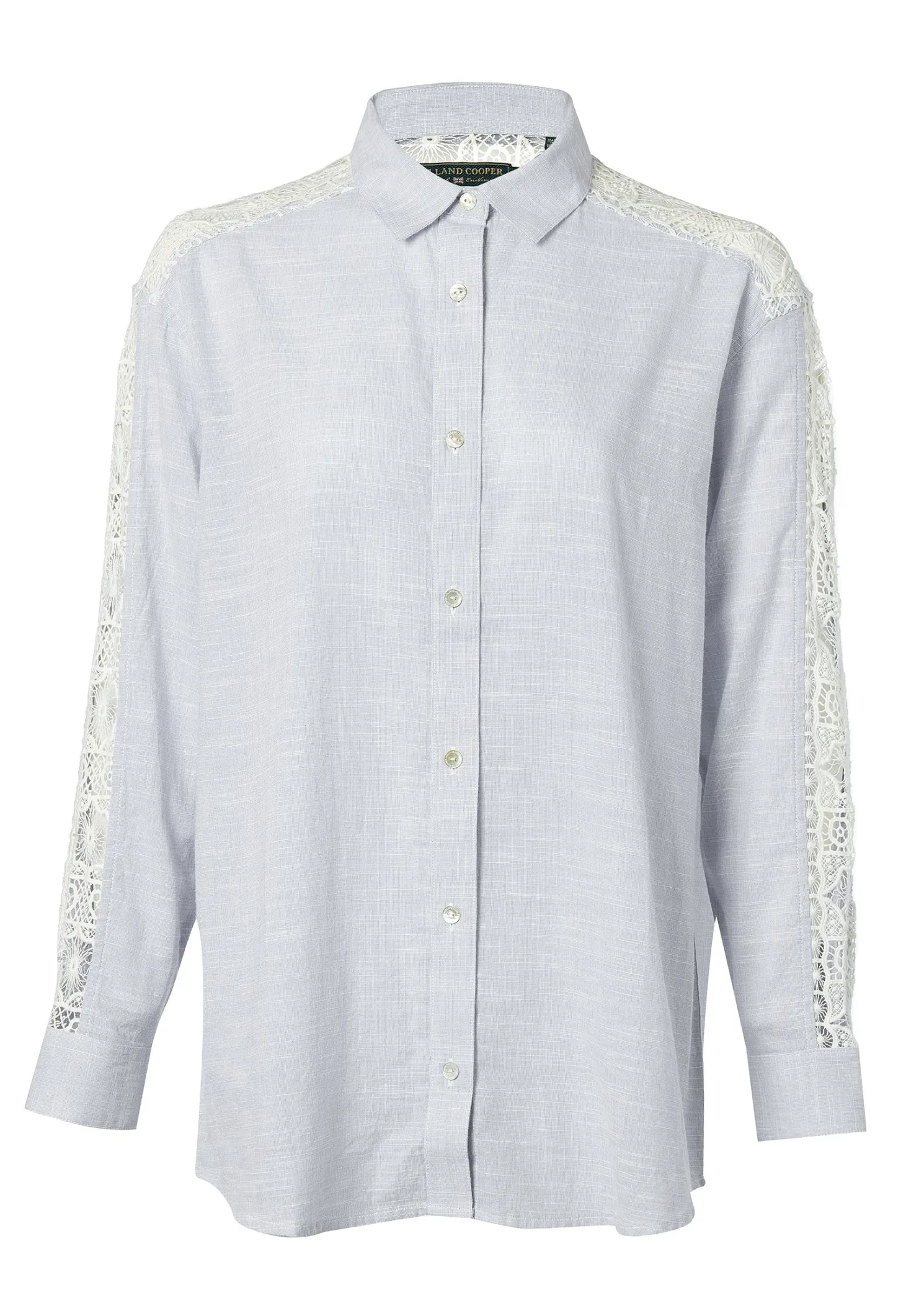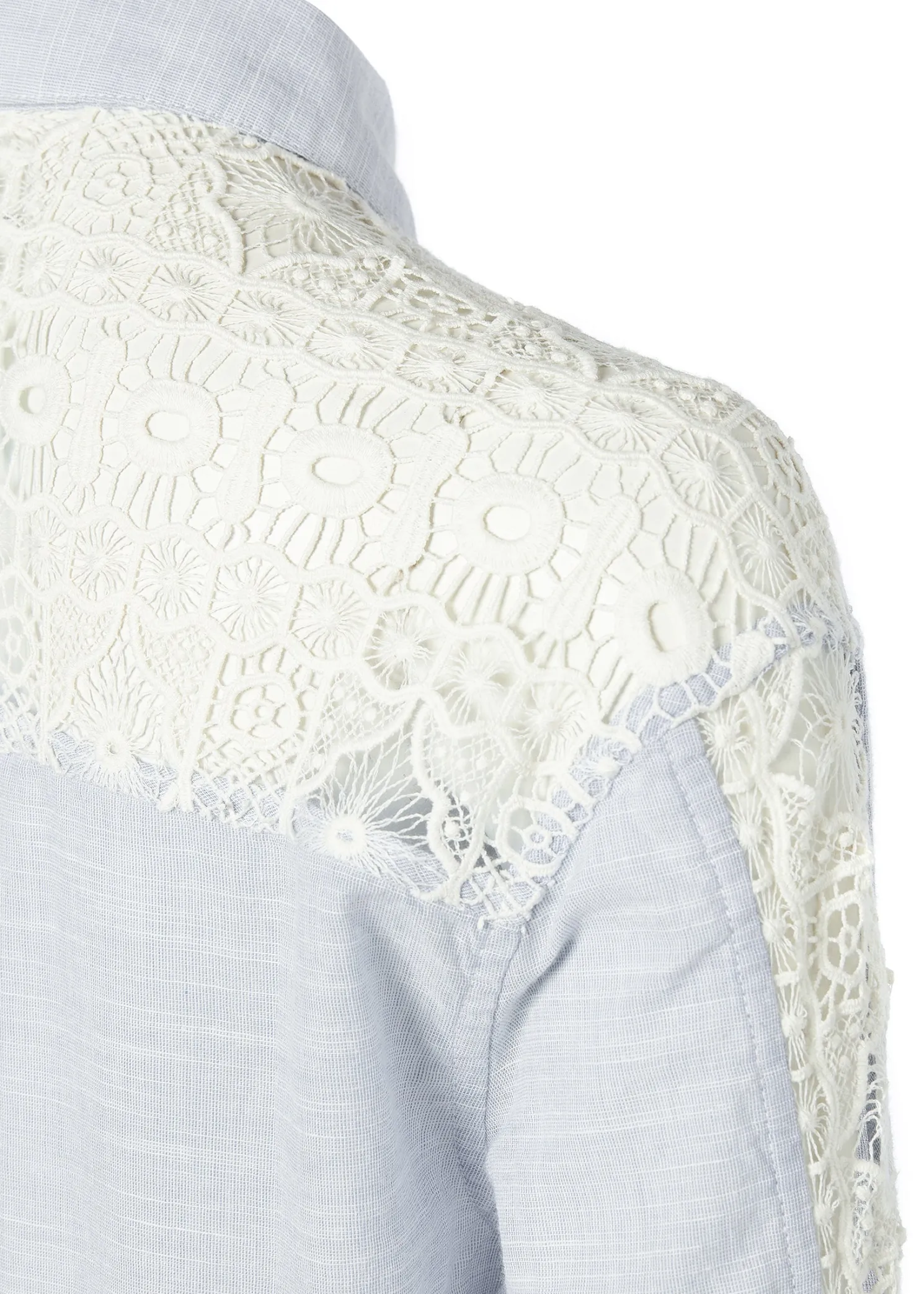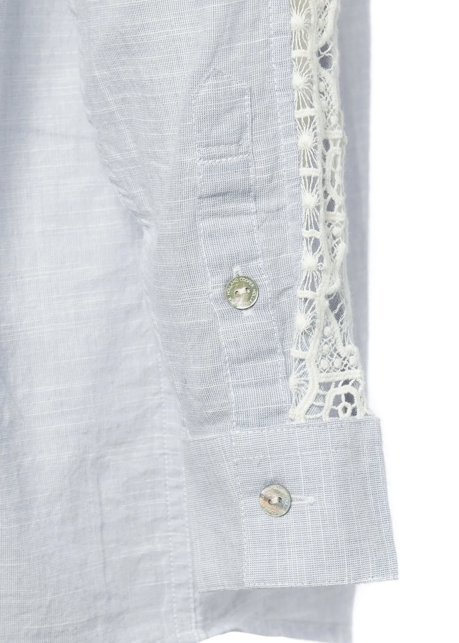 Designed with an oversized and relaxed fit, this piece has been elegantly designed with lace panel details to the sleeves and back yoke. Detailed with a single button cuff and signature hardware. Created from 100% cotton, its the perfect summer staple.