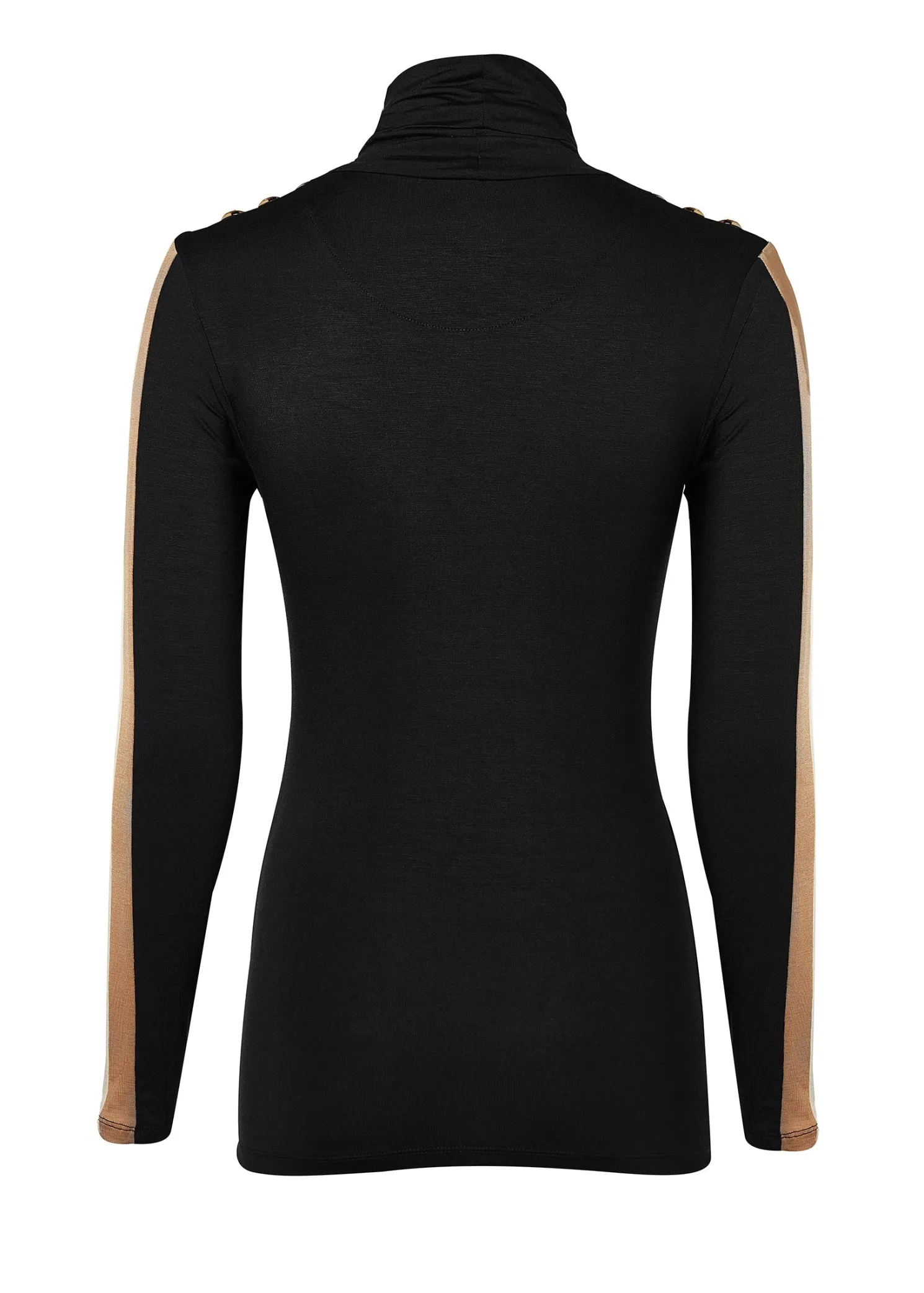Crafted from superior knitted viscose for a luxurious feel, this roll neck has been designed to become an elevated building block in every womans wardrobe. Adorned with HC crested rivets on the shoulders, it exudes sophistication. The super soft fabric ensures comfort and warmth, while the contrast panel running down the sleeve adds a touch of modern flair.