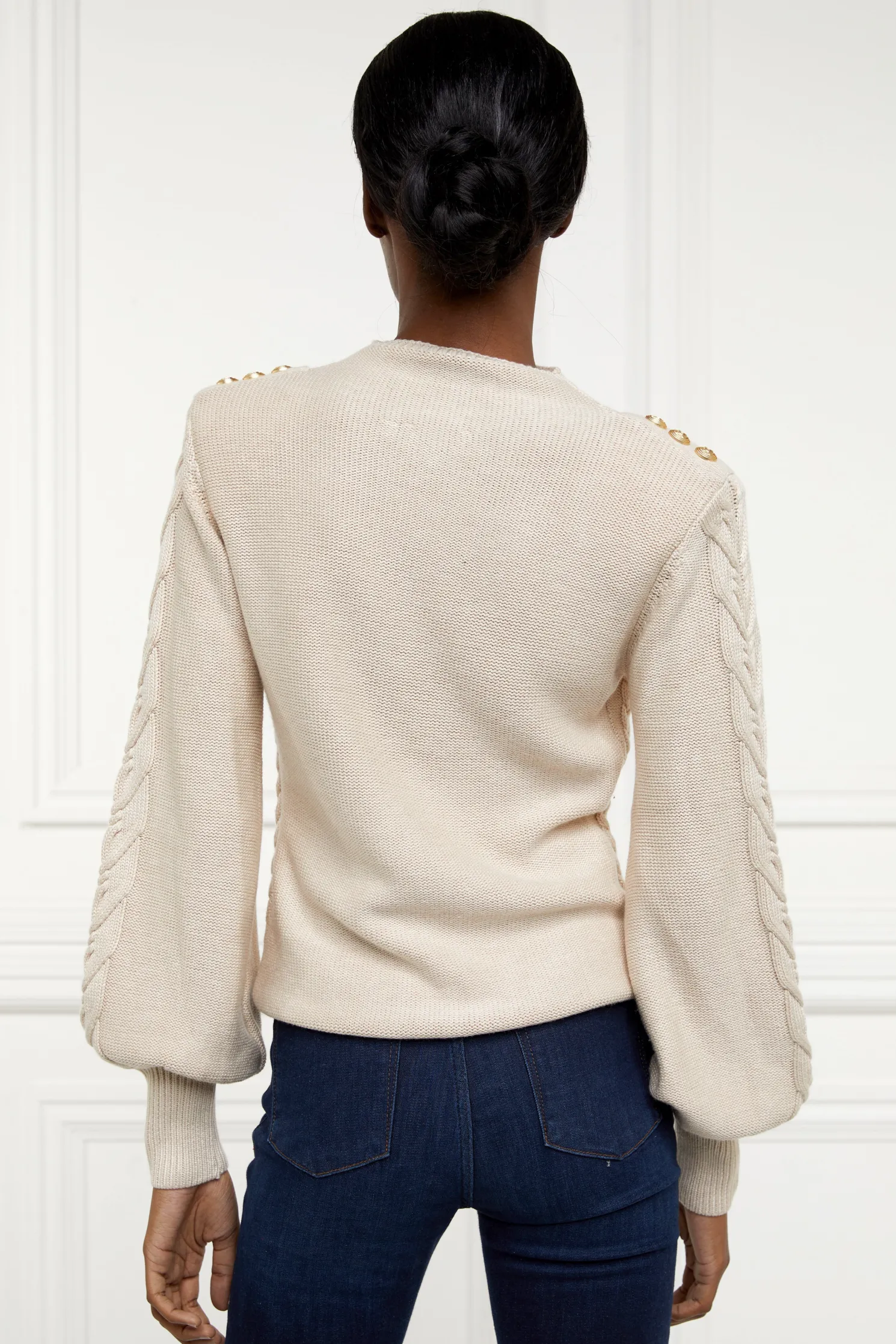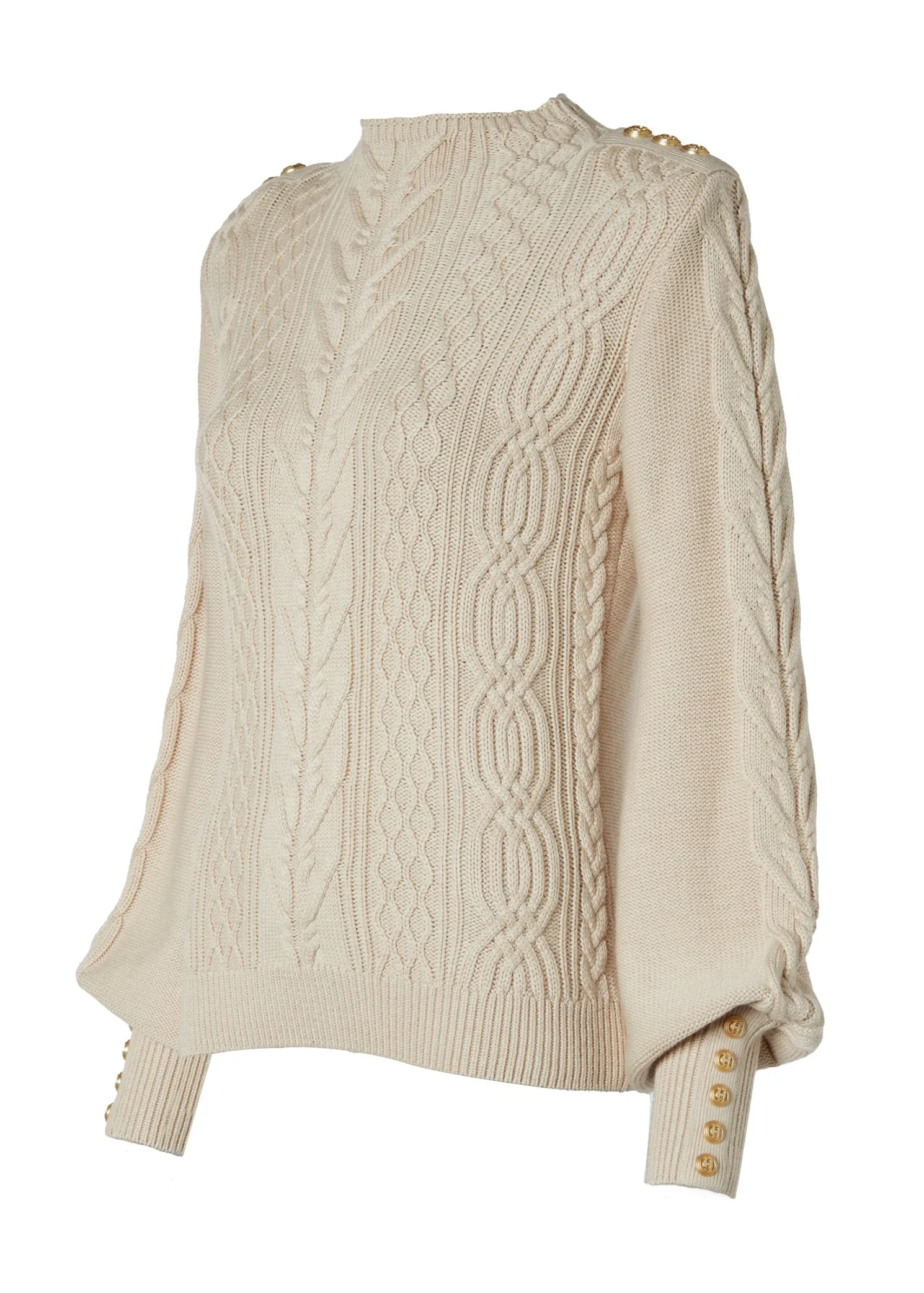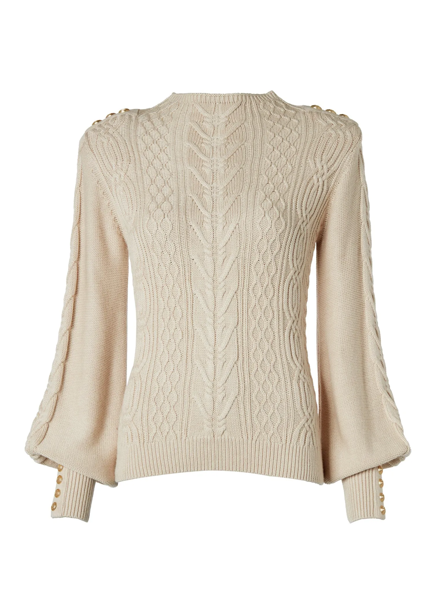 The Rachel Knit is a chic and versatile piece, featuring mixed cabling detail on the front for added texture and depth. With a slim fit throughout the body and full sleeves, this knit offers a flattering silhouette. Signature hardware on the shoulders and cuffs adds a touch of elegance, making it a perfect blend of style and sophistication for any occasion.