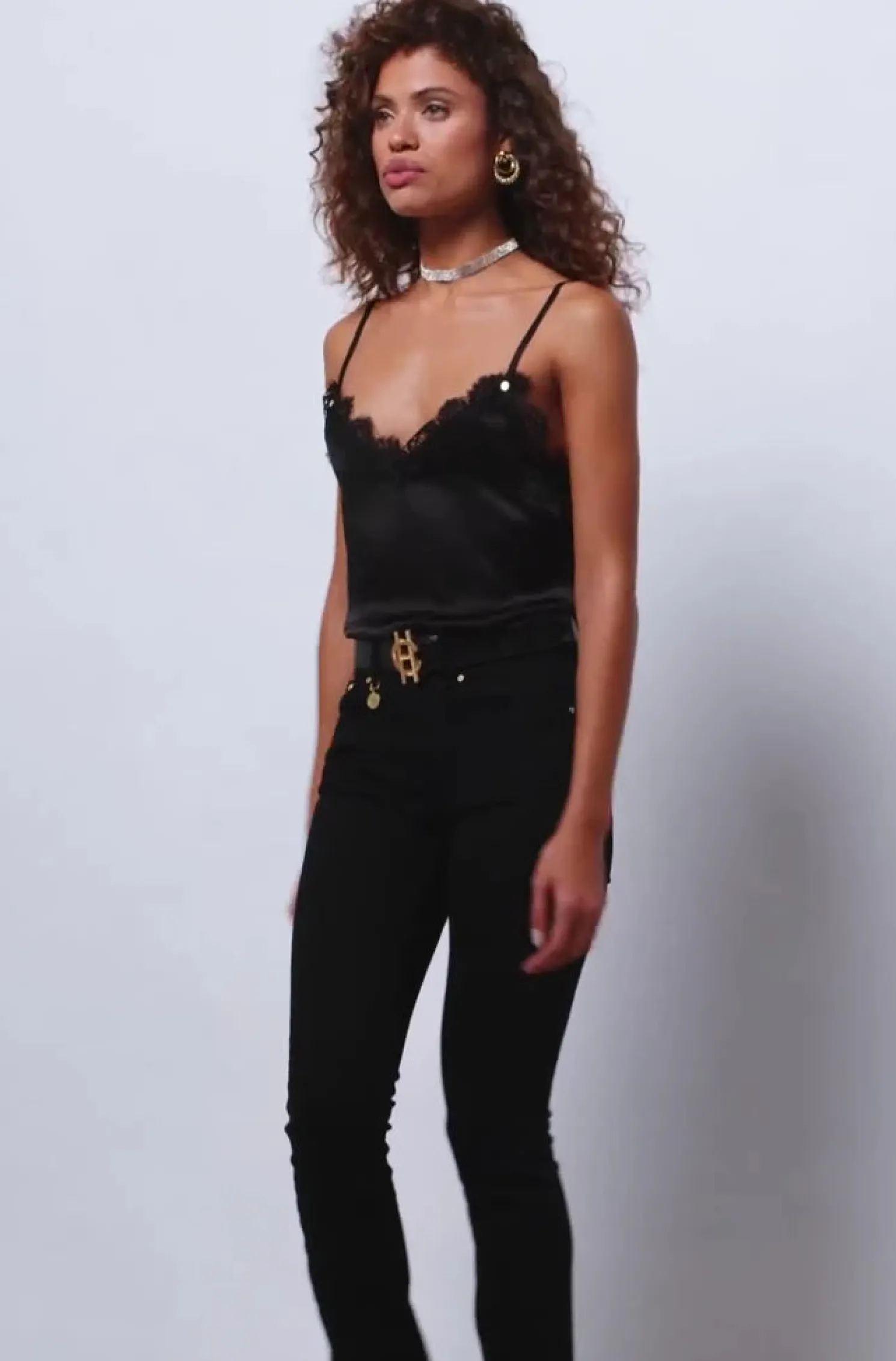 A beautifully luxurious v-neck cami with delicate lace trim to the neckline with adjustable spaghetti straps. Detailed with our HC engraved buttons.
