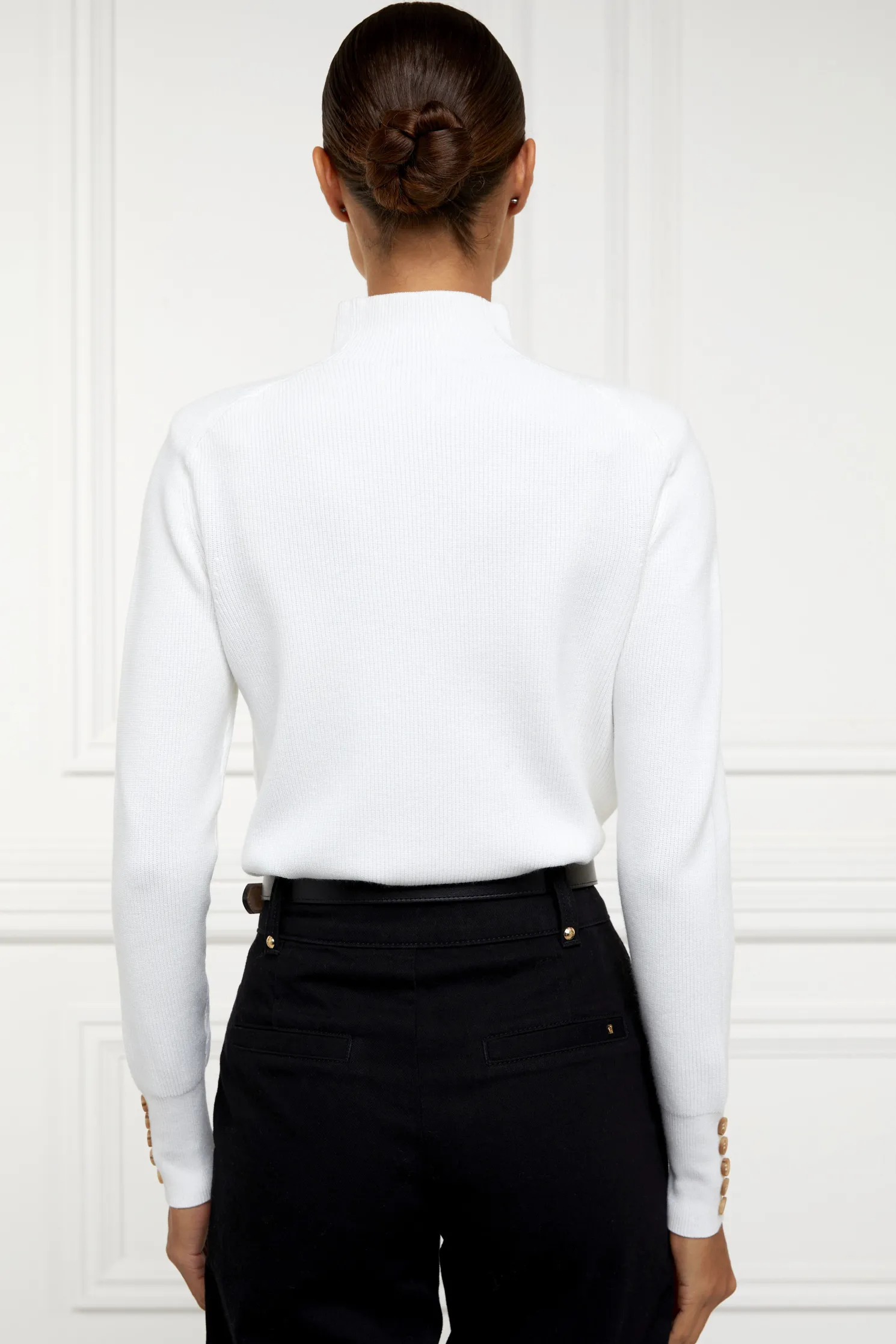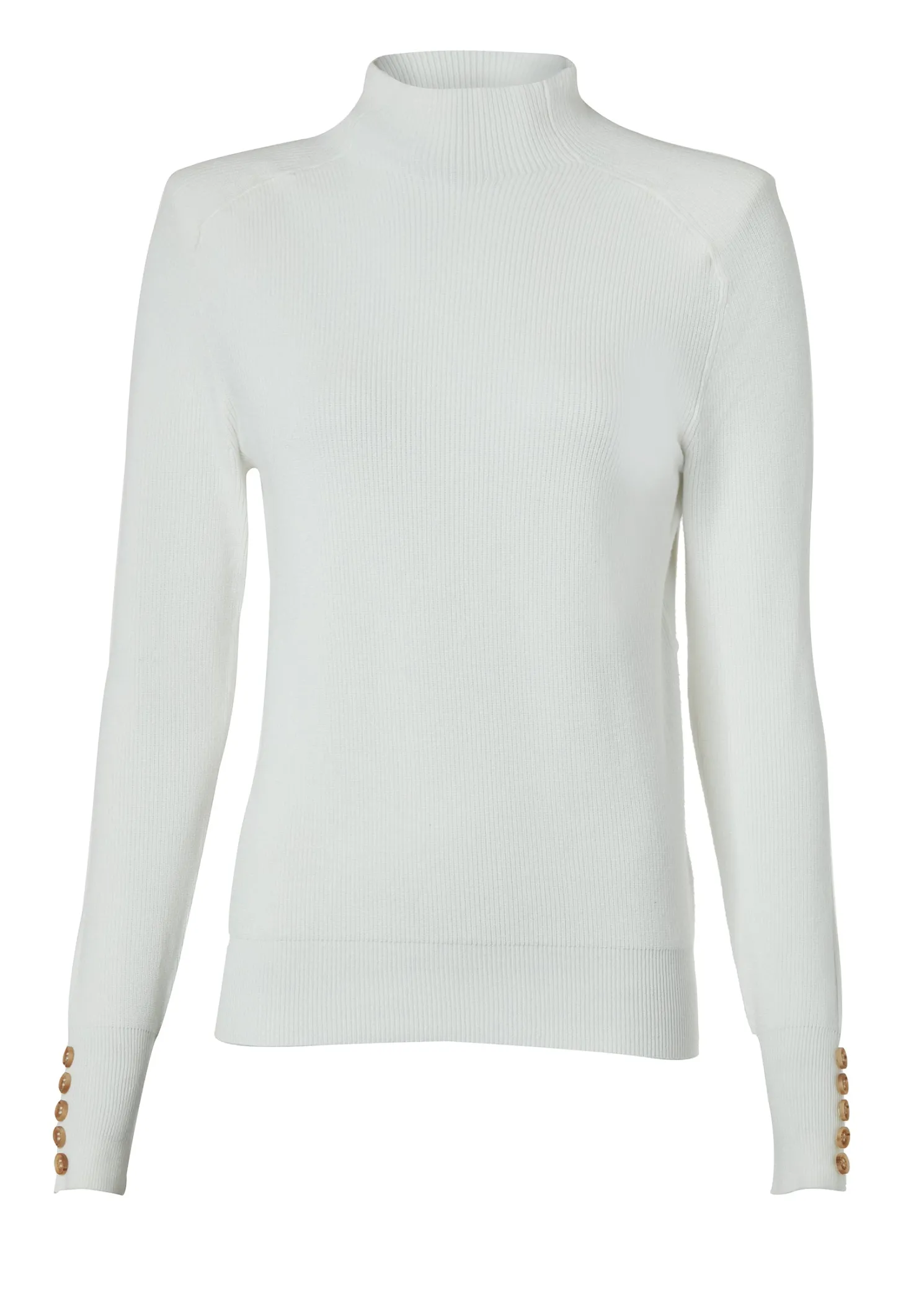 A classic and stylish addition to your wardrobe. This elegant knit features a high neckline and distinctive traveling ribs on the raglan sleeves, adding a unique texture and design. Horn rivets on the cuffs lend a touch of luxury, while the slim fit through the body creates a flattering silhouette. The Tara High Neck Knit is the perfect blend of chic design and refined details, making it an essential piece for any season.