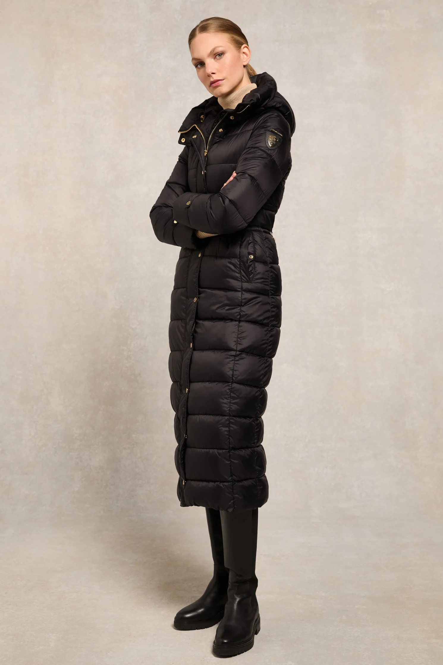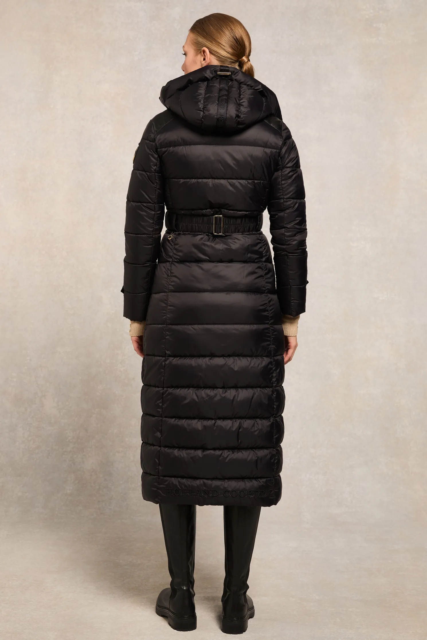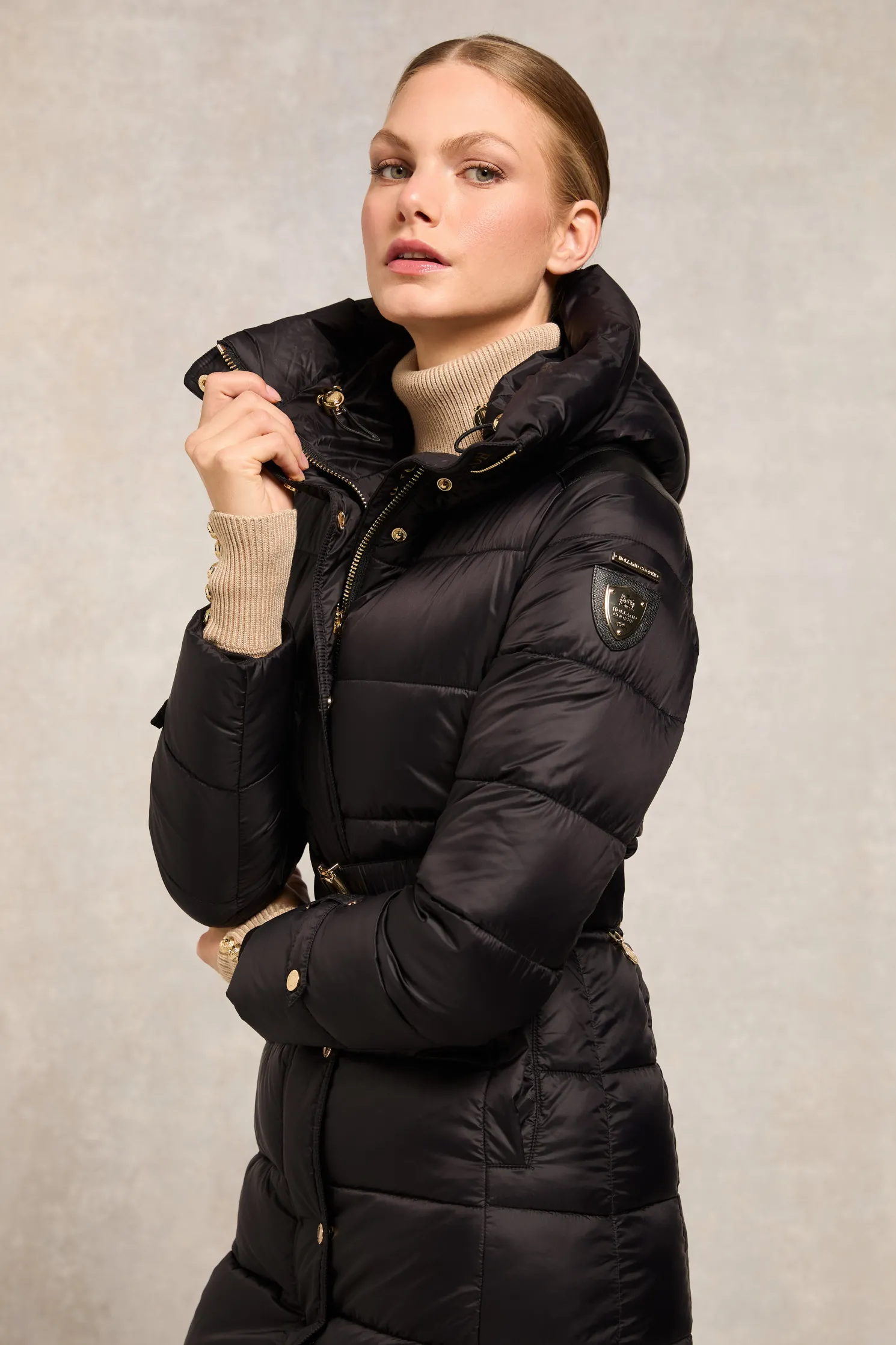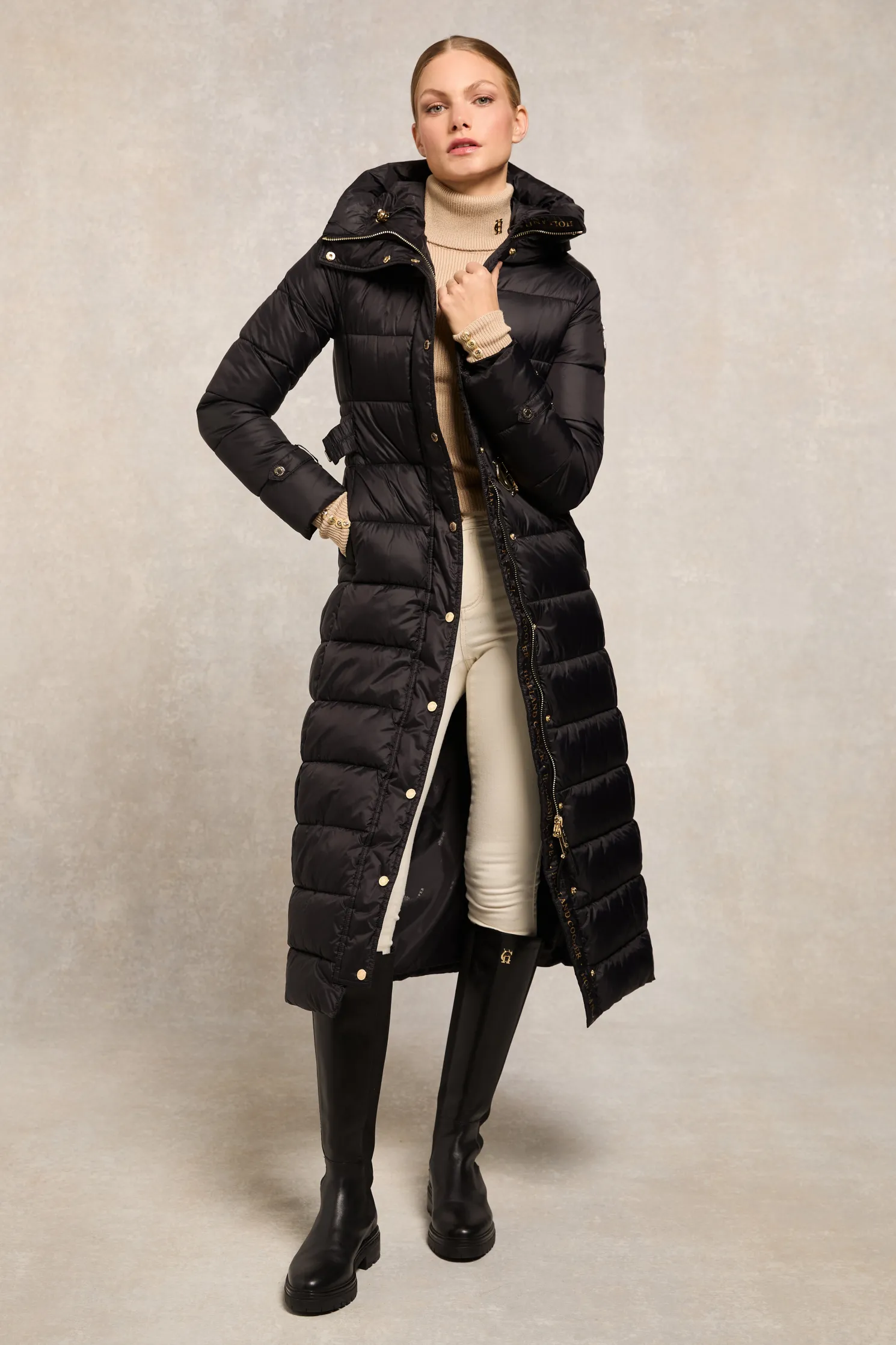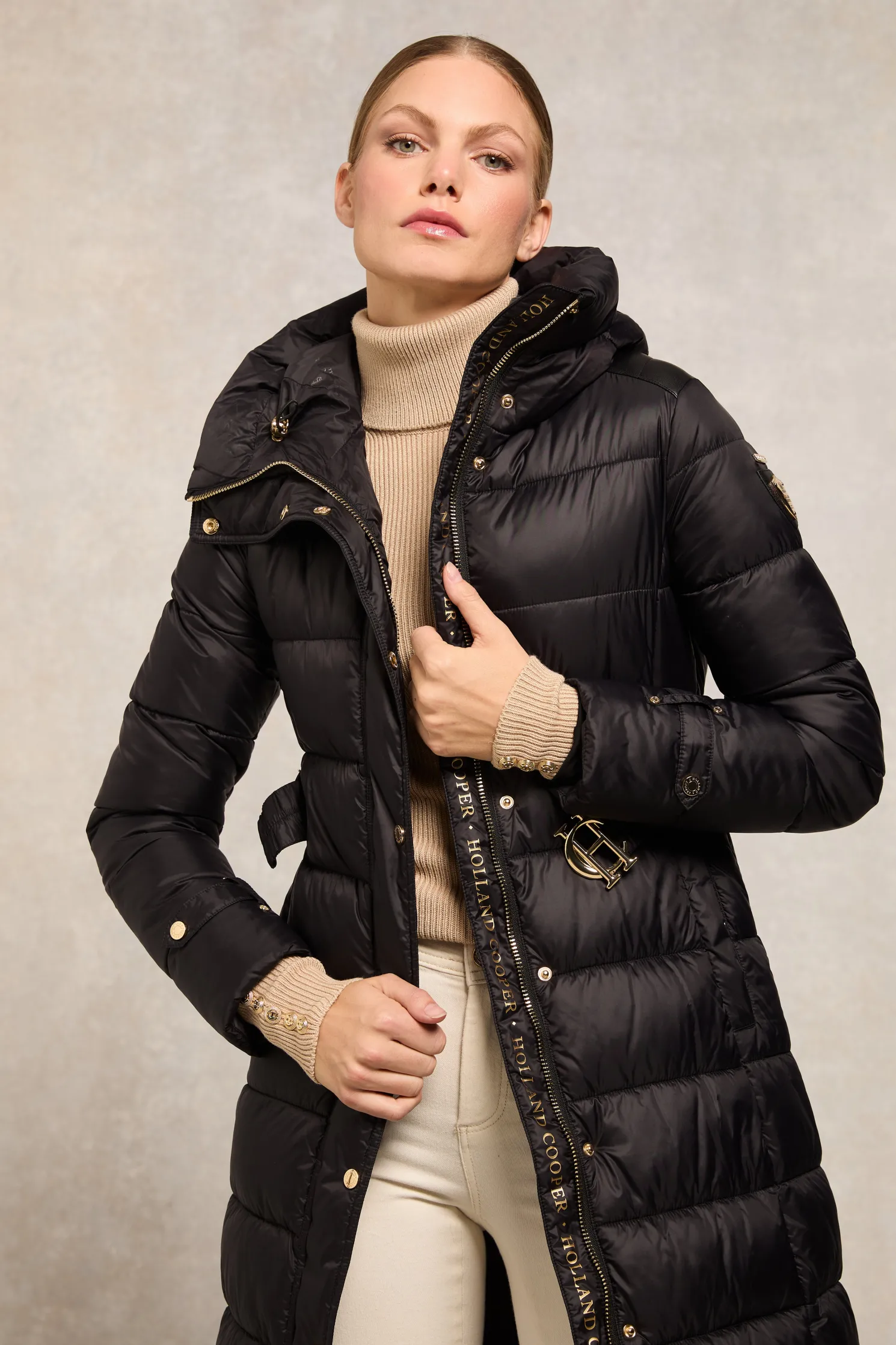 Providing a slimming silhouette with its integrated belt to cinch you in, this coat is an elegant and sophisticated alternative to your typical padded outerwear. Filled with a premium eco fill for ultimate warmth and decorated with gold metal hardware. Detailed with a jacquard branded belt with iconic HC gold buckle with a bold & oversized face-framing hood.