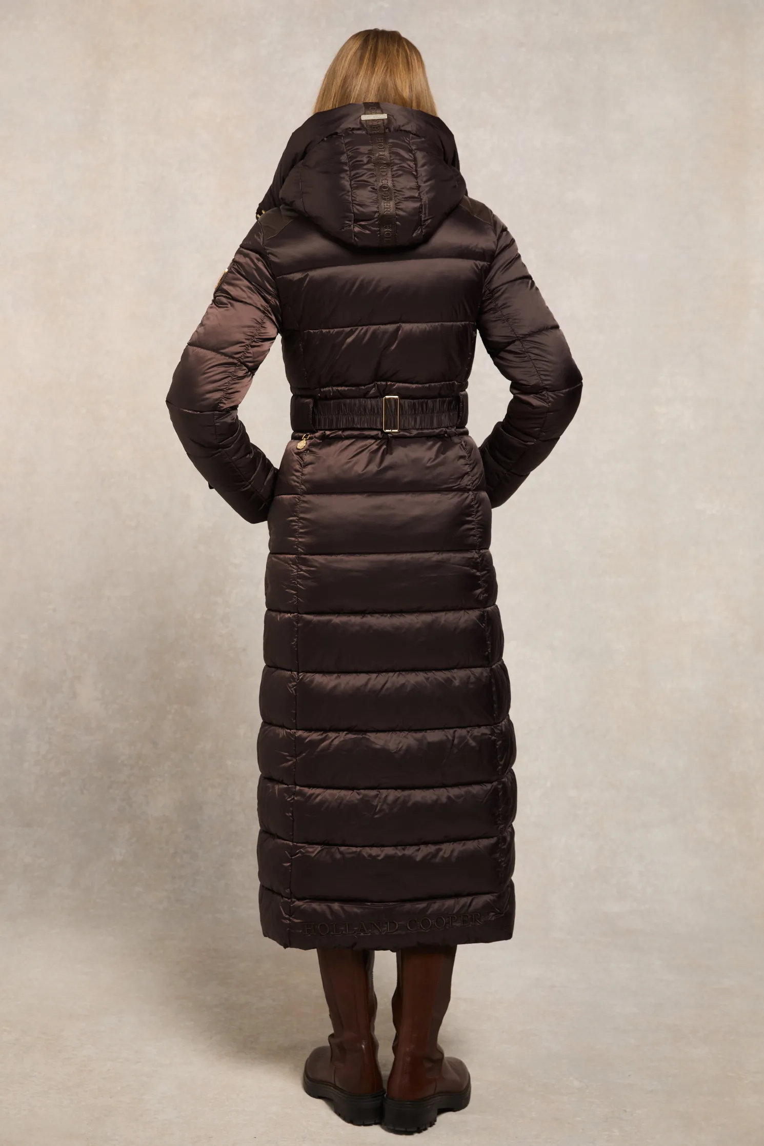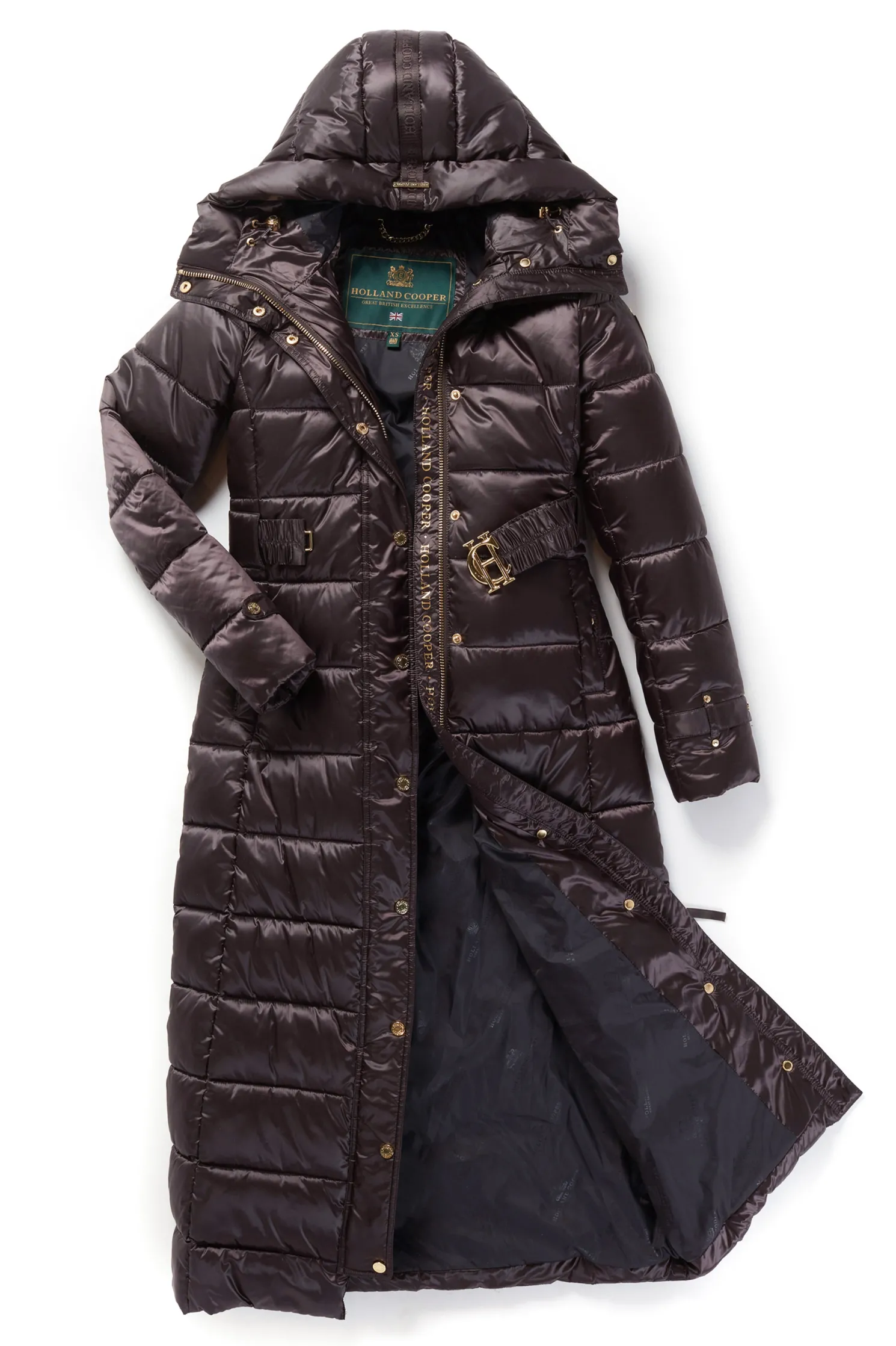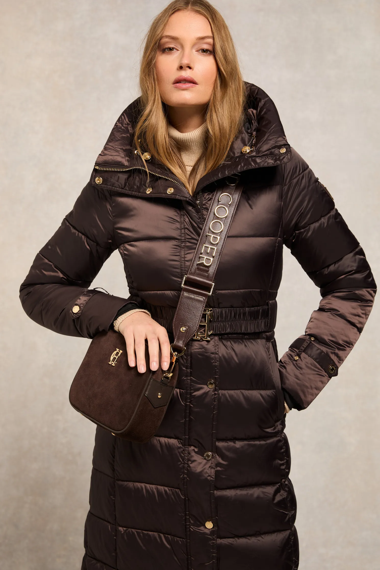 Providing a slimming silhouette with its integrated belt to cinch you in, this coat is an elegant and sophisticated alternative to your typical padded outerwear. Filled with a premium eco fill for ultimate warmth and decorated with gold metal hardware. Detailed with a jacquard branded belt with iconic HC gold buckle with a bold & oversized face-framing hood.