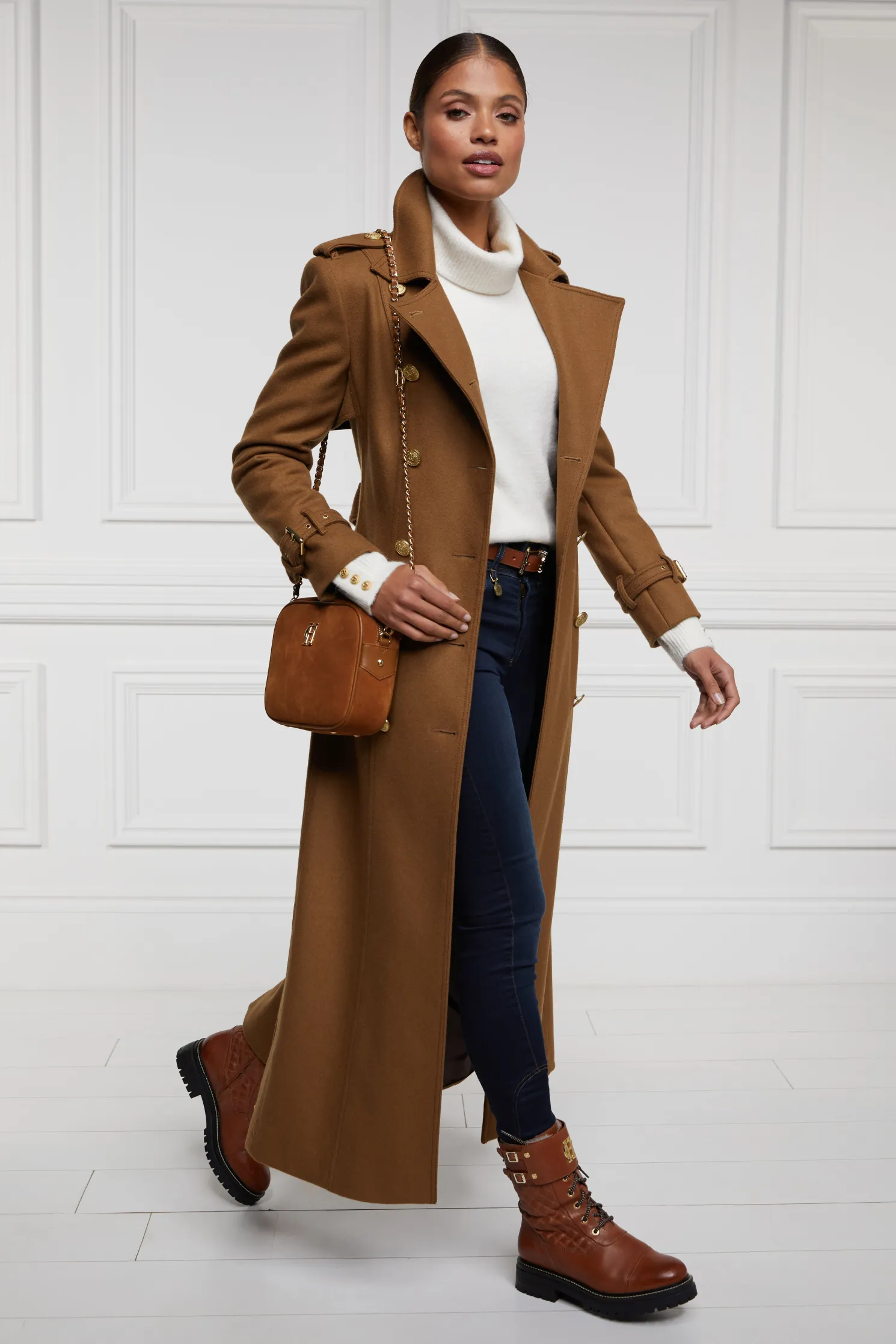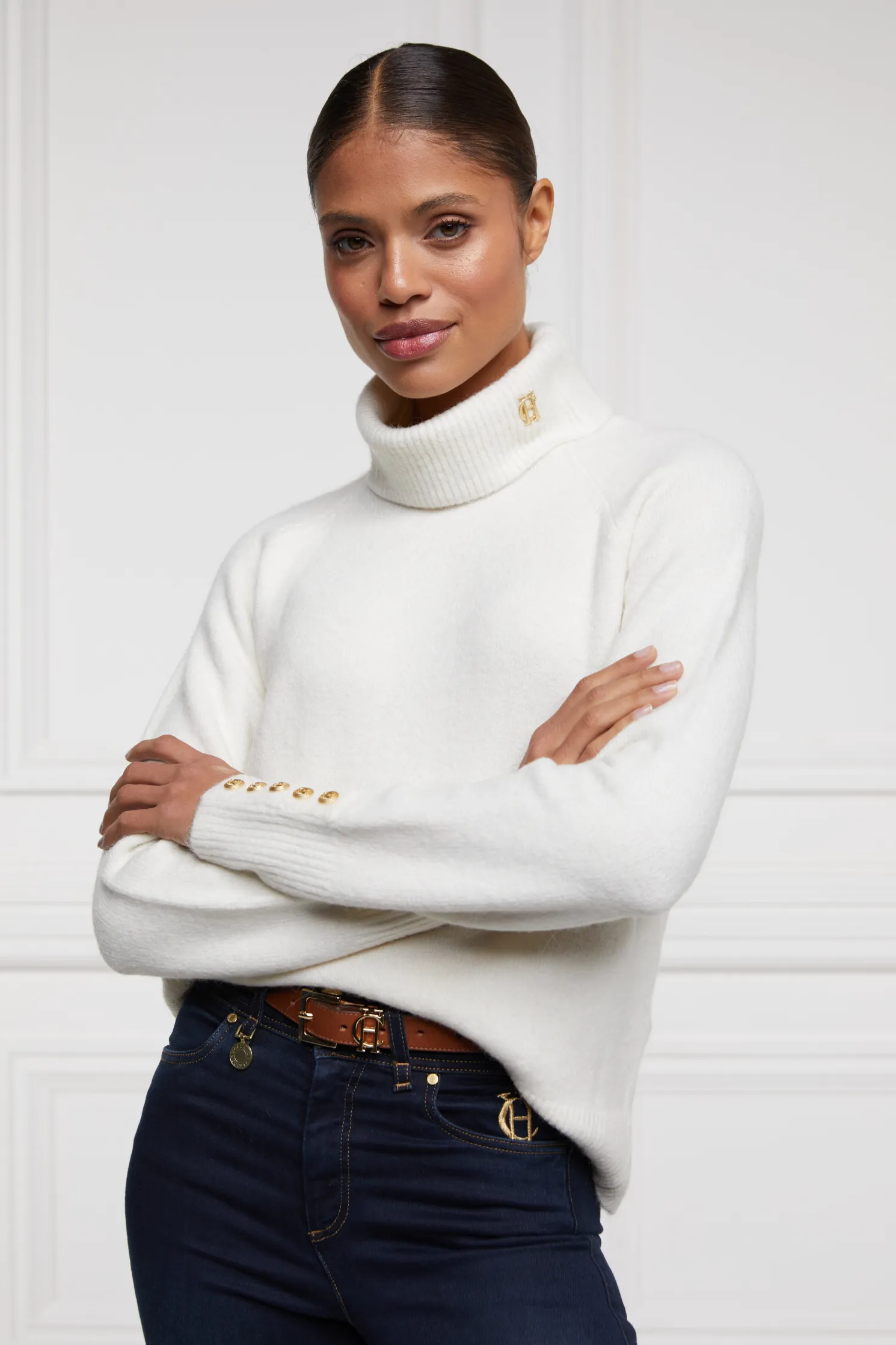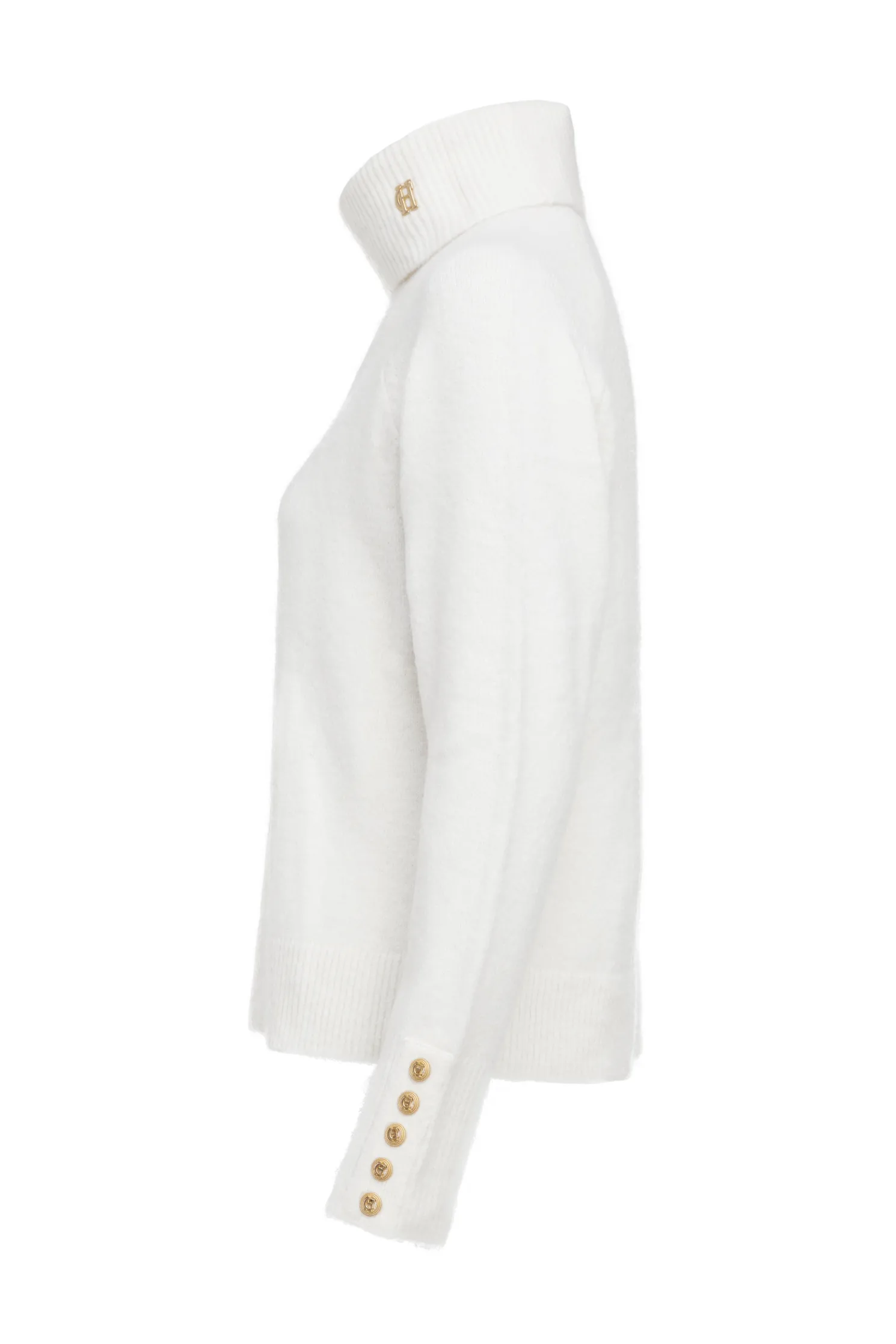 Crafted from a soft, textured wool, this knit has been designed with a relaxed fit and voluminous sleeves which elegantly pull into a ribbed cuff. Elevated with our signature hardware and a HC pin placed on the roll neck.