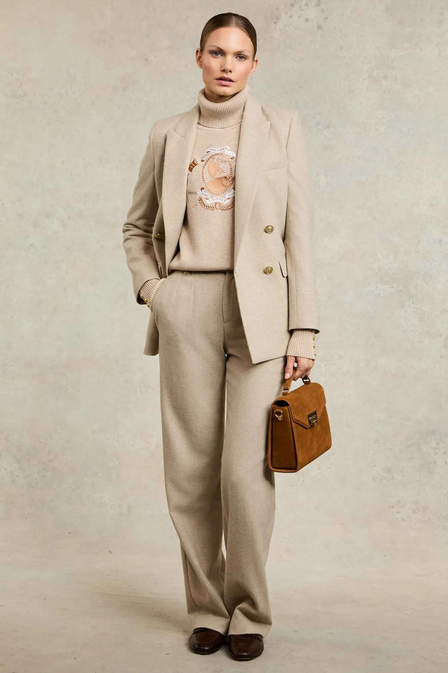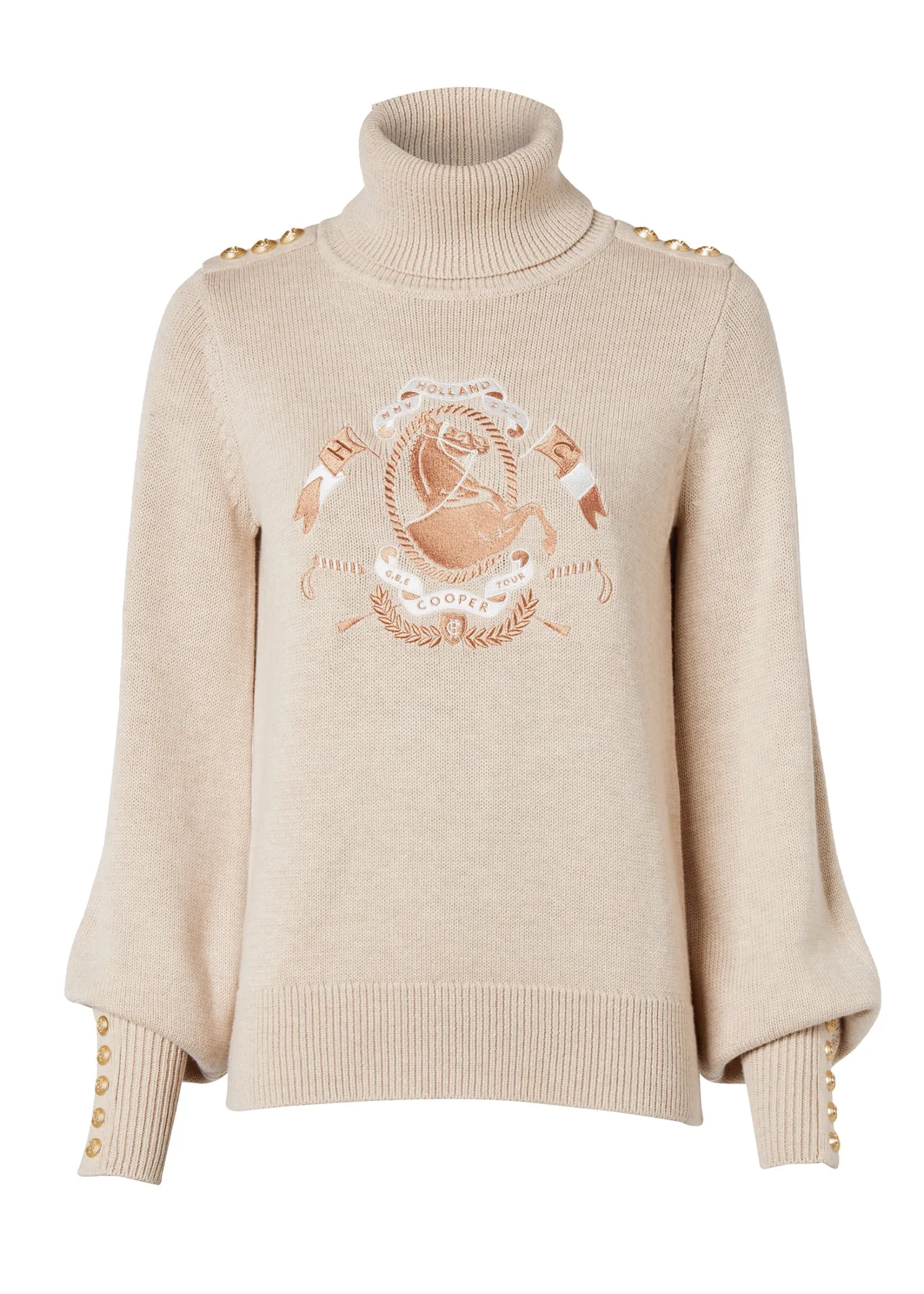 Expertly crafted from a premium wool and mohair blend that promises exceptional warmth. Designed for a relaxed fit through the body, it offers effortless style and comfort, making it an essential addition to any wardrobe. The raglan full sleeves provide a modern flattering silhouette, while the iconic HC hardware on the cuffs adds significant elegance and a chic focal point.