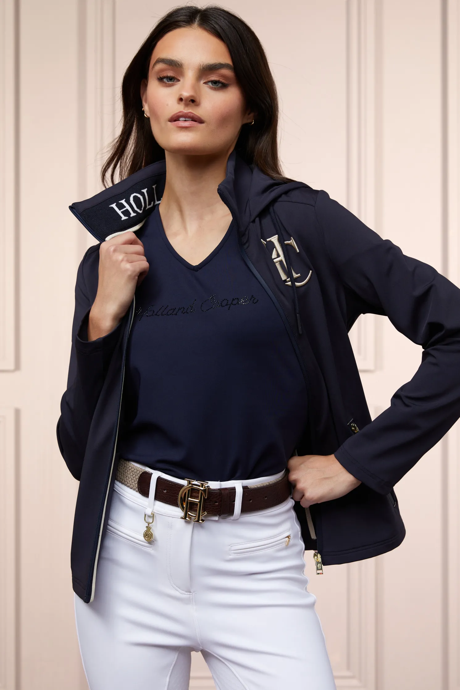 Designed for a relaxed fit, this top features a v-neckline for a flattering look. The chest is adorned with a crystal HC accent adding a touch of elegance to the simplicity. With short sleeves and a smooth, soft-touch fabric, this top is both comfortable and chic. Machine washable, making it a versatile and easy to care for riding essential.