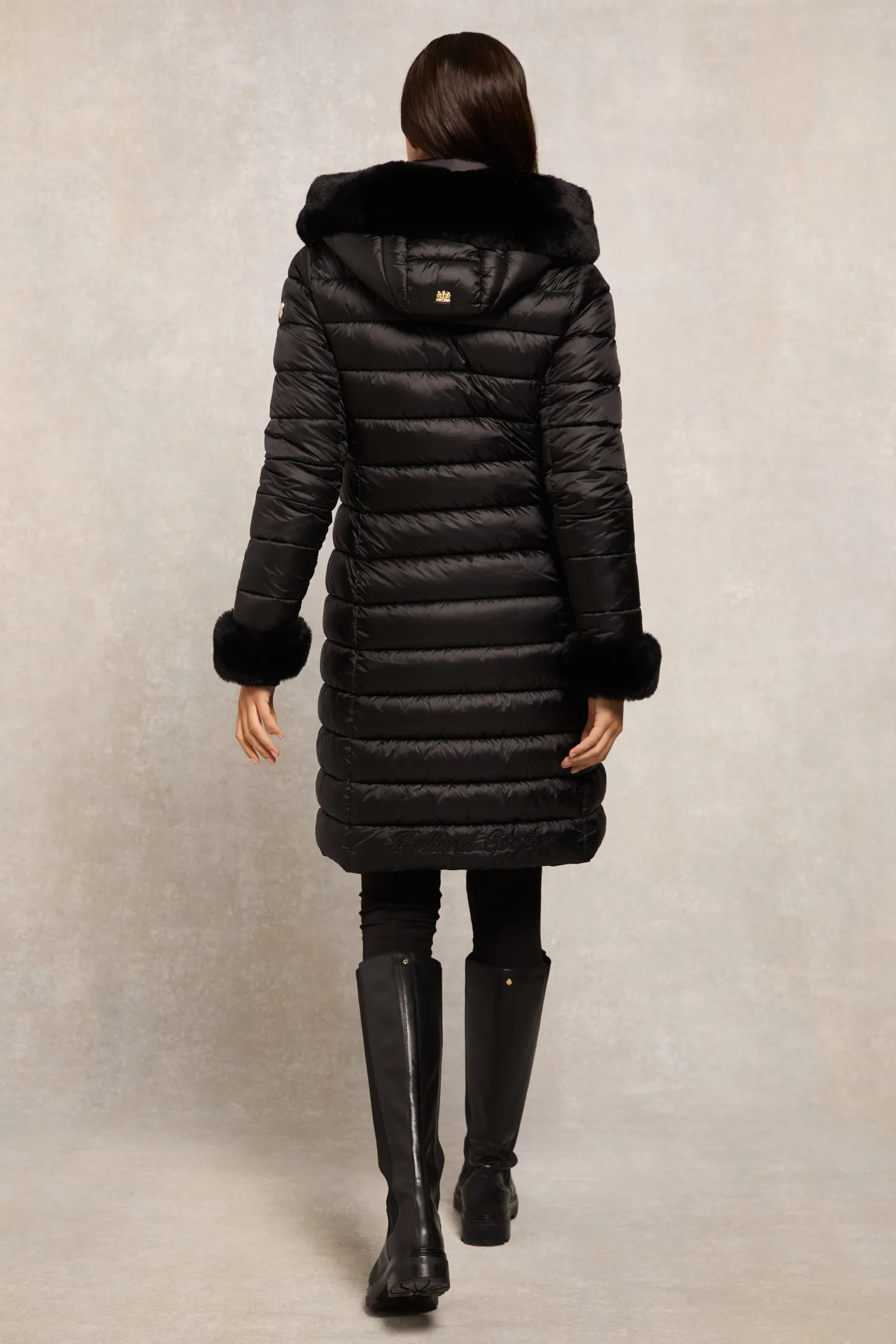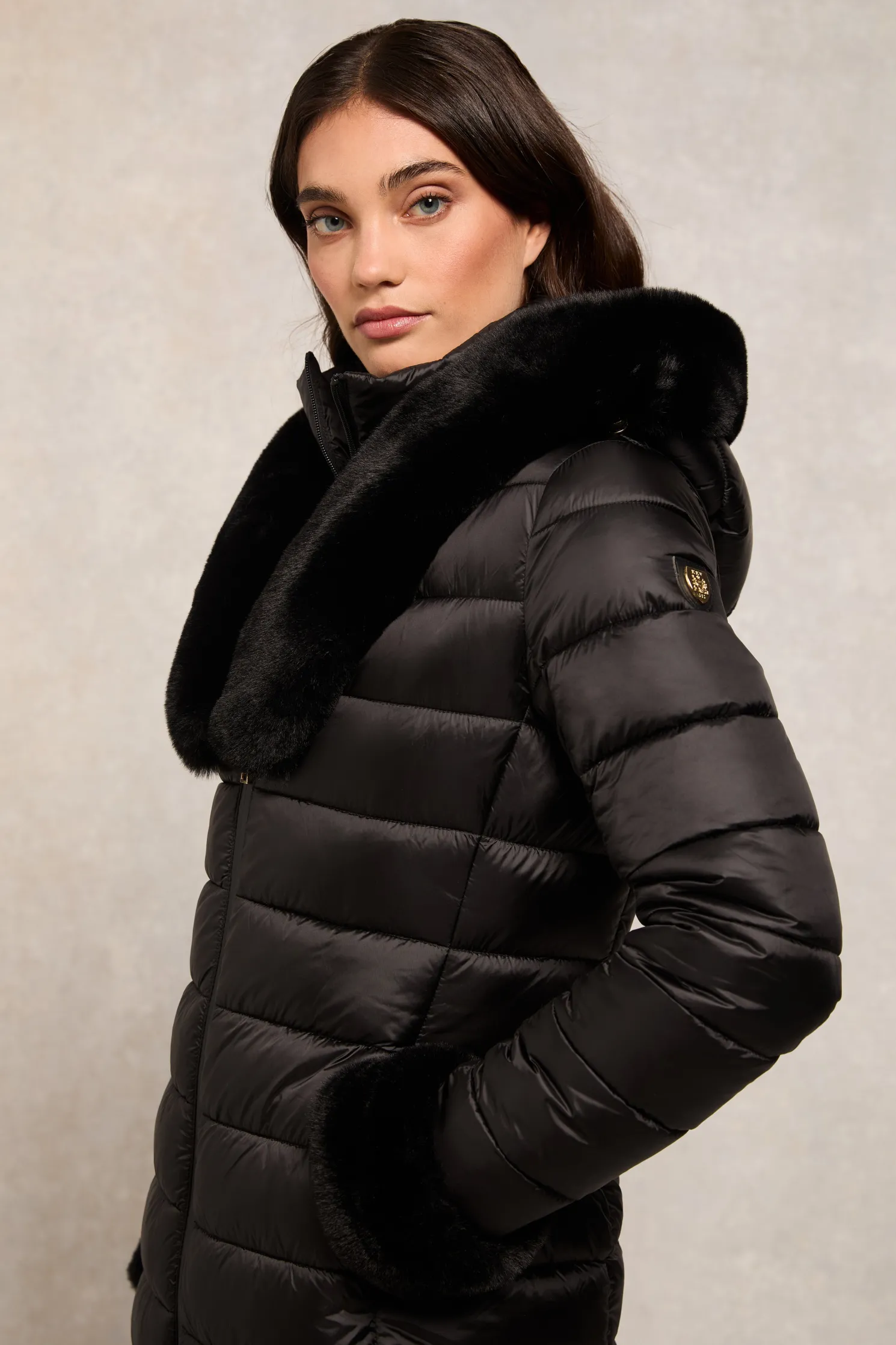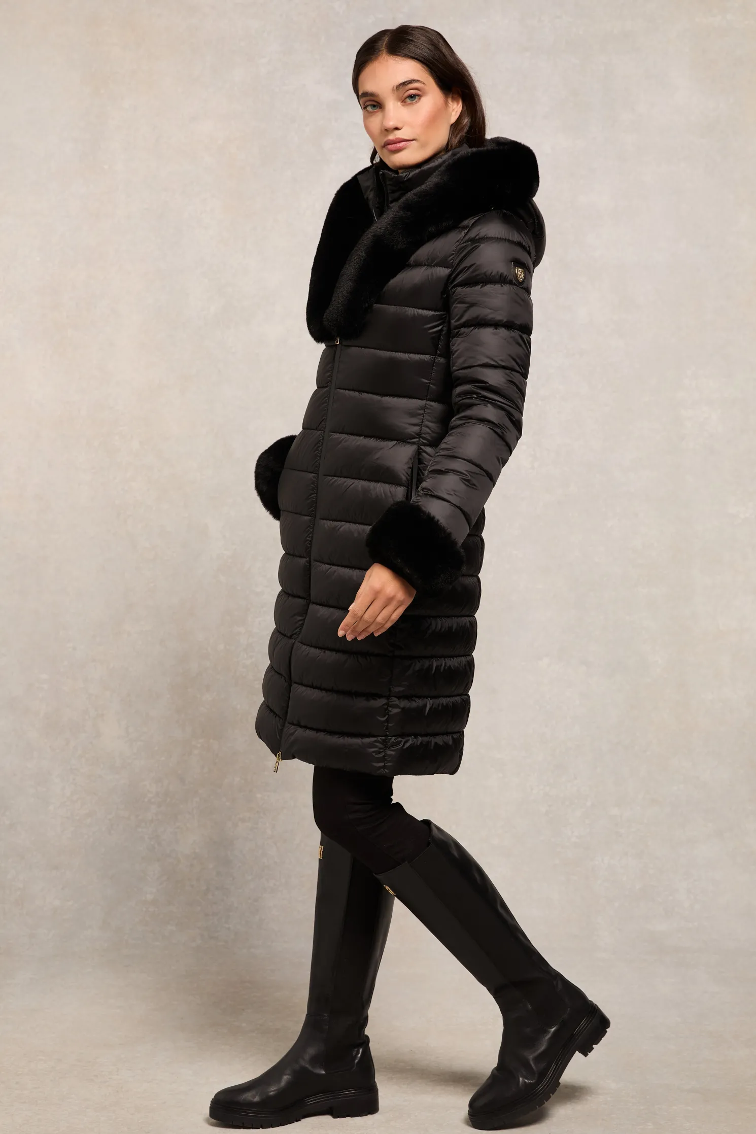 Inspired by our iconic Aspen Coat, this coat has been designed with a flattering length and silhouette whilst ensuring all the practicalities needed from a winter coat. Designed with a mock front gilet with elegant, removable faux trims, this coat has a chic and vintage aesthetic.