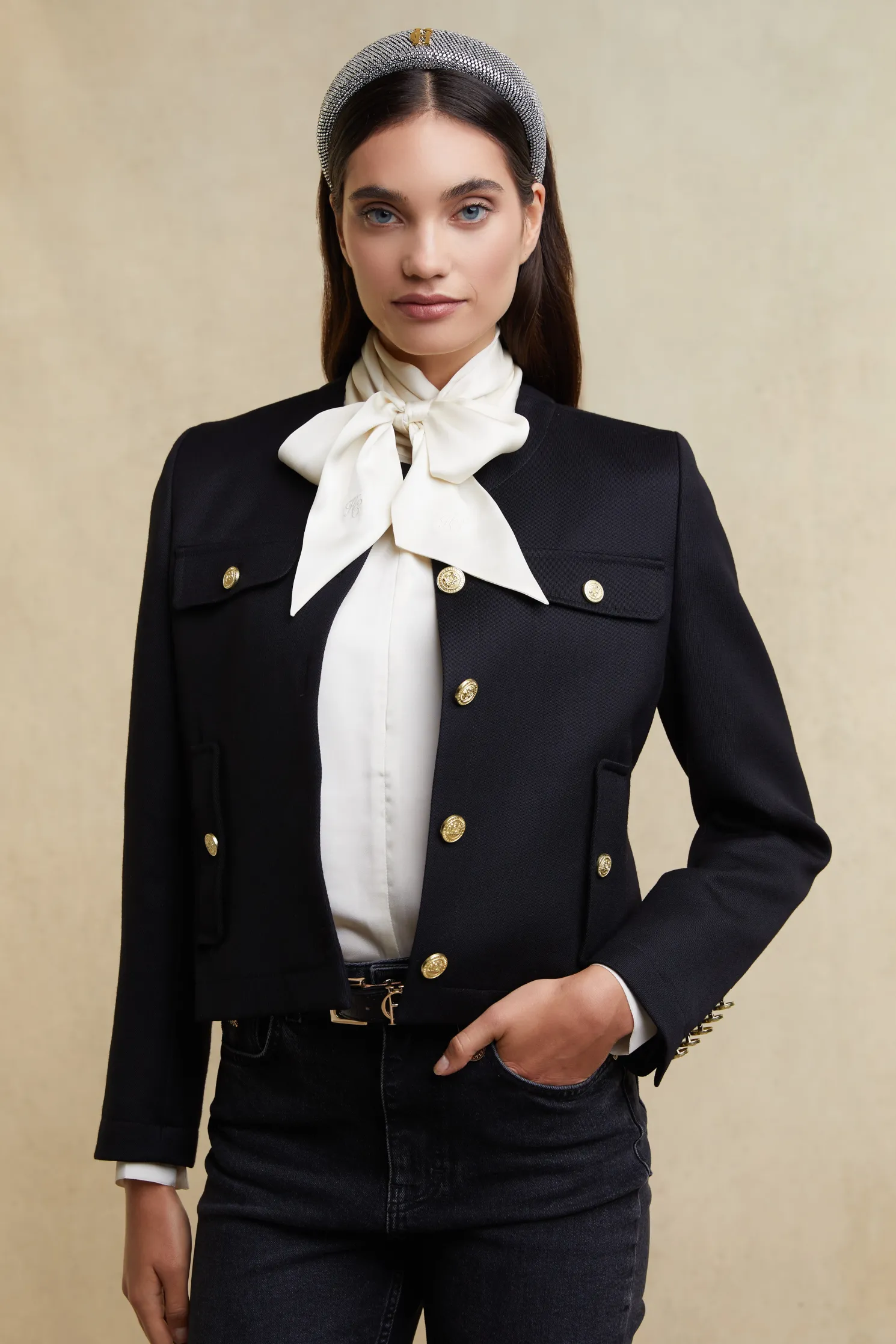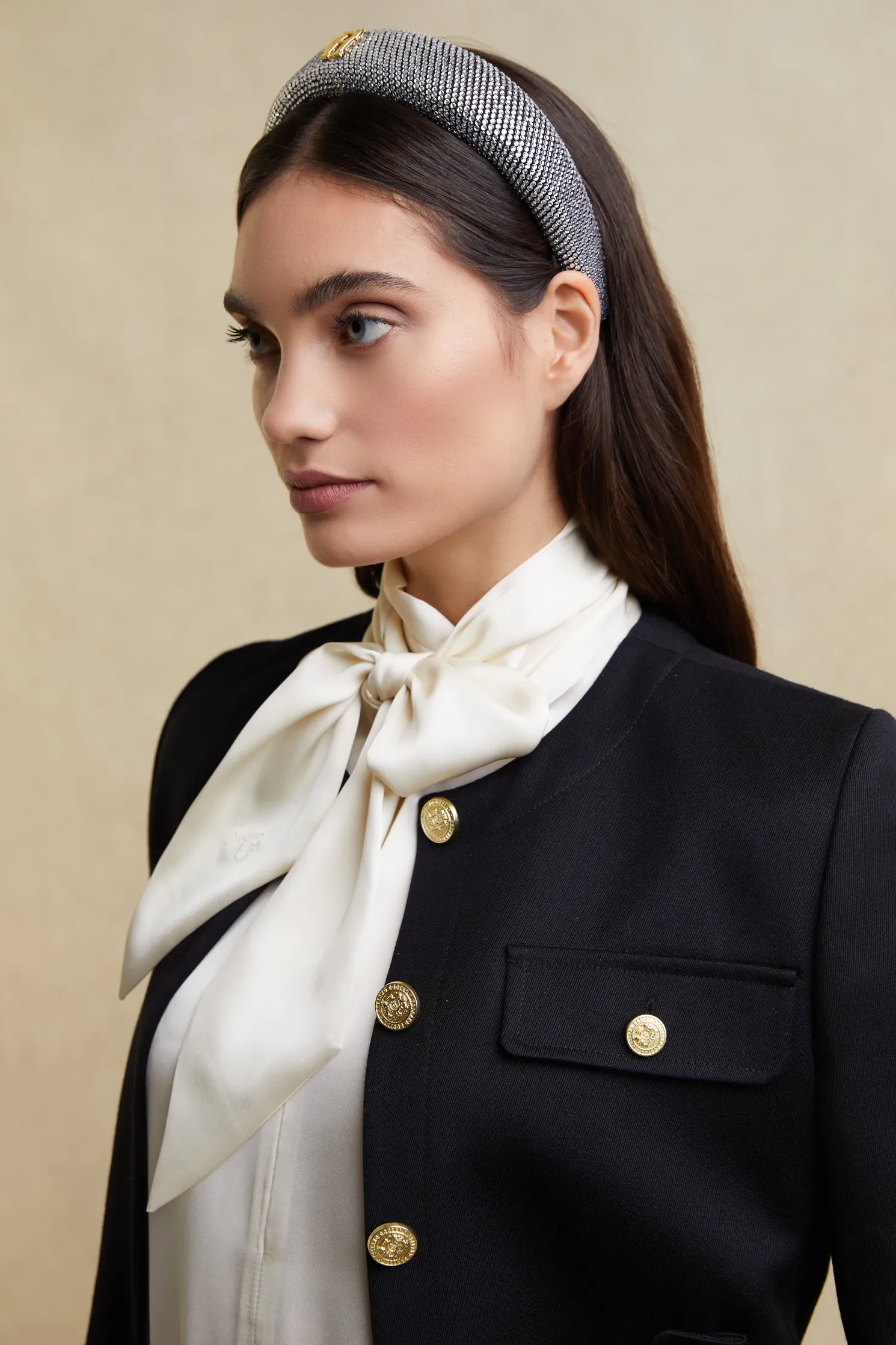 A luxurious accessory that adds a touch of sparkle to any outfit. Featuring our iconic branding with a dazzling crystal inlay, this headband shines with elegance. The wide band design offers both style and comfort, while the silver finish adds a sophisticated touch to complete your look. Perfect for elevating any outfit.